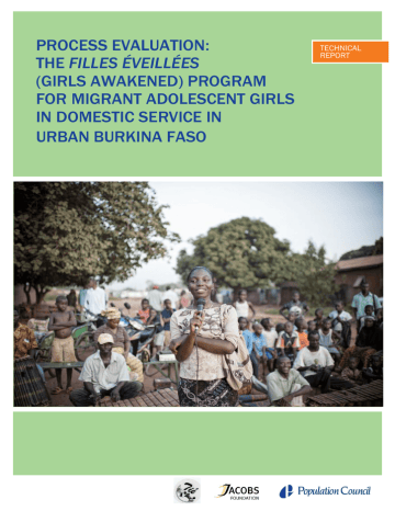 PROCESS EVALUATION: THE FILLES ÉVEILLÉES (GIRLS AWAKENED) PROGRAM FOR MIGRANT ADOLESCENT GIRLS IN DOMESTIC SERVICE IN URBAN BURKINA FASO TECHNICAL REPORT The Population Council confronts critical health and development issues—from stopping the spread of HIV to improving reproductive health and ensuring that young people lead full and productive lives. Through biomedical, social science, and public health research in 50 countries, we work with our partners to deliver solutions that lead to more effective policies, programs, and technologies that improve lives around the world. Established in 1952 and headquartered in New York, the Council is a nongovernmental, nonprofit organization governed by an international board of trustees. Population Council 01 BP 6250 Ouagadougou 01 Burkina Faso www.popcouncil.org Suggested citation: Leah Jarvis and Gisele Kabore. 2012. “Process Evaluation: The Filles Éveillées (Girls Awakened) Program for Migrant Adolescent Girls in Domestic Service in Urban Burkina Faso.” Ouagadougou: Population Council. Cover photo by Ollivier Girard, courtesy of the Population Council. © 2012. The Population Council, Inc. TABLE OF CONTENTS 1. Introduction................................................................................................................................ 1 1.1 Program Background ......................................................................................................... 1 1.2 Program Design and Objectives ........................................................................................ 2 1.3 Purpose of Evaluation........................................................................................................ 4 1.4 Evaluation Methodology .................................................................................................... 4 2. Findings of Evaluation ............................................................................................................... 6 2.1 Program Highlights ............................................................................................................ 6 2.2 Program Implementation .................................................................................................. 7 2.3 Program Structure .......................................................................................................... 11 2.4 Curriculum ....................................................................................................................... 14 2.6 Community Engagement ................................................................................................ 16 3. Recommendations and Subsequent Changes ..................................................................... 18 3.1 Program Implementation ............................................................................................... 18 3.2 Program Structure .......................................................................................................... 18 3.3 Curriculum ....................................................................................................................... 19 3.4 Community Engagement ................................................................................................ 21 4. Conclusion .............................................................................................................................. 21 References .................................................................................................................................... 23 Annex 1: Qualitative Data Collection Tools ................................................................................. 24 1.1 Guide de Discussion de Groupe avec les Mentors ....................................................... 24 1.2 Guide de Discussion de Groupe pour les Chargés de Programme au Niveau de Tié 26 1.3 Guide d’Entretien pour Membres de la Communauté ................................................. 28 1.4 Guide de Discussion de Groupe pour Filles qui ont Terminé le Programme .............. 29 1.5 Guide d’Entretien pour les Employeurs ......................................................................... 31 Annex 2: Monitoring and Evaluation Tools ................................................................................. 33 2.1 Canevas d’Appreciation des Sessions .......................................................................... 33 2.2 Tableau de Présence des Filles aux Sessions .............................................................. 35 2.3 Fiche Individuelle des Visites à Domicile ...................................................................... 37 2.4 Fiche de Supervision des Activités des Mentors .......................................................... 38 2.5 Canevas de Rapport Narratif des Associations ............................................................ 39 2.6 Canevas du Rapport des Enseignants sur l'Encadrement des Filles du Programme 40 1. INTRODUCTION The Population Council is a nongovernmental organization that conducts biomedical, social science, and public health research and disseminates evidence to shape more effective policies, programs, and technologies that improve lives around the world. The Council has been working in Burkina Faso since 1989 and has had an office in Burkina Faso since 1994. The Population Council has offices in 15 countries and has worked or currently works in more than 50 countries. The Poverty, Gender, and Youth program conducts research and programs with vulnerable populations such as adolescent girls. Asset-building programs focusing on vulnerable adolescent girls have been successfully piloted in India, Bangladesh, Ethiopia, Kenya, Uganda, and Guatemala, among others, and have been scaled up in almost all of these settings (Population Council, 2012a). 1.1 Program Background Burkina Faso has the tenth youngest population in the world, with 45.2 percent of the population below th