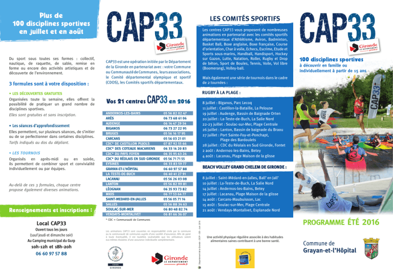 LES COMITÉS SPORTIFS 3 formules sont à votre disposition : • LES DÉCOUVERTES GRATUITES Organisées toute la semaine, elles offrent la possibilité de pratiquer un grand nombre de disciplines sportives. Elles sont gratuites et sans inscription. • Les séances d’approfondissement Elles permettent, sur plusieurs séances, de s’initier ou de se perfectionner dans certaines disciplines. Tarifs indiqués au dos du dépliant. • LES TOURNOIS Organisés en après-midi ou en soirée, ils permettent de combiner sport et convivialité individuellement ou par équipes. Au-delà de ces 3 formules, chaque centre propose également diverses animations. Local CAP33 Ouvert tous les jours (sauf jeudi et dimanche soir) Au Camping municipal du Gurp 10h-12h et 18h-20h 06 60 97 57 88 CAP33 est une opération initiée par le Département de la Gironde en partenariat avec : votre Commune ou Communauté de Communes, leurs associations, le Comité départemental olympique et sportif (CDOS), les Comités sportifs départementaux. à découvrir en famille ou individuellement à partir de 15 ans Mais également une série de tournois dans le cadre de 2 tournées : ANDERNOS-LES-BAINS ARÈS AUDENGE BIGANOS BRUGES CARCANS CDC* DE CASTILLON PUJOLS CDC* DES COTEAUX MACARIENS CDC* DU PAYS FOYEN CDC* DU RÉOLAIS EN SUD GIRONDE EYSINES GRAYAN-ET-L’HÔPITAL LA TESTE-DE-BUCH LACANAU LANTON LÉOGNAN MIOS SAINT-MEDARD-EN-JALLES SALLES SOULAC-SUR-MER VENDAYS-MONTALIVET 8 juillet : Biganos, Parc Lecoq 11 juillet : Castillon-la-Bataille, La Pelouse 19 juillet : Audenge, Bassin de Baignade Orten 20 juillet : La-Teste-de-Buch, La Salie Nord 22-23 juillet : Soulac-sur-Mer, Plage Centrale 26 juillet : Lanton, Bassin de baignade du Braou 27 juillet : Port Sainte-Foy-et-Ponchapt, Plage des Bardoulets 28 juillet : CDC du Réolais en Sud Gironde, Fontet 2 août : Andernos-les-Bains, Betey 4 août : Lacanau, Plage Maison de la glisse 05 56 82 02 47 06 73 68 61 06 06 14 47 29 54 06 73 27 22 95 05 56 16 17 95 05 56 03 21 01 07 87 92 55 66 06 33 14 20 83 06 35 95 63 26 05 56 71 71 55 06 33 83 59 77 06 60 97 57 88 06 40 41 27 91 05 56 26 03 08 05 56 82 99 81 06 35 93 73 82 06 77 53 64 77 05 56 05 71 14 05 56 88 34 63 06 80 48 82 74 06 81 66 36 07 * CDC = Communauté de Communes Les animations CAP33 sont couvertes en responsabilité civile par la commune ou la communauté de communes auprès d’une société d’assurance. Afin de parer à toute éventualité, il est toutefois souhaitable que les utilisateurs soient eux-mêmes titulaires d’une assurance individuelle complémentaire. BEACH VOLLEY GRAND CHELEM DE GIRONDE : 8 juillet : Saint-Médard-en-Jalles, Ball’ en Jall’ 10 juillet : La-Teste-de-Buch, La Salie Nord 14 juillet : Andernos-les-Bains, Betey 17 juillet : Lacanau, Plage Maison de la glisse 14 août : Carcans-Maubuisson, Lac 15 août : Soulac-sur-Mer, Plage Centrale 21 août : Vendays-Montalivet, Esplanade Nord Département de la Gironde – DCIP – CID – Juin 2016 Du sport sous toutes ses formes : collectif, nautique, de raquette, de sable, remise en forme ou encore des activités artistiques et de découverte de l’environnement. Les centres CAP33 vous proposent de nombreuses animations en partenariat avec les comités sportifs départementaux d’Athlétisme, Aviron, Badminton, Basket Ball, Boxe anglaise, Boxe française, Course d’orientation, Char à voile, Echecs, Escrime, Etude et Sports sous-marins, Handball, Handisport, Hockey sur Gazon, Lutte, Natation, Roller, Rugby et Drop de béton, Sport de Boules, Tennis, Voile, Vol libre (Boomerang), Volley-ball. PROGRAMME ÉTÉ 2016 Une activité physique régulière associée à des habitudes alimentaires saines contribuent à une bonne santé. Commune de Grayan-et-l’Hôpital CAP33 / Commune de Grayan-et-l’Hôpital - JUILLET/AOÛT 2016 - Pour les familles et les individuels de plus de 15 ans DÉCOUVERTES GRATUITES 10h-10h30 : Pilates - En face du Camping du Gurp 10h-12h et 18h-20h : Tennis de Table - Camping, Local CAP33 10h45-11h15 : Aéro Dance - En face du Camping du Gurp 11h30-12h15 : Cardio Boxe - En face du Camping du Gurp SÉANCES D’APPROFONDISSEMENT 20h30-22h : Djembe (du 11/07 au 29/08) - Camping, Local CAP33 TOURNOIS** 15h : Beach Soccer - Plage du Gurp. Gratuit 20h : Pétanque au chapeau - En face du Camping du Gurp. 2 € Street Basket - En face du Camping du Gurp. 2 € DÉCOUVERTES GRATUITES 10h-12h : Tennis de Table - Camping, Local CAP33 SÉANCES D’APPROFONDISSEMENT* 10h-11h : Cardio Boxe - En face du Camping du Gurp 10h30-11h : M oto Cross. 10 €/ adulte Club Moto Cross des Esteys, Grayan 11h15-12h15 : Step Cardio - En face du Camping du Gurp TOURNOIS** 15h : Beach Volley 2x2 - Plage du Gurp. Gratuit 20h : Foot sur herbe à 5 (à partir du 7/07) Stade A. Rabenne, Grayan. 10 € par équipe DÉCOUVERTES GRATUITES 19h-20h : Badminton - Gymnase, Grayan DÉCOUVERTES GRATUITES 10h-12h et 18h-20h : Tennis de Table - Camping, Local CAP33 SÉANCES D’APPROFONDISSEMENT* 10h-11h : Nordic Yoga (Mat) - En face du Camping du Gurp 11h15-12h15 : Aéro Dance - En face du Camping du Gurp SÉANCES D’APPROFONDISSEMENT 10-11h : Pilates 11h-12h 20: Tir à l`Arc - En face du Camping du Gurp. 3 € 11h15-12h15 : Aéro Dance 20h30-21h30 : Soirée Fit Your Body. 2 €. En face du Camping du Gurp (les 15, 29/07, 12 et 26/08) TOURNOIS** 15h : Beach Volley 3x3 - Plage du Gurp. Gratuit 20h : Q uilles finlandaises - En face du Camping du Gurp. 2 € Tournoi Beach Volley 2x2 - En face du Camping du Gurp. 2 € TOURNOIS** 15h : Beach Tennis - Plage du Gurp. Gratuit Pétanque - En face du Camping du Gurp. 2 € 18h : Tennis de Table - Camping, Local CAP33. 2 € 20h : Badminton - Gymnase, Grayan 2 € DÉCOUVERTES GRATUITES 10h-12h : Tennis de Table - Camping, Local CAP33 22h : Cinéma de plein air - Derrière les commerces du Gurp (du 6/07 au 24/08) Renseignements : 05 56 99 87 54 SÉANCES D’APPROFONDISSEMENT* 10h-11h : Pilates - En face du Camping du Gurp 1