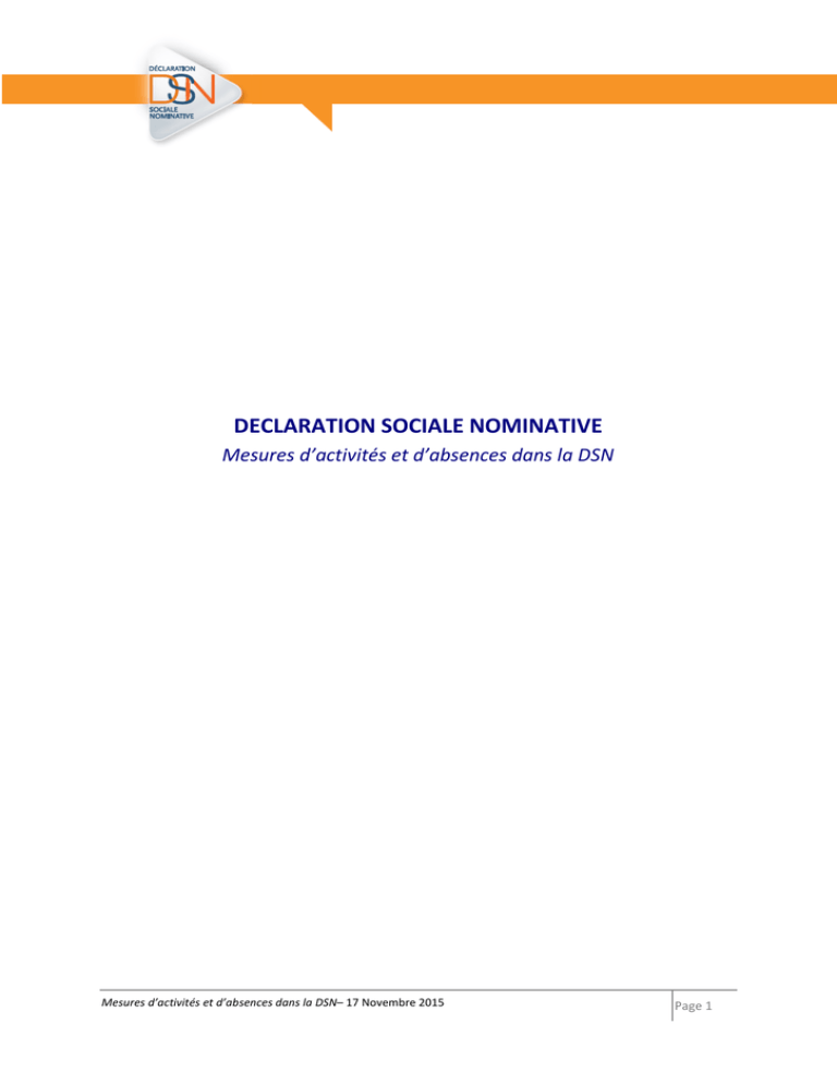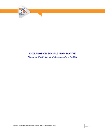 DECLARATION SOCIALE NOMINATIVE Mesures d’activités et d’absences dans la DSN Mesures d’activités et d’absences dans la DSN– 17 Novembre 2015 Page 1 Sommaire Préambule ............................................................................................................................................... 3 1. Les unités de mesure ....................................................................................................................... 3 1.2. 2. Modalités de valorisation des mesure de travail et d’absences ..................................................... 4 2.2. 3. Modalités déclaratives pour les unités mesurant des durées................................................. 4 Les mesures exprimées en heures et en jour .......................................................................... 4 2.2.1. Les mesures de nature conventionnelles ........................................................................ 4 2.2.2. Les mesures du processus de calcul de la paie ............................................................... 5 2.2.3. Unité de mesure applicables ........................................................................................... 6 2.2.4. Le travail Rémunéré ........................................................................................................ 6 2.2.5. La durée d’absences non rémunérées ............................................................................ 6 Exemples.......................................................................................................................................... 7 3.2. Le contrat est formulé avec une unité exprimant une durée ................................................. 7 3.2.1. Contrat dont l’unité est l’heure, temps plein sur base légale (35h) ............................... 7 3.2.2. Contrat dont l’unité est le jour, forfait annuel de 218 jours ........................................... 8 Mesures d’activités et d’absences dans la DSN– 17 Novembre 2015 Page 2 Préambule Ce document est établi pour les besoins de fonctionnement opérationnel de la Déclaration Sociale Nominative (DSN), sans qu’il n’emporte aucune conséquence sur le plan juridique au regard du droit positif Par ailleurs, les pratiques actuelles telles que mises en place et admises dans les formalités existantes ne sont pas remises en cause par la DSN qui ne change pas le droit et ses modes concrets d’application. La présente note vise à préciser l’ensemble des règles relatives aux mesures d’activités et d’absences en DSN. Cette note couvre aussi bien les valeurs contractuelles que les mesures d’activité et d’absences non rémunérées établies pour les besoins du processus de paie. Par nécessité, cette note précise également les règles afférentes aux unités de mesure. Le périmètre traité dans cette note est restreint aux quotités conventionnelles, mesures d’activités et absences mesurées en durée. Ainsi, ne sont pas traités ici les cas de salariés dont le travail est mesuré à la pige, à la vacation, ainsi que les salariés non concernés par une unité de mesure du travail (par exemple certains cadres dirigeants dont la mesure du travail n’est pas opérée par application du L. 3111-2 du Code du Travail). Si certaines particularités relatives à ces salariés, dont les quotités et mesures ne sont pas exprimées en durée, voire pas exprimées du tout, vous semblent porter un potentiel de simplification, une communication au GIP-MDS serait une contribution utile à la construction de la DSN. Une seconde note précisera les modalités de valorisation applicables aux salariés dont l’activité et/ou l’inactivité n’est pas mesurée par des notions de durée. 1. Les unités de mesure La DSN impose l’unicité de l’unité de mesure pour l’ensemble des mesures d’activités et d’absences non rémunérées. L’unité de mesure est à déclarer dans la rubrique S21.G00.40.011. Les valeurs possibles sont les suivantes : - Heure Journée Forfait heure Forfait jour Pige* Vacation* Salarié non concerné* Mesures d’activités et d’absences dans la DSN– 17 Novembre 2015 Page 3 * Ces unités de mesure ne sont pas traitées dans la présente note. Concernant les forfaits, jour ou heure, le terme forfait caractérise la modalité retenue par l’employeur et le salarié pour fixer les quotités conventionnelles, à savoir la quotité de travail de référence de l’entreprise pour la catégorie de salariés et la quotité de travail du contrat de travail. Pour ces deux unités, toutes les mesures déclarées sont exprimées en jours ou en heures, qu’elles soient d’ordre conventionnel ou qu’elles soient établies dans le cadre du processus de paie. Ainsi, si l’unité déclarée est le forfait jour, la quotité de travail du contrat de travail est un nombre de jours et ne doit surtout pas être un forfait. Par conséquence du choix de l’unité de mesure, les valeurs à renseigner en DSN ne sont pas les mêmes. 1.2. Modalités déclaratives pour les unités mesurant des durées Pour une unité exprimant une durée (Heure, Journée, Forfait heure, Forfait jour), les données suivantes doivent être renseignées : - S21.G00.40.012 Quotité de travail de référence de l’entreprise pour la catégorie de salarié (valeur supérieure ou égale à 0) S21.G00.40.013 Quotité de travail du contrat de travail (Valeur supérieure ou égale à 0) S21.G00.53.001 type 01 - Travail rémunéré S21.G00.53.001 type 02 - Durée d’absence non rémunérée (uniquement s’il existe une absence non rémunérée ou partiellement rémunérée). le type d’activité 03 - Durée non travaillée rémunérée n’est pas géré en Phase 2 et fera l’objet de consignes en Phase 3. Il n’est donc pas à renseigner Des exemples sont précisés dans les points traitant des modalités et règles de valorisation des mesure