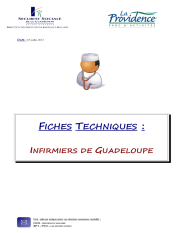 DIRECTION DES PRESTATIONS ASSURANCE MALADIE Date : 05 juillet 2013 FICHES TECHNIQUES : INFIRMIERS DE GUADELOUPE Une adresse unique pour vos dossiers assurance maladie : CGSS - ASSURANCE MALADIE BP 9 – 97181 – LES ABYMES CEDEX SOMMAIRE 1°) NOS COORDONNEES : ............................................................................................. 3 2°) FACTURATION : REGLES A RESPECTER ................................................................... 5 Fiche Technique n°1 :ELABORATION DES FLUX .......................................................................................................6 Fiche Technique n°2 :FACTURES ETBORDEREAUX............................................................................................... 10 Fiche Technique n°3 :FACTURATION LIEE A LACMU-Complémentaire............................................................ 11 Fiche Technique n°4 : FACTURATION LIEE A L’AIDE MEDICALE DE L’ETAT.......................................... 13 Fiche Technique n°5 :FACTURATION LIEE A L’ACCIDENT DU TRAVAIL ................................................... 14 Fiche Technique n°6 : CONDITIONNEMENT ET DEPOT .................................................................................... 15 Fiche Technique n°7 : RECYCLAGES ............................................................................................................................. 17 Fiche Technique n°8 : SUIVI DES REMBOURSEMENTS : www.ameli.fr .............................................................. 18 Fiche Technique n°9 :RECLAMATIONS ........................................................................................................................ 20 Fiche Technique n°10 :INDUS ........................................................................................................................................... 21 3°) RAPPEL DE LA REGLEMENTATION ....................................................................... 22 Fiche n° 1 :Les Dispositionsgénérales ................................................................................................................................ 23 Fiche n° 2 :Les frais de déplacement(Article 13 NGAP) .................................................................................................. 24 Fiche n° 3 : Les actes effectués la nuit ou le dimanche (Article 14 NGAP) .................................................................. 25 Fiche n° 4 :Les actes multiples au cours de la même séance(Chap. 2 Article5bis) ......................................................... 27 Fiche n° 6 :Les soins infirmiers de pratique courante et spécialisés (2ème partie - Titre XVI NGAP)......................... 28 Fiche n° 7 : La démarche de soins ifirmiers (Article 11 NGAP) ..................................................................................... 29 P. 2/29 1°) NOS COORDONNEES : P. 3/29 Le Responsable de l’unité Auxiliaires Médicaux reçoit sur rendez-vous. POUR TOUT CONTACT : Par téléphone aux numéros suivant : → Responsable de l’unité Nicole DOROTHEE - DAHOMAY : 05.90.23.99.47 (de 14 à 15h 30) → Animateur d’équipe Simone LATCHAN-ATHANASE : 05.90.23.97. (de 9 à 11h) → Secrétariat de la Direction de l’Assurance Maladie : - 05.90.23.98.13 - 05.90.23.98.14 -05.90.23.98.15 Par fax aux numéros suivant : → Unité Auxiliaires Médicaux : 05.90.23.98.28 ; → Secrétariat de la Direction de l’Assurance Maladie : 05.90.23.98.23. Par mail à l’adresse suivante : → [email protected] P. 4/29 2°) FACTURATION : REGLES A RESPECTER P. 5/29 Fiche technique n°1 : ELABORATION DES FLUX FICHE TECHNIQUE N° 1 Date : 13.09.2013 1- Saisie des données : Dans le cadre d’un flux Sesam sécurisé avec CPS et Carte Vitale, l’auxiliaire médical : 1- Sélectionne le bénéficiaire des soins parmi ceux présents sur la Carte ; 2- Saisit les données relatives à l'acte médical ou à la prestation (nature d'assurance, acte, tarif, exonération du ticket modérateur) ; 3- Indique le destinataire de règlement. Dans le cadre d’un flux Sesam en dégradé (ou non sécurisé) avec CPS sans Carte Vitale, l’auxiliaire médical : 1- Saisit les informations relatives à l’assuré par lecture de l’attestation papier ; 2- Saisit la cotation de l’acte, le montant des honoraires, le destinataire de règlement ; 3- Imprime une facture à signer par l’assuré et destinée à la CGSS. Ce type de flux est réalisé en cas : • de non présentation par l’assuré de sa carte vitale ; • de défaillance technique ; • d’absence, dans la carte vitale, d’ouverture de droits sur la part complémentaire CMU-C (joindre l’attestation papier) ; • d’absence, dans la carte vitale, d’une exonération (joindre l’attestation papier) ; • de recyclage des factures retournées par la CGSS (cf. fiche technique n°7). P. 6/29 2- Parallèlement au flux électronique, l’auxiliaire médical transmet à la CGSS dans un délai de 48 heures les documents suivants cf. fiche technique n° 2): Dans le cadre d’un flux Sesam sécurisé avec CPS et Carte Vitale, l’auxiliaire médical : Le bordereau récapitulatif ; La prescription médicale. Éventuellement le volet n°2 de la Démarche de Soins Infirmiers (DSI) et la demande d’accord préalable (lors de la première transmission). Dans le cadre d’un flux Sesam en dégradé (ou non sécurisé) avec CPS sans Carte Vitale, l’auxiliaire médical : Le bordereau récapitulatif ; La feuille de soin auxiliaire médical (e) intégralement complétée (S3129d) ; La prescription médicale. Éventuellement le volet n°2 de la DSI et la demande d’accord préalable ; L’attestation vitale du patient (facultatif). Attention : le circuit papier traditionnel ne doit être utilisé qu’en cas de dysfonctionnement de votre équipement informatique. Dans ce cas vous devez impérativement informer le responsable de l’unité Auxiliaires Médicaux et lui a