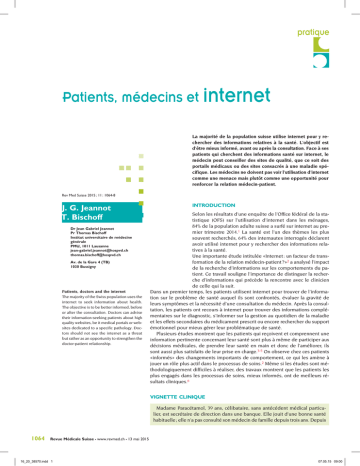 pratique Patients, médecins et internet La majorité de la population suisse utilise internet pour y rechercher des informations relatives à la santé. L’objectif est d’être mieux informé, avant ou après la consultation. Face à ses patients qui cherchent des informations santé sur internet, le médecin peut conseiller des sites de qualité, que ce soit des portails médicaux ou des sites consacrés à une maladie spécifique. Les médecins ne doivent pas voir l’utilisation d’internet comme une menace mais plutôt comme une opportunité pour renforcer la relation médecin-patient. Rev Med Suisse 2015 ; 11 : 1064-8 J. G. Jeannot T. Bischoff Dr Jean Gabriel Jeannot Pr Thomas Bischoff Institut universitaire de médecine générale PMU, 1011 Lausanne [email protected] [email protected] Av. de la Gare 4 (TB) 1030 Bussigny Patients, doctors and the internet The majority of the Swiss population uses the internet to seek information about health. The objective is to be better informed, before or after the consultation. Doctors can advise their information-seeking patients about high quality websites, be it medical portals or web sites dedicated to a specific pathology. Doctors should not see the internet as a threat but rather as an opportunity to strengthen the doctor-patient relationship. introduction Selon les résultats d’une enquête de l’Office fédéral de la statistique (OFS) sur l’utilisation d’internet dans les ménages, 84% de la population adulte suisse a surfé sur internet au premier trimestre 2014.1 La santé est l’un des thèmes les plus souvent recherchés, 64% des internautes interrogés déclarent avoir utilisé internet pour y rechercher des informations relatives à la santé. Une importante étude intitulée «Internet : un facteur de transformation de la relation médecin-patient ?»2 a analysé l’impact de la recherche d’informations sur les comportements du patient. Ce travail souligne l’importance de distinguer la recher che d’informations qui précède la rencontre avec le clinicien de celle qui la suit. Dans un premier temps, les patients utilisent internet pour trouver de l’information sur le problème de santé auquel ils sont confrontés, évaluer la gravité de leurs symptômes et la nécessité d’une consultation du médecin. Après la consultation, les patients ont recours à internet pour trouver des informations complémentaires sur le diagnostic, s’informer sur la gestion au quotidien de la maladie et les effets secondaires du médicament prescrit ou encore rechercher du support émotionnel pour mieux gérer leur problématique de santé. Plusieurs études montrent que les patients qui reçoivent et comprennent une information pertinente concernant leur santé sont plus à même de participer aux décisions médicales, de prendre leur santé en main et donc de l’améliorer, ils sont aussi plus satisfaits de leur prise en charge.3-5 On observe chez ces patients «informés» des changements importants de comportement, ce qui les amène à jouer un rôle plus actif dans le processus de soins.2 Même si les études sont méthodologiquement difficiles à réaliser, des travaux montrent que les patients les plus engagés dans les processus de soins, mieux informés, ont de meilleurs résultats cliniques.6 vignette clinique Madame Paracétamol, 39 ans, célibataire, sans antécédent médical particulier, est secrétaire de direction dans une banque. Elle jouit d’une bonne santé habituelle ; elle n’a pas consulté son médecin de famille depuis trois ans. Depuis 1064 Revue Médicale Suisse – www.revmed.ch – 13 mai 2015 16_20_38570.indd 1 07.05.15 09:00 trois semaines, elle souffre de céphalées, sourdes, occipitales, se manifestant plutôt vers la fin de la journée. Comme les symptômes ne s’améliorent pas avec un com primé de paracétamol, elle cherche des renseignements sur internet. En tapant «mal de tête» sur Google, elle tombe parmi les cinq premiers sites sur un hôpital universitaire qui lui propose sa consultation des céphalées, sur un site de traitements alternatifs (cryothérapie, noyaux de cerises, huile essentielle de lavande), sur un site de santé commercial et un autre qui parle des indications pour l’IRM. Cet exemple illustre la réalité des recherches effectuées par les patients, ils utilisent le plus souvent des moteurs de recherche7 et sont confrontés à des résultats de qualité variable.8,9 pendant la consultation Même si cela n’est à l’évidence pas imaginable pour tous nos patients, des sites internet peuvent être parfois conseil lés pendant la consultation. Les études montrent qu’entre 40 et 80% de l’information délivrée par le personnel médical sont immédiatement oubliés par les patients, et près de la moitié de l’information retenue est incorrecte.10 Les raisons principales sont : 1. la terminologie médicale employée. 2.Le mode de délivrance de l’information (oral et non écrit). 3.Le niveau d’éducation des patients ou leurs attentes spécifiques. La conséquence de cet état de fait est que de l’information cruciale est instantanément perdue au moment du transfert clinicien-patient, ce qui a des conséquences lour des sur la capacité du patient à prendre en charge sa santé. Pourquoi se priver de rediriger un patient qui réfléchit à cesser son tabagisme sur stop-tabac.ch ou de montrer à un jeune patient chez qui vient d’être diagnostiquée une hypothyroïdie, la page de Planète santé consacrée à cette maladie ? Vous voulez expliquer à un patient ce qu’est l’arthrose ou l’ostéoporose ? Conseillez-lui le site de la Ligue suisse contre le rhumatisme, il comprendra ainsi mieux le rôle qu’il peut lui-même jouer face à ces affections. conseiller des sites internet à ses patients Vu la qualité extrêmement variable des sites destinés au grand public,11 les experts de la santé que sont les médecins doivent jouer un rô
