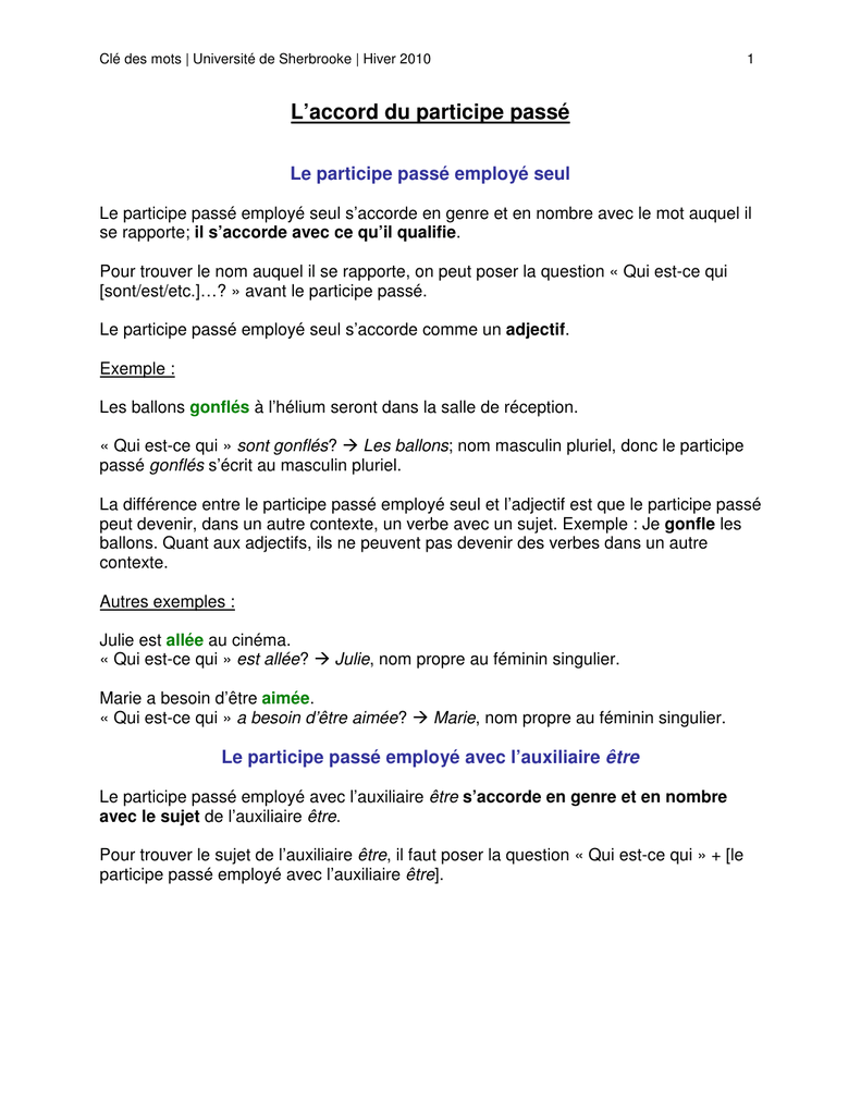 Clé des mots | Université de Sherbrooke | Hiver 2010 1 L’accord du participe passé Le participe passé employé seul Le participe passé employé seul s’accorde en genre et en nombre avec le mot auquel il se rapporte; il s’accorde avec ce qu’il qualifie. Pour trouver le nom auquel il se rapporte, on peut poser la question « Qui est-ce qui [sont/est/etc.]…? » avant le participe passé. Le participe passé employé seul s’accorde comme un adjectif. Exemple : Les ballons gonflés à l’hélium seront dans la salle de réception. Les ballons; nom masculin pluriel, donc le participe « Qui est-ce qui » sont gonflés? passé gonflés s’écrit au masculin pluriel. La différence entre le participe passé employé seul et l’adjectif est que le participe passé peut devenir, dans un autre contexte, un verbe avec un sujet. Exemple : Je gonfle les ballons. Quant aux adjectifs, ils ne peuvent pas devenir des verbes dans un autre contexte. Autres exemples : Julie est allée au cinéma. « Qui est-ce qui » est allée? Julie, nom propre au féminin singulier. Marie a besoin d’être aimée. « Qui est-ce qui » a besoin d’être aimée? Marie, nom propre au féminin singulier. Le participe passé employé avec l’auxiliaire être Le participe passé employé avec l’auxiliaire être s’accorde en genre et en nombre avec le sujet de l’auxiliaire être. Pour trouver le sujet de l’auxiliaire être, il faut poser la question « Qui est-ce qui » + [le participe passé employé avec l’auxiliaire être]. 2 Exemple : Manon est allée souper au restaurant hier. Manon; nom propre au féminin singulier, donc le « Qui est-ce qui » est allée? participe passé allée s’accorde au féminin singulier. Le participe passé employé avec l’auxiliaire avoir Le participe passé employé avec l’auxiliaire avoir s’accorde avec le complément d’objet direct (COD) de l’auxiliaire avoir, s’il est placé devant celui ci. Si le COD est placé après l’auxiliaire, le participe passé ne s’accorde pas. Pour connaître le COD dans la phrase, il faut poser la question qui? ou quoi? après le verbe. Si la question ne se pose pas, il faut peut être poser la question à qui? ou à quoi? après le verbe. Dans ce cas, on trouve le complément d’objet indirect (COI). Cependant, on n’accorde jamais, en aucun temps, le participe passé avec le COI. Exemples : Les documents qu’elle a achetés ont été remis aux participants. Elle a acheté « quoi? » qu’, étant un pronom qui remplace documents, et qui est le COD placé devant le verbe. Alors, on accorde le participe passé au masculin pluriel. Ces étudiants, elle les a rencontrés hier. Elle a rencontré « qui? » les, étant un pronom qui remplace étudiants et qui est un COD placé devant le verbe. Alors, on accorde le participe passé au masculin pluriel. Elle a pensé aux travaux pratiques qu’elle devait faire cette semaine. Elle a pensé « à quoi? » aux (à les) travaux pratiques. Il s’agit du COI, donc on n’accorde pas le participe passé. Elle a mangé une soupe et des biscottes pour dîner. Elle a mangé « quoi? » une soupe et des biscottes. Il s’agit bel et bien d’un COD, mais puisqu’il est placé après le verbe, le participe passé demeure invariable. 3 À quelle heure avez-vous mangé? Il n’y a pas de COD ni de COI, Vous avez mangé qui? quoi? à quoi? de quoi? puisque la bonne question à poser est quand?. On y retrouve plutôt un complément circonstanciel de temps. Le participe passé des verbes pronominaux Voici des exemples de verbes pronominaux : se demander, se sauver, se souhaiter, se souvenir, se voir, etc. Il s’agit de verbes précédés d’un pronom personnel indéfini. Il faut savoir qu’il existe deux types de verbes pronominaux : 1- Les verbes essentiellement pronominaux 2- Les verbes occasionnellement pronominaux Les verbes essentiellement pronominaux ne peuvent fonctionner sans le pronom, comme se souvenir et s’absenter. On ne peut pas dire « j’absente » ou « je souviens ». Le participe passé des verbes essentiellement pronominaux s’accorde toujours avec le sujet du verbe. Exemple : Amélie s’est absentée pour la journée. « Qui est-ce qui » s’est absenté? Amélie; nom propre au féminin pluriel, donc on accorde le participe passé au féminin pluriel. Les verbes occasionnellement pronominaux peuvent ou non être précédés d’un pronom, comme s’insulter ou insulter, reconnaître ou se reconnaître et acheter ou s’acheter. On peut à la fois dire « j’insulte mon ami » et « ils se sont insultés ». Pour savoir si on doit accorder le participe passé des verbes occasionnellement pronominaux, il faut suivre les étapes suivantes : Étape 1 Repérer le complément d’objet direct (COD), s’il y en a un, en posant la question qui? ou quoi? après le verbe. Exemple : Nous nous sommes vite aperçus du désastre. Nous nous sommes vite aperçus quoi? qui? COD. Il faut donc passer à l’étape 2. Aucune réponse possible. Il n’y a pas de Dans le cas contraire, lorsqu’il y a un COD, on doit accorder le participe passé en suivant la même règle qu’avec le participe passé employé avec l’auxiliaire avoir : 4 si le COD est placé après le verbe, on n’accorde pas le participe passé, comme avec l’auxiliaire avoir. Si le COD est placé avant le verbe, on accorde le participe passé. Étape 2 Déterminer si le pronom personnel se (nous dans ce cas-ci) a la fonction de COD ou de COI (complément d’objet indirect). Pour trouver le COI, il faut poser la question de qui? de quoi?, à qui?, ou à quoi? après le verbe. Pour réaliser cette étape, il faut transformer l’auxiliaire être en auxiliaire avoir. Cela permet de voir si l’accord doit se faire comme avec l’auxiliaire avoir ou non. Exemple : Nous avons aperçu qui? quoi? pas un COD. Aucune réponse possible. Le pronom personnel n’est Nous avons aperçu de qui? de quoi? à qui? 