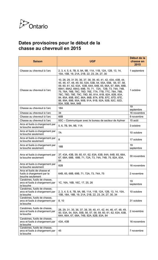 Dates provisoires pour le début de la chasse au chevreuil en 2015 Saison Chasse au chevreuil à l’arc Chasse au chevreuil à l’arc UGF 2, 3, 4, 5, 6, 7B, 8, 9A, 9B, 11A, 11B, 12A, 12B, 13, 14, 15A, 15B, 19, 21A, 21B, 22, 23, 24, 27, 30 10, 28, 29, 31 35, 36, 37, 38, 39, 40, 41, 42, 43A, 43B, 44, 45, 46, 47, 48, 49, 50, 53A, 53B, 54, 55A, 55B, 56, 57, 58, 59, 60, 61, 62, 63A, 63B, 64A, 64B, 65, 66A, 67, 68A, 68B, 69A1, 69A2, 69A3, 69B, 70, 71, 72A, 72B, 73, 74A, 74B, 75, 76A, 76B, 76C, 76D, 76E, 77A, 77B, 77C, 78A, 78B, 78C, 78D, 78E, 79C, 79D, 80, 81A, 81B, 82A, 82B, 83A, 84, 85A, 85B, 85C, 86A, 86B, 87A, 87B, 87C, 87D, 87E, 88, 89A, 89B, 90A, 90B, 91A, 91B, 92A, 92B, 92C, 92D, 93A, 93B, 94A, 94B Début de la chasse en 2015 1 septembre 1 octobre Chasse au chevreuil à l’arc 18A Chasse au chevreuil à l’arc Chasse au chevreuil à l’arc Chasse au chevreuil à l’arc Arcs et fusils à chargement par la bouche seulement 34 66B 93C – Communiquer avec le bureau de secteur de Aylmer 19 septembre 16 novembre 9 novembre 15 août 5, 6, 7B, 9A, 9B, 11A 3 octobre Arcs et fusils à chargement par la bouche seulement 7A 10 octobre Arcs et fusils à chargement par la bouche seulement 8 17 octobre Arcs et fusils à chargement par la bouche seulement 18B 19 septembre Arcs et fusils à chargement par la bouche seulement Arcs et fusils à chargement par la bouche seulement Arcs et fusils de chasse et fusils à chargement par la bouche seulement Carabines, fusils de chasse, arcs et fusils à chargement par la bouche Carabines, fusils de chasse, arcs et fusils à chargement par la bouche Carabines, fusils de chasse, arcs et fusils à chargement par la bouche Carabines, fusils de chasse, arcs et fusils à chargement par la bouche Carabines, fusils de chasse, arcs et fusils à chargement par la bouche Carabines, fusils de chasse, arcs et fusils à chargement par la bouche 37, 43A, 43B, 59, 60, 61, 62, 63A, 63B, 64A, 64B, 65, 66A, 67, 68A, 68B, 69B, 71, 72A, 73, 74A, 74B, 75, 82A, 83A, 84 30 novembre 82B 16 novembre 64B, 65, 68B, 69B, 71, 72A, 73, 74A, 75 2 novembre 1C, 16A, 16B, 16C, 17, 25, 26 19 septembre 2, 3, 4, 5, 6, 7B, 9A, 9B, 11A, 11B, 12A, 12B, 13, 14, 15A, 15B, 18A, 18B, 19, 21A, 21B, 22, 23, 24, 27, 30, 34 10 octobre 8, 10 31 octobre 28, 29, 31, 35, 36, 37, 38, 39, 40, 41, 42, 44, 46, 47, 48, 49, 50, 53A, 54, 55A, 55B, 56, 57, 58, 59, 60, 61, 62, 63A, 63B, 64A, 66A, 67, 68A, 74B, 82A, 82B, 83A, 84 2 novembre 43A, 43B 16 novembre 45 7 novembre