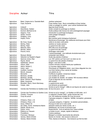 Discipline Auteur Agriculture Agriculture Agriculture Agriculture Agriculture Agriculture Agriculture Agriculture Agriculture Agriculture Agriculture Agriculture Agriculture Agriculture Agriculture Agriculture Agriculture Agriculture Agriculture Alimentation Alimentation Alimentation Alimentation Alimentation Alimentation Alimentation Alimentation Alimentation Alimentation Alimentation Alimentation Alimentation Alimentation Alimentation Alimentation Alimentation Alimentation Alimentation Alimentation Alimentation Alimentation Alimentation Alimentation Alimentation Alimentation Alimentation Alimentation Titre Batut, Virgine de la / Danielle Marti Caya, Suzanne Jardiner autrement Fines herbes Caya : fleurs comestibles et fines herbes Créer un potager en carrés : pour cultiver facilement des Collectif légumes toute l'année Deschênes, Gaétan Guide complet du jardinage au Québec Dumont, Bertrand et al. Guide pratique des travaux de votre aménagement paysager Gagnon, Yves Introduction au jardinage écologique Gerbe, Vincent Votre potager biologique Hodgson, Larry Annuelles Hopes, Fiona Mon premier jardin biologique facilement Semences et bouturage : les meilleures techniques pour faire Mc Clure, Susan naître la vie dans votre jardin McHoy, Peter Jardiner en toutes saisons McHoy, Peter Le grand livre des roses Meloche, Marc 500 p'tits trucs de jardinage Mondor, Albert Le grand livre des vivaces Pavord, Anna Aménagez votre jardin L'autocompostage : une méthode révolutionnaire pour Renaud, Michel composter sans efforts Sélection du Reader's Digest Guide des plantes d'intérieur Spencer-Jones, Rae Les 1001 jardins qu'il faut avoir vus dans sa vie Squire, David Le grand livre des plantes d'intérieur Apfeldorfer, Gérard Maigrir, c'est dans la tête Arbour, Réal Cuisine chinoise vraiment facile pour québécois Atkins, Robert C. Le nouveau régime Atkins Aubry, Jean Chroniques du VINgtième siècle : pour mieux déguster les vins Audibert, Caroline Les fines herbes et leur carnet de recettes Benoit, Jacques Les plaisirs du vin Bernardin Confitures et gelées: conserves maison Bertrand, Janette Les recettes de Janette Bertrand, Janette Les recettes de Janette : en cadeau 165 nouveaux délices Bizier, Richard / Roch Nadeau Fruits et légumes de nos marchés Blake, Susannah 500 entrées Bluestein, Barry / Kevin Morrissey La gastronomie santé Carper, Jean Les aliments qui guérissent Qu'est-ce qu'on mange? : Mille et une façons de varier la cuisine Cercles des Fermières du Québec (Les) de tous les jours, vol.1 Cercles des Fermières du Québec (Les) Qu'est-ce qu'on mange? : Le Québec en 820 plats, vol.3 Chartier, François La sélection Chartier 2003 : guide d'achat des vins Coup de pouce Les 150 meilleures recettes de Coup de pouce 4 groupes sanguins, 4 régimes : fertilité, conception, grossesse D'Adamo, Peter J. Dr et bébé D'Adamo, Peter J. Dr 4 groupes sanguins, 4 régimes : la solution personnalisée… Davis, William Dr Pourquoi le blé nuit à votre santé De Celles, Annik / Andréanne Martin Desserts santé pour dents sucrés, vol. 1 Delisle, Nicole et al… Diabétiques, les sucres et pourquoi pas! Dufour, Anne Supermarché : trucs et astuces pour mieux acheter Éditions du Trécarré La boîte à lunch : simple, rapide et délicieux Fioreditions Cuisine asiatique Francoeur, Monique Mangez! La lumière rayonnante des aliments Gareau, Marie-Christie Épices du monde : des saveurs à découvrir Gareau, Marie-Christie Thés, tisanes et infusions. Ces boissons qui font du bien Discipline Auteur Titre Alimentation Alimentation Alimentation Manger sainement…pour bien se porter Brûleurs de graisses : programme d'alimentation… La santé, c'est bon, vol. 2 : recettes et cuisine santé Alimentation Alimentation Gauthier-Urwyler, Jacqueline Grillparzer, Marion Guénette, Madeleine et Lise Guevremont, Guylaine / Marie-Claude Lortie Khandjian, Sylvie Alimentation Lagacé, Jacqueline Alimentation Alimentation Alimentation Alimentation Alimentation Alimentation Alimentation Alimentation Alimentation Alimentation Alimentation Alimentation Alimentation Alimentation Alimentation Alimentation Lagacé, Jacqueline Lambert-Lagacé, Louise Lambert-Lagacé, Louise / Josée Thibodeau Lambert-Lagacé, Louise / Michelle Laflamme Larocque, Maurice Laurendeau, Hélène / Brigitte Coutu Lewis, Sara Ligue internationale La Leche Lynas, Jacqui Martin, Isabelle Monette, Solange Montignac, Michel Parenti, Marco Pinard, Daniel Plante, Colombe Postma, Michiel Revel, Guénaël Alimentation Alimentation Alimentation Alimentation Alimentation Alimentation Alimentation Alimentation Alimentation Alimentation Arts Arts Arts Arts Arts Arts Arts Arts Arts Arts Arts Arts Arts Arts Arts Arts Rivas, Paul, Dr / E.A. Tremblay Robitaille, Louis / Odette Frigon Sanyo Saury, Alain St-Amour, Milly Starenkyj, Danièle Suzanne, Nathalie Tremblay, Yvon / Frances Boyte Tulasne, Patricia / Anne-Marie Roy Vago, Karen / Lucy Degrémont Baldassari, Anne et al. Beaucarne, Julos Bouchard, Jacqueline Caron, Louis Chapleau, Serge Chapleau, Serge Chapleau, Serge Chapleau, Serge Chapleau, Serge Collectif Collectif Constantino, Maria Conte, Michel Croteau, André Debicki, Jacek De Turenne, Solange Auzias Alimentation Mangez : un livre antirégime,prominceur, progourmandise Fruits d'ici et d'ailleurs: des saveurs et des couleurs Comment j'ai vaincu la douleur et l'inflammation chronique par l'alimentation Cuisiner pour vaincre la douleur et l'inflammation chronique : recettes Ménopause, nutrition et santé Au menu des 65 ans et plus Bons gras, mauvais gras Maigrir par la motivation L'alimentation durant la grossesse Préparer et cuisiner à l'avance L'art de l'allaitement maternel Cuisine pour un cœur en santé Les aliments qui font maigrir Dictionnaire encyclopédique des aliments Je mange donc je maigris! L'art de couper le fromage Pinardises : recettes et propos culinaires Maigrir facilement en mangeant santé Délicieux sushis L