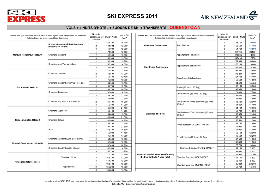 SKI EXPRESS 2011 VOLS + 4 NUITS D'HOTEL + 3 JOURS DE SKI + TRANSFERTS Tarif en XPF, par personne, pour un forfait 4 nuits, 3 jours Pass SKI (incluant les transferts hotel/pistes de ski et les remontées mécaniques) Chambre Standard - Prix de lancement (disponibilité limitée) Mercure Resort Queenstown Chambre Standard Chambre avec Vue sur le Lac Chambre standard Chambre Standard avec Vue sur le Lac Copthorne Lakefront Chambre Supérieure Chambre Sup avec Vue sur le Lac Chambre Supérieure Rydges Lakeland Resort Chambre Deluxe Suite Chambre Standard (Juin, Sept et Oct) Novotel Queenstown Lakeside Chambre Standard (Juillet et Aout) Chambre d'Hotel Kingsgate Hotel Terraces Appartement Nbre de personne par Forfait 4 Nuits chambre 1 168 794 2 139 894 3 149 094 1 174 394 2 153 994 3 151 394 1 180 994 2 157 394 3 155 494 1 171 494 2 152 594 3 150 194 1 176 294 2 154 994 3 151 794 1 181 794 2 157 694 3 153 794 1 189 994 2 161 794 3 156 394 1 185 294 2 159 494 3 154 894 1 186 694 2 160 094 3 155 194 1 191 394 2 162 494 3 156 994 1 175 594 2 154 594 3 152 894 1 187 494 2 160 594 3 156 794 1 171 194 2 152 394 3 149 394 1 163 794 2 156 294 3 153 894 Nuit + Ski Sup * QUEENSTOWN Tarif en XPF, par personne, pour un forfait 4 nuits, 3 jours Pass SKI (incluant les transferts hotel/pistes de ski et les remontées mécaniques) 16 700 12 700 Millennium Queenstown Run of House 12 300 18 500 Appartement 1 chambre 13 600 13 000 19 900 14 300 13 400 Blue Peaks Apartments Appartement 2 chambres 17 700 13 000 12 400 Appartement 3 chambres 18 900 13 600 12 800 Studio (25 June - 30 Sep) 20 300 14 300 One Bedroom (25 June - 30 Sep) 13 300 22 300 Two Bedroom / One Bathroom (25 June 30 Sep) 15 300 14 000 21 100 14 700 13 600 Breakfree The Point Two Bedroom / Two Bathroom (25 June 30 Sep) 21 500 14 900 13 600 Three Bedroom (25 June - 30 Sep) 22 600 15 500 14 100 17 900 Four Bedroom (25 June - 30 Sep) 13 300 12 900 20 900 Chambre Standard 01JUIN-31AOUT 14 800 13 900 17 700 13 000 Heartland Hotel Queenstown (formerly the Scenic Circle A-Line Hotel) Chambre Standard 01SEP-30SEP 12 300 15 800 13 900 Chambre avec Vue 01JUIN-31AOUT Nbre de personne par Forfait 4 Nuits chambre 1 183 194 2 158 594 3 154 794 1 181194 2 157394 3 149494 1 222 894 2 178 294 3 163 394 4 155 894 3 175 294 4 164 794 5 158 594 6 154 494 1 162 194 2 147 894 1 171 694 2 152 694 2 156 094 3 148 594 4 144 894 5 144 194 2 158 794 3 150 394 4 146 194 4 150 594 5 147 194 6 144 994 7 144 994 6 152 194 7 149 594 8 147 594 9 146 894 1 175 794 2 154 194 3 151 094 1 189 994 2 161 794 3 156 394 1 185 894 2 159 794 13 300 Les tarifs sont en XPF, TTC, par personne. Ils sont corrects à la date d'impression. Susceptible de modification sans préavis en raison de la fluctuation des tx de change, soumis à conditions Tél : 540.747 - Email : [email protected] Nuit + Ski Sup * 20 600 14 400 13 500 20100 14200 12200 30 600 19 400 15 700 13 800 18 600 16 100 14 500 13 400 15 500 11 800 17 700 13 000 13 900 12 000 11 100 10 900 14 600 12 400 11 400 12 500 11 600 11 100 11 000 12 900 12 200 11 800 11 500 10 600 5 300 4 400 14 200 7 200 5 800 23 300 16 400 SKI EXPRESS 2011 VOLS + 4 NUITS D'HOTEL + 3 JOURS DE SKI + TRANSFERTS Tarif en XPF, par personne, pour un forfait 4 nuits, 3 jours Pass SKI (incluant les transferts hotel/pistes de ski et les remontées mécaniques) Deluxe Room Deluxe Lakeview Room Studio Suite - 1 Bedroom - Non Lakeview Studio Lakeview Suite The Heritage Queenstown Two Bedroom Studio Suite (2x Interconnecting Studio Suite) Two Bedroom Lakeview Studio Suite (2x Interconnecting Studio Suite) Three Bedroom Villa Three Bedroom Lakeview Villa Superior Room - 2 DBLB or King with Spa (01 July-15 October) Sofitel Queenstown Executive Room with Spa (01 July-15 October) Sofitel Suite with Spa (01 July-15 October) Nbre de personne par Forfait 4 Nuits chambre 1 183 894 2 148 694 3 145 794 1 206 194 2 169 894 3 162 594 1 214 494 2 173 994 3 165 394 1 236 494 2 185 094 3 165 394 1 252 794 2 193 194 3 173 394 4 163 394 5 160 394 1 280 294 2 206 994 3 167 094 4 170 294 5 168 194 4 171 894 5 164 194 6 159 094 4 178 394 5 169 394 6 163 394 1 275 694 2 204 594 1 329 494 2 231 494 3 212 394 1 382 794 2 258 194 Nuit + Ski Sup * 20 800 14 600 13 600 26 300 17 300 15 500 28 500 18 300 16 100 34 000 21 100 16 100 38 100 23 200 18 200 15 700 14 900 44 900 26 600 20 400 17 400 16 900 17 800 15 900 14 600 19 400 17 200 15 700 43 700 26 000 57 200 32 700 24 500 70 500 39 300 QUEENSTOWN Tarif en XPF, par personne, pour un forfait 4 nuits, 3 jours Pass SKI (incluant les transferts hotel/pistes de ski et les remontées mécaniques) Rees Lakeview Room (Hotel Style Room) June & Aug Rees Lakeview Room (Hotel Style Room) July Rees Lakeview Room (Hotel Style Room) 1st Sep - 31 Oct One Bedroom Lakeview Apartment June & Aug One Bedroom Lakeview Apartment July One Bedroom Lakeview Apartment 1st Sep - 31st Oct. Two Bedroom Lakeview Apartment June & Aug The Rees Two Bedroom Lakeview Apartment July Two Bedroom Lakeview Apartment 1st Sep - 31st Oct Three Bedroom Lakeview Apartment June & Aug Three Bedroom Lakeview Apartment July Three Bedroom Lakeview Apartment 1st Sep - 31st Oct Nbre de personne par Forfait 4 Nuits chambre 187994 1 2 160 794 1 196 494 2 165 094 1 229 994 2 181 794 1 216 094 2 174 894 1 227 194 2 180 494 1 269 094 2 201 394 1 242 394 2 187 994 3 169 894 4 160 794 1 259 394 2 196 494 3 175 594 4 165 094 1 310 994 2 222 294 3 192 794 4 177 994 3 182 494 4 170 294 5 162 894 6 158 094 3 189 894 4 175 894 5 167 494 6 161 994 3 213 194 4 193 294 5 181 394 6 173 394 Les tarifs sont en XPF, TTC, par personne. Ils sont corrects à la date d'impression. Susceptible de modification sans préavis en raison de la fluctuation des tx de change, soumis à conditions Tél : 540.747 - Email : [email protected] Nuit + Ski Sup * 23300 15 800 23 900 16 100 32 300 20 300 28 800 18 600 31 600 19 900 42 100 25 200 35 400 21 800 17 300 15 000 39 600 23 900 18 700 16 100 52 600 30 400 23 000 19 300 20 40