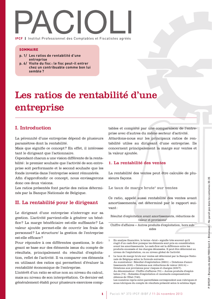 IPCF | Institut Professionnel des Comptables et Fiscalistes agréés SOMMAIRE p. 1/ Les ratios de rentabilité d’une entreprise p. 6/ Visite du fisc : le fisc peut-il entrer chez un contribuable comme bon lui semble ? Les ratios de rentabilité d’une entreprise La pérennité d’une entreprise dépend de plusieurs paramètres dont la rentabilité. Mais que signifie ce concept ? En effet, il intéresse tant le dirigeant que l’actionnaire. Cependant chacun a une vision différente de la rentabilité : le premier souhaite que l’activité de son entreprise soit performante et le second souhaite que les fonds investis dans l’entreprise soient rémunérés. Afin d’approfondir ce concept, nous envisagerons donc ces deux visions. Les ratios présentés font partie des ratios déterminés par la Banque Nationale de Belgique. tables et complété par une comparaison de l’entreprise avec d’autres du même secteur d’activité. Attardons-nous sur les principaux ratios de rentabilité utiles au dirigeant d’une entreprise. Ils concernent principalement la marge sur ventes et la valeur ajoutée. 1. La rentabilité des ventes La rentabilité des ventes peut être calculée de plusieurs façons. Le taux de marge brute1 sur ventes Ce ratio, appelé aussi rentabilité des ventes avant amortissements, est déterminé par le rapport suivant : II. La rentabilité pour le dirigeant Le dirigeant d’une entreprise s’interroge sur sa gestion. L’activité parvient-elle à générer un bénéfice ? La marge bénéficiaire est-elle suffisante ? La valeur ajoutée permet-elle de couvrir les frais de personnel ? La structure/ la gestion de l’entreprise est-elle efficace ? Pour répondre à ces différentes questions, le dirigeant se base sur des éléments issus du compte de résultats, principalement du résultat d’exploitation, reflet de l’activité. Il va comparer ces éléments en utilisant des ratios qui permettent d’évaluer la rentabilité économique de l’entreprise. L’intérêt d’un ratio se situe non au niveau du calcul, mais au niveau de son interprétation. Ce dernier est généralement établi pour plusieurs exercices comp1 Résultat d’exploitation avant amortissements, réductions de valeur et provisions2 Chiffre d’affaires + Autres produits d’exploitation, hors subsides 1 En analyse financière, le terme « brut » signifie très souvent qu’il s’agit d’un cash-flow puisque les éléments sont pris en considération avant les amortissements. Le cash-flow est la différence entre les produits encaissés et les charges décaissées. Il peut être déterminé au niveau de l’exploitation, ou au niveau global de l’activité. 2 Le taux de marge brute sur ventes est déterminé par la Banque Nationale de Belgique selon la formule suivante. Au numérateur : Résultat d’exploitation (9901) + Dotations d’amortissements (630) + Dotations aux réductions de valeur (631/4) + Dotations aux provisions pour risques et charges (635/7). Au dénominateur : Chiffre d’affaires (70) + Autres produits d’exploitation (74) – Subsides d’exploitation et montants compensatoires obtenus de l’Etat (740). Les numéros repris entre parenthèses correspondent aux rubriques et sous-rubriques du compte de résultats présenté selon le schéma légal. P a c i ol i N ° 373 I P C F - B I B F / 11-24 novembre 2013 P 309339 – Bureau de dépôt 9000 Gent X – Bimensuel – Ne paraît pas dans les semaines 30-35 I. Introduction Le numérateur peut être rapproché de la notion d’EBITDA (Earning Before Interest, Taxes, Depreciation and Amortization). Ce ratio est utile à toute entreprise car il permet de déterminer le cash-flow dégagé par l’exploitation courante. Un taux de 20 % signifie que, pour un chiffre d’affaires réalisé de 100€, l’entreprise dégage un cash-flow de 20€ sur base des éléments d’exploitation. Ce cash dégagé doit permettre de couvrir non seulement les amortissements, mais aussi les charges financières et exceptionnelles. Le taux de marge brute sur ventes traduit l’impact de la politique de l’entreprise au niveau de la production, de la gestion des stocks, de son personnel, mais aussi de sa politique commerciale. La valeur de ce ratio sera inférieure à celle du taux de valeur ajoutée, puisqu’il tient compte des frais de personnel. Pour pouvoir interpréter ce ratio, il faut le comparer avec celui des entreprises du même secteur d’activité. Cette comparaison est intéressante puisque ce ratio n’est pas influencé par la politique d’amortissement, propre à chaque entreprise. 2. La valeur ajoutée La valeur ajoutée est un indicateur pertinent pour déterminer la performance globale d’une entreprise. Au niveau macro-économique, elle correspond à la différence entre la valeur de la production et les consommations intermédiaires5. Au niveau d’une entreprise, la valeur de la production correspond aux éléments suivants : – la production vendue → le chiffre d’affaires ; – la production stockée → la variation de stock des produits finis, des produits en cours de fabrication et des commandes en cours d’exécution. Cela se justifie par le fait que ces éléments en stock seront vendus dans un délai plus ou moins long ; – la production immobilisée → la production réalisée par l’entreprise pour son propre usage et correspondant à des immobilisations corporelles ou incorporelles. Les consommations intermédiaires, quant à elles, comprennent : Le taux de marge nette3 sur ventes Ce taux, appelé également rentabilité des ventes après amortissements, est calculé comme suit : Résultat d’exploitation Chiffre d’affaires + Autres produits d’exploitation, hors subsides Contrairement au ratio précédent, le taux de marge nette sur ventes est influencé par la politique d’amortissement de l’entreprise. Il tient compte des amortissements, des réductions de valeur et des provisions. C’