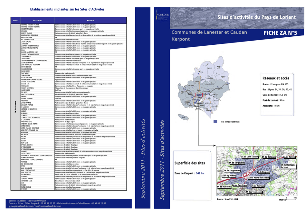 Etablissements implantés sur les Sites d'Activités ARMAND THIERRY FEMME ARMAND THIERRY HOMME ARMOR MAUGES ARTAREL AUBERT FRANCE AUX PLAISIRS DES SENS BOUTIQUE SNCF BUT EXPLOITATION CACHE-CACHE CADOON'S CAMAIEU INTERNATIONAL CAROLL INTERNATIONAL CASA CASINO CAFETERIA SNC CASINO STATION-SERVICE CELIO FRANCE CHAUSSPORT CIE EUROPEENNE DE LA CHAUSSURE CLAIRE'S FRANCE CLUB BOUYGUES TELECOM COEUR DE BLE COURIR FRANCE CREME CAFE CREP'N PIZZ CUIR CENTER DELTA LINGERIE DISTRIBUTION CASINO FRANCE ESPACE PANTALONS ESPACE SFR EUROCASH EUROPE SERVICES FABIO SALSA FEU VERT FOLIES DOUCES SA FORMUL FRANCK PROVOST FREDUCCI GAME FRANCE GUEGUIN PICAUD H. LANDERS HISTOIRE DE SENTEURS JOFRATI KEGINIEU LA HALLE LA HALLE AUX VETEMENTS LE CAENNAIS MAC DONALD'S MADAME DIANE ADAM MARC ORIAN MARIE-FRANCE BOUTIQUE MAXI TOYS FFRANCE SA MDF HOM MIR AUTO NOCIBE OBAIBI OKAIDI OLLY GAN OPTICAL CENTER OPTIQUE 2000 OPTIQUE MONNIER ORANGE PASTA COSTA PHARMACIE DU CTRE CIAL GEANT LANESTER PICARD SURGELES POINT LIBRE SERVICE LA POSTE PROMOD RLD DECORATION RYVIA SARL BURGIARD SARL L'ESCARCELLE SARL REGLYSS SAS ANDRIEU SEPHORA SERGENT MAJOR SOPRESSO SARL TATI TECKBA TEXTO FRANCE VETIR SA Sites d'activités du Pays de Lorient A CTIVITE Commerce de détail d'habillement en magasin spécialisé Commerce de détail d'habillement en magasin spécialisé Commerce de détail d'articles de sport en magasin spécialisé Commerce de détail de journaux et papeterie en magasin spécialisé Autres commerces de détail spécialisés divers Commerce de détail de parfumerie et de produits de beauté en magasin spécialisé NR Commerce de détail de meubles Commerce de détail d'habillement en magasin spécialisé Commerce de détail d'ordinateurs, d'unités périphériques et de logiciels en magasin spécialisé Commerce de détail d'habillement en magasin spécialisé Commerce de détail d'habillement en magasin spécialisé Commerce de détail d'habillement en magasin spécialisé NR Commerce de détail de carburants en magasin spécialisé Commerce de détail d'habillement en magasin spécialisé Commerce de détail d'articles de sport en magasin spécialisé Commerce de détail de la chaussure Commerce de détail d'articles d'horlogerie et de bijouterie en magasin spécialisé Commerce de détail de matériels de télécommunication en magasin spécialisé NR Commerce de détail d'articles de sport en magasin spécialisé NR Restauration traditionnelle Commerce de détail d'autres équipements du foyer Commerce de détail d'habillement en magasin spécialisé Hypermarchés Commerce de détail d'habillement en magasin spécialisé Commerce de détail de matériels de télécommunication en magasin spécialisé Commerce de détail de biens d'occasion en magasin Réparation de chaussures et d'articles en cuir Coiffure Commerce de détail d'équipements automobiles Autres commerces de détail spécialisés divers Commerce de détail d'habillement en magasin spécialisé Coiffure Commerce de détail d'habillement en magasin spécialisé Autres commerces de détail spécialisés divers Commerce de détail d'articles d'horlogerie et de bijouterie en magasin spécialisé Commerce de détail d'habillement en magasin spécialisé NR Commerce de détail d'habillement en magasin spécialisé Commerce de détail de meubles Commerce de détail d'habillement en magasin spécialisé Commerce de détail d'habillement en magasin spécialisé Restauration traditionnelle Restauration de type rapide Commerce de détail de journaux et papeterie en magasin spécialisé Commerce de détail d'articles d'horlogerie et de bijouterie en magasin spécialisé Commerce de détail d'habillement en magasin spécialisé Commerce de détail de jeux et jouets en magasin spécialisé Commerce de détail d'habillement en magasin spécialisé Entretien et réparation de véhicules automobiles légers Commerce de détail de parfumerie et de produits de beauté en magasin spécialisé Commerce de détail d'habillement en magasin spécialisé Commerce de détail d'habillement en magasin spécialisé Commerce de détail d'habillement en magasin spécialisé Commerces de détail d'optique Commerces de détail d'optique Commerces de détail d'optique Commerce de détail de matériels de télécommunication en magasin spécialisé Restauration traditionnelle Commerce de détail de produits pharmaceutiques en magasin spécialisé Commerce de détail de produits surgelés NR Commerce de détail d'habillement en magasin spécialisé Commerce de détail de meubles Commerce de détail d'habillement en magasin spécialisé Commerce de détail d'articles d'horlogerie et de bijouterie en magasin spécialisé Commerce de détail de maroquinerie et d'articles de voyage Commerce de détail de pain, pâtisserie et confiserie en magasin spécialisé Fabrication de cacao, chocolat et de produits de confiserie Commerce de détail de parfumerie et de produits de beauté en magasin spécialisé Commerce de détail d'habillement en magasin spécialisé Blanchisserie-teinturerie de détail Commerce de détail d'habillement en magasin spécialisé Autres commerces de détail alimentaires en magasin spécialisé Commerce de détail de la chaussure Commerce de détail d'habillement en magasin spécialisé Sources : AudéLor - www.audelor.com Contacts Fiche : Gilles Poupard : 02.97.88.05.23 - Christine Boissonnot-Delachienne : 02.97.88.22.46 [email protected] / [email protected] Communes de Lanester et Caudan Kerpont FICHE ZA N°5 Réseaux et accès Route : Echangeur RN 165 Bus : Lignes 24, 31, 30, 40, 42 Gare de Lorient : 4,5 km Port de Lorient : 9 km Aéroport : 11 km Septembre 2011 - Sites d'activités E NS E IGNE Septembre 2011 - Sites d'activités Z A d e Ke r rou s Z ONE Les zones d'activités ZA de Lann Sevelin Superficie des sites ZA de Kerloïc ZA de Kergoussel ZA de Montagne du Salut ZA de Kergouaran Zone de Kerpont : 348 ha. ZA de Bellevue ZI de Kerpont ZA de Ty Pichon ZA des Hauts de Kerrous
