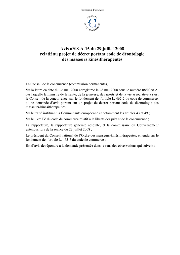 RÉPUBLIQUE FRANÇAISE Avis n°08-A-15 du 29 juillet 2008 relatif au projet de décret portant code de déontologie des masseurs kinésithérapeutes Le Conseil de la concurrence (commission permanente), Vu la lettre en date du 26 mai 2008 enregistrée le 28 mai 2008 sous le numéro 08/0058 A, par laquelle la ministre de la santé, de la jeunesse, des sports et de la vie associative a saisi le Conseil de la concurrence, sur le fondement de l’article L. 462-2 du code de commerce, d’une demande d’avis portant sur un projet de décret portant code de déontologie des masseurs-kinésithérapeutes ; Vu le traité instituant la Communauté européenne et notamment les articles 43 et 49 ; Vu le livre IV du code de commerce relatif à la liberté des prix et de la concurrence ; La rapporteure, la rapporteure générale adjointe, et la commissaire du Gouvernement entendus lors de la séance du 22 juillet 2008 ; Le président du Conseil national de l’Ordre des masseurs-kinésithérapeutes, entendu sur le fondement de l’article L. 463-7 du code de commerce ; Est d’avis de répondre à la demande présentée dans le sens des observations qui suivent : I. 1. Le contexte Le Conseil est saisi sur le fondement de l’article L. 462-2 du code de commerce aux termes duquel : «Le Conseil est obligatoirement consulté (…) sur tout projet de texte réglementaire instituant un régime nouveau ayant directement pour effet : 1° de soumettre l’exercice d’une profession ou l’accès à un marché à des restrictions quantitatives (…)». A. LE CADRE JURIDIQUE 1. UN ORDRE PROFESSIONNEL DE CONSTITUTION RÉCENTE 2. Aux termes de l’article L. 4321-1 du code de la santé publique: «la profession de masseur kinésithérapeute consiste à pratiquer habituellement le massage et la gymnastique médicale. La définition du massage et de la gymnastique médicale est précisée par un décret en Conseil d’État, après avis de l’Académie nationale de médecine». L’article R. 4321-3 du même code définit le massage comme : « (…) toute manœuvre externe, réalisée sur les tissus, dans un but thérapeutique ou non, de façon manuelle ou par l’intermédiaire d’appareils autres que les appareils d’électrothérapie, avec ou sans l’aide de produits, qui comporte une mobilisation ou une stimulation méthodique, mécanique ou réflexe de ces tissus ». Ces dispositions réservent le monopole du massage aux masseurs-kinésithérapeutes. 3. Le code de la santé publique distingue les professions médicales, les professions de la pharmacie et les auxiliaires médicaux, dont les masseurs-kinésithérapeutes. Ces professions sont constituées en ordres professionnels. 4. C’est la loi n° 2004-806 du 9 août 2004 relative à la politique de santé publique qui a établi l’Ordre des masseurs-kinésithérapeutes (articles L. 4321-13 et suivants du code de la santé publique). 2. LE PROJET DE CODE DE DÉONTOLOGIE CONSTITUE UN REGIME NOUVEAU 5. En vertu des dispositions de l’article L. 4321-21 du code de la santé publique, un décret en Conseil d’Etat, pris après avis du Conseil national de l’Ordre des masseurs-kinésithérapeutes, fixe les règles du code de déontologie de la profession. Le même article prévoit que ces dispositions se limitent aux droits et devoirs déontologiques et éthiques de la profession à l’égard de ses membres, des autres professionnels de santé et à l’égard des patients. 2 6. Le projet de décret soumis au Conseil de la concurrence portant code de déontologie des masseurs-kinésithérapeutes, s’articule toutefois, à l’instar des autres codes de déontologie des professions médicales, pharmaceutiques et paramédicales, autour de quatre axes : devoirs généraux des masseurs-kinésithérapeutes ; devoirs envers les patients ; devoirs envers les confrères et les membres des autres professions de santé ; exercice de la profession. 7. S’agissant de l’exercice de la profession, ce projet de code prévoit un certain nombre de règles nouvelles qui, en l’absence de réglementation préexistante, limite l’exercice de la profession. 8. Comme l’a rappelé toutefois le Conseil de la concurrence dans ses avis, du 27 mars 1990 et du 15 février 1994 portant sur les projets de décret des codes de déontologie des pharmaciens, le Conseil ne peut se prononcer sur les dispositions réglementaires autorisées par la loi lorsqu'il est saisi d'une demande d'avis sur un projet de décret : «le code de déontologie, ayant un caractère règlementaire, ne peut déroger à ses dispositions législatives et notamment à celles qui, propres à l’exercice de la pharmacie, contiennent ou autorisent expressément des exceptions aux principes de la liberté commerciale et de la libre concurrence. Le présent avis ne peut donc porter que sur les questions qui relèvent de la compétence du pouvoir règlementaire; il doit tenir compte de l’existence des limitations de concurrence de nature législative qui sont propres à la profession considérée. Il s’agit, notamment, des articles L. 551 et L. 552 du code de la santé publique relatifs à la publicité et de l’article L. 377-3 du code de la sécurité sociale concernant les ristournes». 9. En ce qui concerne le présent projet de code de déontologie, les dispositions des articles R. 4321-66, R. 4321-124 et R. 4321-125, qui prévoient une limitation de la publicité sont permises par les dispositions de l’article L. 5122 du code de la santé publique. Il en est de même s’agissant des dispositions de l’article R. 4321-71 qui interdisent au masseur-kinésithérapeute de pratiquer toute ristourne en argent ou en nature à quelque personne que ce soit, dès lors que l’interdiction des ristournes est également prévue à l’article L. 377-3 du code de la sécurité sociale. B. LES MODALITES D’EXERCICE DE LA PROFESSION 1. UN EXERCICE MAJORITAIREMENT LIBÉRAL ET INDIVIDUEL 10. En 2008, le nom