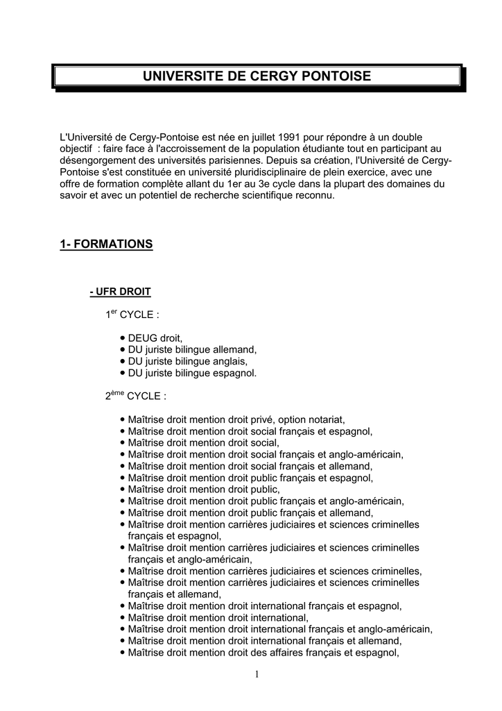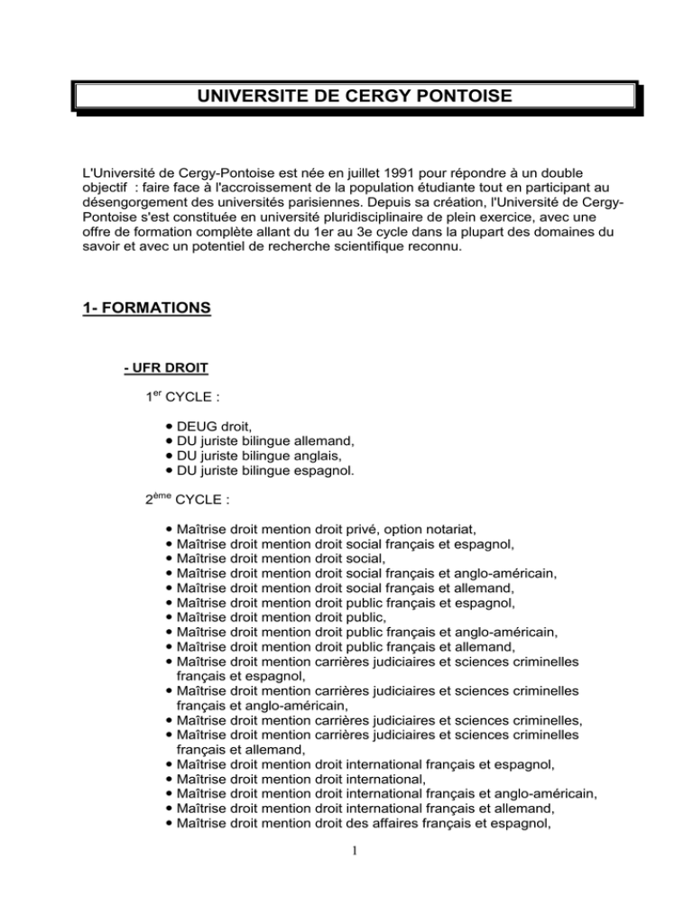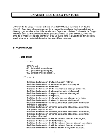 UNIVERSITE DE CERGY PONTOISE L'Université de Cergy-Pontoise est née en juillet 1991 pour répondre à un double objectif : faire face à l'accroissement de la population étudiante tout en participant au désengorgement des universités parisiennes. Depuis sa création, l'Université de CergyPontoise s'est constituée en université pluridisciplinaire de plein exercice, avec une offre de formation complète allant du 1er au 3e cycle dans la plupart des domaines du savoir et avec un potentiel de recherche scientifique reconnu. 1- FORMATIONS - UFR DROIT 1er CYCLE : DEUG droit, DU juriste bilingue allemand, DU juriste bilingue anglais, DU juriste bilingue espagnol. 2ème CYCLE : Maîtrise droit mention droit privé, option notariat, Maîtrise droit mention droit social français et espagnol, Maîtrise droit mention droit social, Maîtrise droit mention droit social français et anglo-américain, Maîtrise droit mention droit social français et allemand, Maîtrise droit mention droit public français et espagnol, Maîtrise droit mention droit public, Maîtrise droit mention droit public français et anglo-américain, Maîtrise droit mention droit public français et allemand, Maîtrise droit mention carrières judiciaires et sciences criminelles français et espagnol, Maîtrise droit mention carrières judiciaires et sciences criminelles français et anglo-américain, Maîtrise droit mention carrières judiciaires et sciences criminelles, Maîtrise droit mention carrières judiciaires et sciences criminelles français et allemand, Maîtrise droit mention droit international français et espagnol, Maîtrise droit mention droit international, Maîtrise droit mention droit international français et anglo-américain, Maîtrise droit mention droit international français et allemand, Maîtrise droit mention droit des affaires français et espagnol, 1 Maîtrise droit mention droit des affaires, Maîtrise droit mention droit des affaires français et anglo-américain, Maîtrise droit mention droit des affaires français et allemand, Maîtrise droit mention droit privé français et allemand, Maîtrise droit mention droit privé français et espagnol, Maîtrise droit mention droit privé français et anglo-américain, Maîtrise droit mention droit privé, Licence droit, Licence droit français et anglo-américain, Licence droit français et allemand, Licence droit français et espagnol. 3ème CYCLE : DEA droit des relations économiques et sociales, DEA droit privé, DEA droit public, théories et pratiques, DESS juriste conseil d'entreprise (DJCE), Institut d'études judiciaires, INSTITUT D'ETUDES JUDICIAIRES. - UFR économie et gestion 1er CYCLE : DEUG économie et gestion, DEUG banque, finances et assurance (1ere année IUP), DEUG économie et gestion spécialité anglais, DEUG mathématiques appliquées et sciences sociales (MASS 2ème CYCLE : Licence et maîtrise banque, finances et assurance (2e et 3e années d'IUP), Licence et maîtrise de sciences économiques, option économie et gestion de l'entreprise, analyse et politique économique, Licence et maîtrise d'économétrie, Licence et maîtrise de sciences de gestion (MSG). 3ème CYCLE : DEA économie internationale, modélisation et analyse des politiques économiques, DEA finance et assurance 2003/2004, DEA histoire de la pensée économique, DEA marché et politiques publiques, DESS gestion financière des collectivités locales et des administrations décentralisées, DESS ingénierie économique, DESS gestion des instruments financiers, DESS sciences de gestion management et NTIC. 2 - UFR Langues 1er CYCLE : Descriptif des enseignements de LEA, DEUG lettres et langues étrangères appliquées (LEA) spécialité anglaisallemand ou anglais-espagnol, DEUG lettres et langues mention langues, littératures et civilisation étrangères spécialité anglais, DEUG 2e année lettres et langues mention langues, littératures et civilisation étrangères spécialité espagnol, DEUG 1ere année lettres et langues mention langues, littératures et civilisation étrangères spécialité espagnol, DEUG 2e année lettres et langues mention langues, littératures et civilisation étrangères spécialité allemand, DEUG 1ere année lettres et langues mention langues, littératures et civilisation étrangères spécialité allemand. 2ème CYCLE : Licence de langues, littératures et civilisation étrangères (LLCE) spécialité anglais, Licence langues étrangères appliquées (LEA) spécialité anglaisallemand ou anglais-espagnol, Licence professionnelle attaché technico-commercial bilingue (ATCOB), Licence professionnelle gestion internationale du tourisme et du patrimoine (GITP), Licence professionnelle responsable export trilingue, Maîtrise de LEA, mention commerce international spécialité anglaisallemand ou anglais-espagnol, Préparation au Capes d'espagnol, Maîtrise LLCE spécialité espagnol, Maîtrise LLCE spécialité anglais, Maîtrise LLCE spécialité allemand, Licence de langues, littératures et civilisation étrangères (LLCE) spécialité espagnol, Licence de langues, littératures et civilisation étrangères (LLCE) spécialité allemand. 3ème CYCLE : DESS commerce et management franco-allemand (CMFA), DEA civilisations contemporaines comparées (CCC) : sociétés et cultures occidentales face à la mondialisation, DESS langues et commerce international (LCI), "marchés anglo-saxons, ibérique et latino-americains", DESS Langues et Commerce International (LCI), mention : "marchés anglo-saxons et germaniques", DESS traducteur juridique spécialisé 3 DESS langues et commerce international (LCI). - UFR Lettres et sciences humaines 1er CYCLE : DAEU A, DEUG lettres modernes option communication, DEUG sciences humaines et sociales mention histoire, DEUG sciences humaines et sociales mention géographie, DEUG Lettres modernes. 2ème CYCLE : DU ateliers d'été de Cergy-Pontoise, Licence lettres modernes mention français langue ét