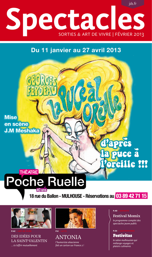 soit dit des journal en passant jds.fr L'obsession de l'année. Le bretzel. Sorties & Art de vivre | février 2013 Du 11 janvier au 27 avril 2013 Mise en scène J.M Meshaka ’ ’ d’apres la puce a l’oreille !!! 18 rue du Ballon - MULHOUSE - Réservations au 03 89 42 71 15 p.40 → enfants Festival Momix le programme complet des spectacles jeune public p.42 → art de vivre p.8 → actu des idées pour la saint-valentin antonia ... à s’offrir mutuellement l’humoriste alsacienne fait un carton sur France 2 ! p.54 → gastronomie Festivitas le salon mulhousien qui mélange voyages et plaisirs culinaires 2 jds.fr 3 Sommaire .fr journal des Spectacles n°250 → février 2013 6Actu 14Expositions 23MusiqueS 25spectacles 35Enfants 40 momix : le programme 42 art de vivre 50gastronomie 59manifestations 62 ski & montagne 64 formation et emploi 68concerts 77Cinéma 80pÊle-mÊle 81 soit dit en passant 82 c’est dans l’air → Spectacles célèbre son 250ème numéro ! Voilà 250 mois d’affilée que l’on vous donne de bon coeur tous les bons plans sorties de la région, ainsi que des idées de loisirs et de shopping, ou que l’on vous livre des interviews d’artistes de passage ou de figures locales. A raison de onze numéros par an, cela fait plus de 20 ans que ça dure... L’occasion pour nous de vous remercier de votre fidélité, sur l’ensemble du territoire haut-rhinois, de Ribeauvillé à Saint-Louis, de Wittenheim à Bartenheim, de Colmar à Thann. Quant au contenu de ce 250ème numéro, en ce mois de février, place évidemment aux festivités du Carnaval, de Mulhouse à Bâle. Retrouvez également le programme complet des spectacles proposés durant Momix à Kingersheim dans nos pages « Enfants », ainsi qu’un focus sur le salon Festivitas à Mulhouse, qui réunit les plaisirs du voyage et les bonheurs du vin et de la cuisine. Enfin, découvrez Antonia de Rendinger, humoriste alsacienne qui cartonne dans l’émission « On ne demande qu’à en rire » sur France 2 et nos idées cadeaux pour la Saint-Valentin. Bonne lecture les amoureux ! Les P’tits Amis du JDS p.6 → actu p.8 → Actu p.40 → enfants p.54 → gastronomie Parés pour le Carnaval Antonia sur France 2 momix : le programme Festivitas Comme chaque année, au coeur de l’hiver, les célébrations du Carnaval reviennent pour toujours plus de folie ! L’humoriste alsacienne Antonia de Rendinger crée le buzz dans On ne demande qu’à en rire. Et c’est mérité ! Le programme complet des spectacles, pour vous y retrouver et sélectionner ce que vous allez voir avec vos chérubins. Un salon qui fait le pari d’allier gastronomie et voyages ? C’est Festivitas, au Parc Expo de Mulhouse. © EastWest Imaging - Fotolia.com p.42 → art de vivre La célébration des amoureux On ne vous apprend rien, le 14 février, c’est la SaintValentin. Les célibataires peuvent donc zapper la rubrique, les autres, retrouvez nos pages spéciales dédiées à ce moment romantique. Retrouvez le jds sur : jds.fr & sur smartphone (appli JDS Android & Apple) jds.fr jds.fr .fr l'Agenda Alsace www.jds.fr tous les jours, l'agenda complet et exhaustif des sorties et des loisirs en Alsace Retrouver le Journal des Spectacles sur tous les supports Web - Appli. mobile - tablette (Android & Apple) www.jds.fr 5 © Voyant - Fotolia.com l’Actu Le roi du Carnaval de Bâle veille au bon déroulement de la fête Parés pour Carnaval déluge de confettis dans la région L e carnaval reste un événement populaire incontournable du calendrier rhénan. Défilés, masques, confettis et Guggamusik sont comme chaque année au programme, à Mulhouse, Bâle et de nombreuses autres villes du secteur. Par Mike Obri en maître. La majorité des carnavals démarrent après le mercredi des cendres, celui de Bâle débute toujours une semaine plus tard et avec une grande exactitude, qui caractérise d’ailleurs nos amis Suisses : ainsi, tout commence à quatre heures du matin précises, le lundi 18 février, avec la fameuse cérémonie du Morgenstreich. Une foule compacte se masse dans les rues étroites de la ville, malgré l’heure franchement hostile aux adeptes de la grasse matinée... Les cloches sonnent et c’est parti pour un immense défilé aux lampions et lanternes décorées. Toutes les lumières de la ville Cette année, le Carnaval de Mulhouse fête en grandes pompes sont éteintes pour l’occasion. Le spectacle est impressionses 60 années d’existence. 60 ans de liesse, de masques et de nant... et possède son lot de poésie, avec ces ombres et ces défilés sonores dans les rues... un bel anniversaire qui sera célélumières tamisées qui se faufilent dans Bâle. L’après-midi, place bré comme il se doit en centre-ville, durant le week-end du 15 à la cavalcade et ses 12 000 parau 17 février. La fête rassemblera ticipants... Bâle n’est pas le plus des milliers de carnavaliers venus grand carnaval de Suisse pour de toute la France, mais aussi Une liesse populaire qui séduit les rien. Et une fois les festivités terd’Allemagne et de Suisse - des enfants et les parents minées... on recommence deux programmes d’échanges de chars jours durant ! Nouveau défilé le et de fanfares ayant été mis en mercredi après-midi, concert de place ces dernières années. Le Guggemusik le mardi soir, cavalcade des enfants, expos, ou carnaval de Mulhouse se décline en plusieurs animations : la encore « Gässle » (déambulations improvisées dans les rues, parade illuminée du samedi soir sur le thème de l’Espace, « Naravec tambours)... ne ratez pas cette manifestation d’ampleur à ragonia », suivie d’une soirée dansante et un concert exclusif quelques dizaines de kilomètres de chez nous à peine ! du groupe Collectif Métissé, le traditionnel défilé du dimanche après-midi avec ses chars décorés et ses ensembles musicaux... Sans oublier le carnaval des enfants « Kid’s Carnavalia », le samedi dès 14h, av
