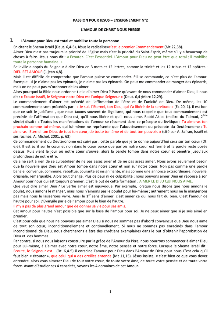 PASSION POUR JESUS – ENSEIGNEMENT N°2 L’AMOUR DE CHRIST NOUS PRESSE I. L’Amour pour Dieu est total et mobilise toute la personne En citant le Shema Israël (Deut. 6,4-5), Jésus le radicalise=c’est le premier Commandement (Mt 22,38). Aimer Dieu n’est pas toujours la priorité de l’Eglise mais c’est la priorité du Saint-Esprit, même s’il y a beaucoup de choses à faire. Jésus nous dit : « Ecoutez. C’est l’essentiel. L’Amour pour Dieu ne peut être que total ; il mobilise toute la personne humaine. » Belleville a appris du Seigneur à dire Dieu en 3 mots et 12 lettres, comme la trinité et les 12 tribus et 12 apôtres : DIEU EST AMOUR (1 jean 4,8). Mais il est difficile de comprendre que l’amour puisse se commander. S’il se commande, ce n’est plus de l’amour. Exemple : si je n’aime pas les épinards, je n’aime pas les épinards. On peut me commander de manger des épinards, mais on ne peut pas m’ordonner de les aimer. Alors pourquoi la Bible nous ordonne-t-elle d’aimer Dieu ? Parce qu’avant de nous commander d’aimer Dieu, il nous dit : « Ecoute Israël, le Seigneur notre Dieu est l’unique Seigneur » (Deut. 6,4 ;Marc 12,29). Le commandement d’aimer est précédé de l’affirmation de l’être et de l’unicité de Dieu. De même, les 10 commandements sont précédés par : « Je suis l’Eternel, ton Dieu, qui t’a libéré de la servitude » (Ex 20, 1). Il est bon que ce soit le judaïsme , que nous taxons souvent de légalisme, qui nous rappelle que tout commandement est précédé de l’affirmation que Dieu est, qu’Il nous libère et qu’Il nous aime. Rabbi Akiba (maître du Talmud, 2 ème siècle) disait : « Toutes les manifestations de l’amour se résument dans ce précepte du lévitique : Tu aimeras ton prochain comme toi-même, qui lui-même ne représente que l’aboutissement du précepte du Deutéronome : Tu aimeras l’Eternel ton Dieu, de tout ton cœur, de toute ton âme et de tout ton pouvoir. » (cité par A. Safran, Israël et ses racines, A. Michel, 2001, p. 63). Ce commandement du Deutéronome est suivi par : cette parole que je te donne aujourd’hui sera sur ton cœur (Dt. 6,6). Il est écrit sur le cœur et non dans le cœur parce que parfois notre cœur est fermé et la parole reste posée dessus. Puis vient le jour où notre cœur s’ouvre, alors la parole tombe dans notre cœur et pénètre jusqu’aux profondeurs de notre être. Cela ne sert à rien de se culpabiliser de ne pas assez prier et de ne pas assez aimer. Nous avons seulement besoin que la nouvelle que Dieu est Amour tombe dans notre cœur et non sur notre cœur. Non pas comme une parole banale, convenue, commune, rebattue, courante et insignifiante, mais comme une annonce extraordinaire, nouvelle, originale, remarquable. Alors tout change. Plus de peur ni de culpabilité ; nous pouvons aimer Dieu en réponse à son Amour pour nous qui est toujours premier. C’est le but de cette formation : AIMER LE DIEU QUI NOUS AIME. Que veut dire aimer Dieu ? Le verbe aimer est équivoque. Par exemple, lorsque nous disons que nous aimons le poulet, nous aimons le manger, mais nous n’aimons pas le poulet pour lui-même ; autrement nous ne le mangerions pas mais nous le laisserions vivre. Ainsi le 1er sens d’aimer, c’est aimer ce qui nous fait du bien. C’est l’amour de l’autre pour soi. L’Evangile parle de l’amour pour le bien de l’autre. Il n’y a pas de plus grand amour que de donner sa vie pour ses amis. Cet amour pour l’autre n’est possible que sur la base de l’amour pour soi. Je ne peux aimer que si je suis aimé en premier. C’est pour cela que nous ne pouvons pas aimer Dieu si nous ne sommes pas d’abord convaincus que Dieu nous aime de tout son cœur, inconditionnellement et continuellement. Si nous ne sommes pas enracinés dans l’amour inconditionnel de Dieu, nous chercherons à être des chrétiens exemplaires dans le but d’obtenir l’approbation de Dieu et des hommes. Par contre, si nous nous laissons construire par la grâce de l’Amour du Père, nous pourrons commencer à aimer Dieu pour Lui-même, à L’aimer avec notre cœur, notre âme, notre pensée et notre force. Lorsque le Shema Israël dit : Ecoute, le Seigneur est… (Dt. 6,4-5) il enracine l’amour pour Dieu dans l’Amour de Dieu pour nous C’est cela qu’il faut bien « écouter », que celui qui a des oreilles entende (Mt 11,15). Jésus insiste, « c’est bien ce que vous devez entendre, alors vous aimerez Dieu de tout votre cœur, de toute votre âme, de toute votre pensée et de toute votre force. Avant d’étudier ces 4 capacités, voyons les 4 domaines de cet Amour. 1 I.1. 4 domaines : Nous recevons d’abord l’Amour de Dieu, puis nous aimons Dieu en retour, en 3 ème nous nous aimons nous même dans la grâce de Dieu, et en 4ème, la surabondance d’un cœur vivifié se transforme en amour pour les autres. Nous nous aimons les uns les autres plus efficacement si nous vivons les 3 stades précédents. I.1.1. 1 ère étape : Révélation croissante de l’Amour surnaturel de Dieu C’est le 1 domaine, le 1er stade. L’apôtre Jean nous dis clairement que tout commence avec la révélation que Dieu nous aime : « Pour nous, nous l’Aimons parce qu’Il nous a aimés le premier » (1 Jn 4,19). Lorsque le Seigneur veut réveiller notre passion pour Jésus et notre amour de nous-même et des autres, Il se révèle Lui-même à nous comme un Dieu d’Amour qui nous aime de tout son cœur, inconditionnellement et continuellement. Si nous court-circuitons cette étape en pensant que c’est une évidence ou une plate banalité, nous puiserons dans nos propres ressources et nous serons vite épuisés en essayant d’aimer Dieu ou les autres. Ce n’est pas de bonne volonté ou d’autre discipline dont nous avons besoin, mais d’une rencontre quotidienne et régulière, même minime, avec le Dieu d’Amour pour que Sa puissance d’Amour sor