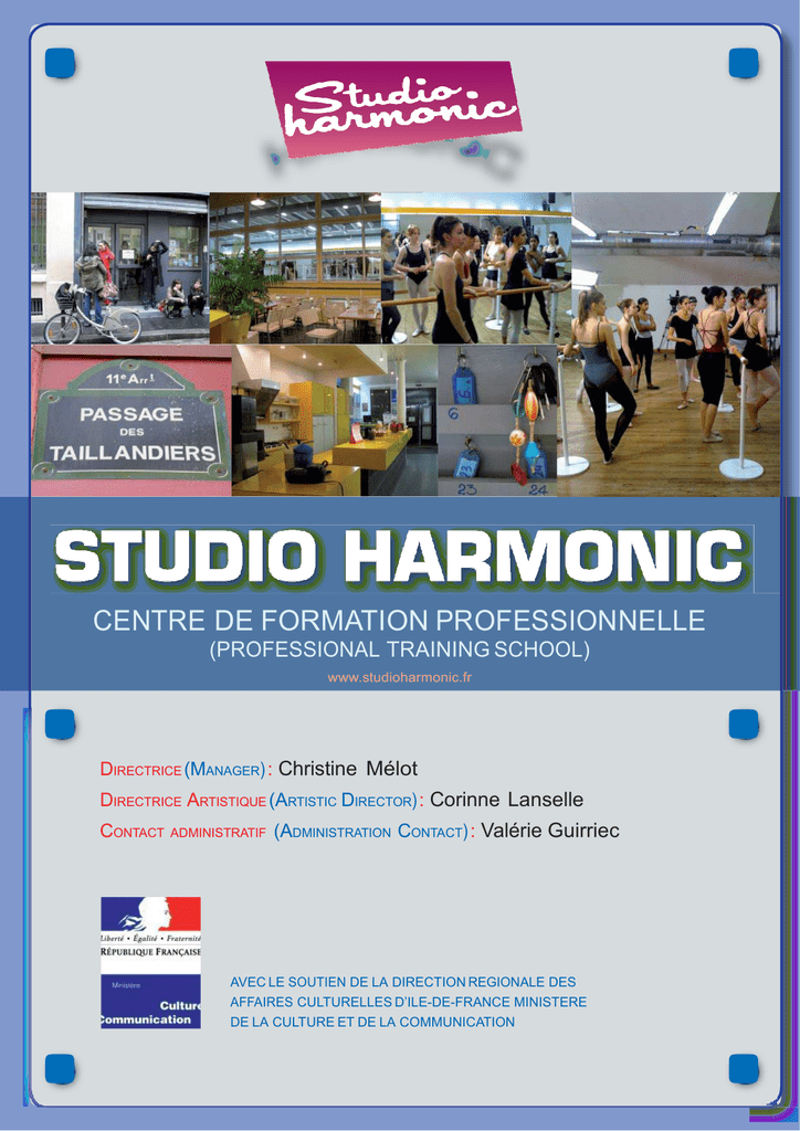 CENTRE DE FORMATION PROFESSIONNELLE (PROFESSIONAL TRAINING SCHOOL) www.studioharmonic.fr DIRECTRICE (MANAGER) : Christine Mélot DIRECTRICE ARTISTIQUE (ARTISTIC DIRECTOR) : Corinne Lanselle CONTACT ADMINISTRATIF (ADMINISTRATION CONTACT) : Valérie Guirriec AVEC LE SOUTIEN DE LA DIRECTION REGIONALE DES AFFAIRES CULTURELLES D’ILE-DE-FRANCE MINISTERE DE LA CULTURE ET DE LA COMMUNICATION Informations sur le cursus du DIPLÔME D’ETAT DE PROFESSEUR DE Informations about the DIPLOME D’ETAT DE PROFESSEUR DANSE DE DANSE Examen d’Aptitude Technique Exam for Technical Ability Inscription (démarche personnelle du candidat) : Le dossier d’inscription est à retirer à la Direction Régionale des Affaires Culturelles (DRAC). Le candidat doit le demander, le compléter et le renvoyer munis des documents demandés avant la date de clôture des inscriptions. A la réception du dossier la DRAC enverra une attestation d’inscription, un Cd audio et un DVD des variations imposées et 15 jours au plus tard avant l’épreuve, une convocation. Préparation à l’EAT L’élève inscrit à l’école de formation (après admission sur audition) commence sa formation suivant un emploi du temps défini par la directrice pédagogique. Des ateliers et stages de préparation aux variations d’examens viennent s’intégrer dans les cours techniques dispensés. L’élève est tenu d’assister à tous les cours dans leur intégralité. Epreuves de l’EAT • Variation imposée Variation imposée par le Ministère de la Culture, de 1 minute 30 à 3 minutes maximum. • Variation libre L’élève présente une composition personnelle d’1minute 30 à 3 minutes avec un support musicale de son choix en utilisant les fondamentaux de l’option choisie (contemporain, jazz ou classique). • Improvisation Le jury donne des consignes, suivant l’option choisie, au candidat qui improvise un enchainement de 30 secondes à 1 minute. • Entretien Le jury s’entretient avec le candidat. Enrolment (personal choice of the candidate) : The application file has to be taken from the Direction Régionale des Affaires Culturelles (DRAC). The candidate has to ask the file, fill it and send it back with all the documents before the deadline. At the reception of the file the DRAC will send an enrolment certificate, an audio CD and a DVD of the imposed variation and a notification 15 days before the audition. Preparation for the EAT The student from the training centre (after admission at the audition) begins his training according to a timetable set by the school director. Workshops and trainings for the exam variations are part of the technical classes. The student has to attend all classes and in its full time length. Tests for the E.A.T • Compulsory Variation Variation imposed by the Ministère de la Culture from 1minute 30 to 3 minutes maximum. • Free Variation The candidate will present a personal variation from 1min30s to 3mins with its music and using the basis of the chosen option (contemporary, jazz or classical) • Improvisation The candidate will improvise a 30s to 1min enchaînement according to the jury’s decision • Interview The jury will interview the candidate Unités de Valeur Unités de Valeur Inscription Après la réussite à l’EAT, la DRAC délivre sur demande du candidat un livret de formation. L’école de formation se charge des inscriptions aux examens et fait parvenir aux candidats les convocations aux épreuves. Pour se présenter aux examens, le candidat doit avoir eu la note minimale de 10 à son EAT. Préparation aux UV L’élève doit assister à tous les cours théoriques assurés. De plus, il se doit d’effectuer 50 cours techniques par trimestre afin de parfaire sa formation. Epreuves des UV • Formation musicale L’épreuve est orale : écoute et analyse d’une œuvre du programme; lecture rythmique et notions musicales de base; mémorisation et transcription corporelle. Durée de l’épreuve : 25 à 30 minutes. Enrolment After succeeding at the E.A.T, the DRAC delivers a livret de formation (on the candidate’s demand). L’école de formation will deal with all the inscriptions to the exams and will provide the students with the convocations for the tests. In order to attend the exams, the candidate would have to get at least a 10 at the EAT. Preparation for the U.V. The student will have to attend all theory classes and also 50 technical classes per term in order to perfect its formation. U.V. tests • Musical formation Interview: Analysis of a work of the program; rhythmical reading and basic musical notion; memorize and embodied transcription. Test length: 25 to 30 minutes. • Histoire de la danse L’épreuve est écrite : dissertation sur un sujet du programme; 10 questions sur les connaissances de base. Durée de l’épreuve : 3 heures • History of dance Writing test: dissertation on a subject of the program; 10 questions about basic knowledge. Test length: 3 hours. • Anatomie – Physiologie L’épreuve est orale : sujet tiré au sort par l’élève portant sur les connaissances de l’anatomie fonctionnelle et la physiologie. Durée de l’épreuve : 15 minutes + 30 minutes de préparation • Anatomy – Physiology Interview: Subject drawn randomly by the student dealing about its knowledge of functional anatomy and physiology. Test length: 15 minutes + 30 minutes of preparation 1 Informations sur le cursus du Diplôme d’Etat de Professeur de danse (suite) Informations sur le cursus du Diplôme d’Etat de Professeur de danse (suite) Unité de Valeur de Pédagogie Unité de Valeur de Pédagogie Inscription Le candidat doit justifier de la réussite aux 3 UV théoriques. L’école de formation se charge de convoquer le jury et d’organiser l’examen. Elle inscrit et convoque les élèves candidats. Enrolment The candidate has to justify its success to 3 theoreticals UV. L’école de formation is in charge of organising the exam and convokin