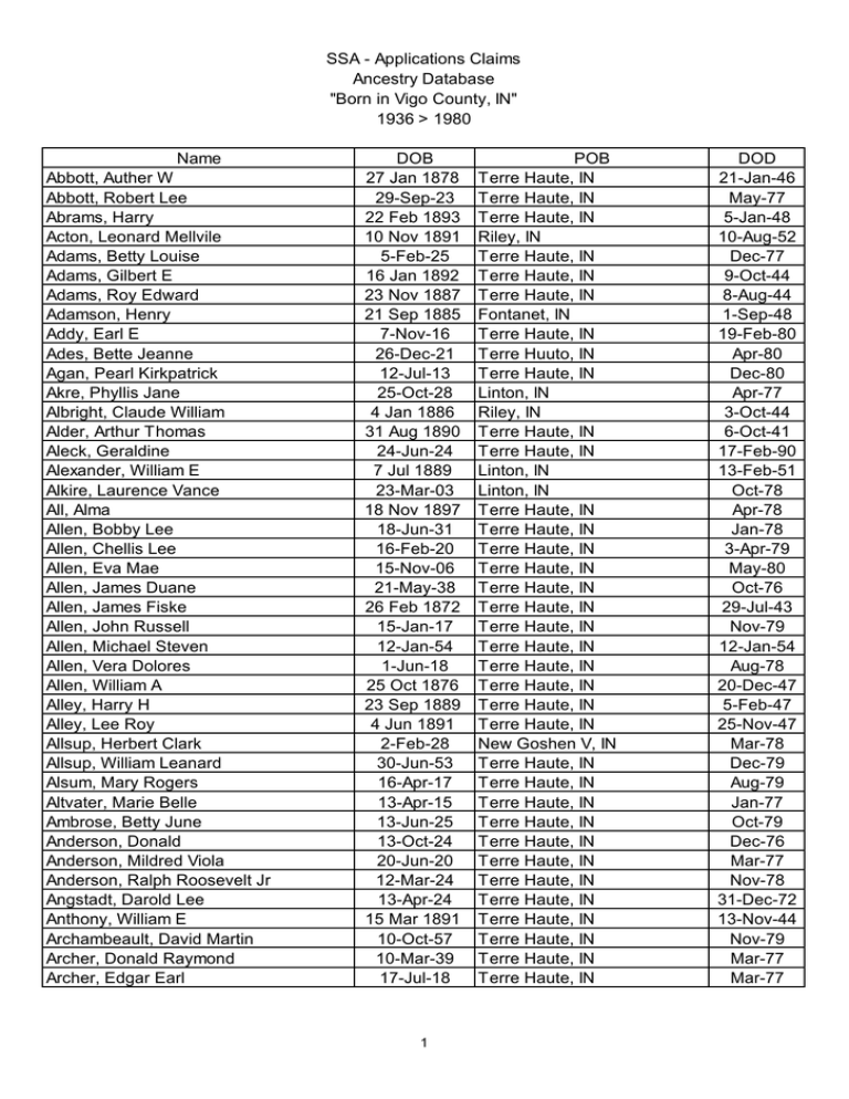 SSA - Applications Claims Ancestry Database "Born in Vigo County, IN" 1936 > 1980 Name Abbott, Auther W Abbott, Robert Lee Abrams, Harry Acton, Leonard Mellvile Adams, Betty Louise Adams, Gilbert E Adams, Roy Edward Adamson, Henry Addy, Earl E Ades, Bette Jeanne Agan, Pearl Kirkpatrick Akre, Phyllis Jane Albright, Claude William Alder, Arthur Thomas Aleck, Geraldine Alexander, William E Alkire, Laurence Vance All, Alma Allen, Bobby Lee Allen, Chellis Lee Allen, Eva Mae Allen, James Duane Allen, James Fiske Allen, John Russell Allen, Michael Steven Allen, Vera Dolores Allen, William A Alley, Harry H Alley, Lee Roy Allsup, Herbert Clark Allsup, William Leanard Alsum, Mary Rogers Altvater, Marie Belle Ambrose, Betty June Anderson, Donald Anderson, Mildred Viola Anderson, Ralph Roosevelt Jr Angstadt, Darold Lee Anthony, William E Archambeault, David Martin Archer, Donald Raymond Archer, Edgar Earl DOB 27 Jan 1878 29-Sep-23 22 Feb 1893 10 Nov 1891 5-Feb-25 16 Jan 1892 23 Nov 1887 21 Sep 1885 7-Nov-16 26-Dec-21 12-Jul-13 25-Oct-28 4 Jan 1886 31 Aug 1890 24-Jun-24 7 Jul 1889 23-Mar-03 18 Nov 1897 18-Jun-31 16-Feb-20 15-Nov-06 21-May-38 26 Feb 1872 15-Jan-17 12-Jan-54 1-Jun-18 25 Oct 1876 23 Sep 1889 4 Jun 1891 2-Feb-28 30-Jun-53 16-Apr-17 13-Apr-15 13-Jun-25 13-Oct-24 20-Jun-20 12-Mar-24 13-Apr-24 15 Mar 1891 10-Oct-57 10-Mar-39 17-Jul-18 1 POB Terre Haute, IN Terre Haute, IN Terre Haute, IN Riley, IN Terre Haute, IN Terre Haute, IN Terre Haute, IN Fontanet, IN Terre Haute, IN Terre Huuto, IN Terre Haute, IN Linton, IN Riley, IN Terre Haute, IN Terre Haute, IN Linton, IN Linton, IN Terre Haute, IN Terre Haute, IN Terre Haute, IN Terre Haute, IN Terre Haute, IN Terre Haute, IN Terre Haute, IN Terre Haute, IN Terre Haute, IN Terre Haute, IN Terre Haute, IN Terre Haute, IN New Goshen V, IN Terre Haute, IN Terre Haute, IN Terre Haute, IN Terre Haute, IN Terre Haute, IN Terre Haute, IN Terre Haute, IN Terre Haute, IN Terre Haute, IN Terre Haute, IN Terre Haute, IN Terre Haute, IN DOD 21-Jan-46 May-77 5-Jan-48 10-Aug-52 Dec-77 9-Oct-44 8-Aug-44 1-Sep-48 19-Feb-80 Apr-80 Dec-80 Apr-77 3-Oct-44 6-Oct-41 17-Feb-90 13-Feb-51 Oct-78 Apr-78 Jan-78 3-Apr-79 May-80 Oct-76 29-Jul-43 Nov-79 12-Jan-54 Aug-78 20-Dec-47 5-Feb-47 25-Nov-47 Mar-78 Dec-79 Aug-79 Jan-77 Oct-79 Dec-76 Mar-77 Nov-78 31-Dec-72 13-Nov-44 Nov-79 Mar-77 Mar-77 SSA - Applications Claims Ancestry Database "Born in Vigo County, IN" 1936 > 1980 Name Archer, Floyd Guy Armstrong, Charles H Armstrong, Gertrude Amanda Armstrong, Harry Daniel Arnold, Russell Irvin Ashe, Thomas Joseph Asher, Martha Louise Asher, Thelma Elizabeth Atteberry, Arthur William Aue, Otto Jr Auler, Marshall Henry Austin, Alfred N Austin, Andrew Ellsworth Auterson, Albert Lee Auterson, Daniel Thomas Axe, Robert Lee Bailey, James Knox Baker, Floyd Donald Baker, Harold Emmit Baker, Harry E Baker, Ivan Claud Baldon, James Baldwin, George Monroe Ball, Spencer Franklin Bannon, Susan Phyllis Barbee, John Alfred Bare, Darwin Briley Barker, James Franklin Barkley, Walter Thurman Barnhart, Carrie A Barthel, Mildred Hires Bartholomew, Henry White Bartlett, Paul Jack Bass, Roy L Batchelor, James Franklin Bates, Loretta Ruth Batman, Barbara Baugh, Wanda Earnestine Baxter, Robert Leroy Bayless, Hanna Bays, Harry Beabout, Redyth June DOB 2-Dec-36 6 Nov 1880 23-May-15 13 Mar 1864 16-Dec-17 17-Sep-18 5-Jun-16 19-Mar-05 5-Feb-18 10-Feb-16 28-Feb-16 3 Jan 1880 19-Aug-32 22-Jun-40 7-Nov-51 29-May-20 5 Feb 1897 26-Jul-13 27-Jan-34 21 Feb 1897 2 Feb 1872 5-Sep-17 22 Dec 1888 18-Jan-19 1-Mar-35 3-May-16 16-Nov-19 3-Dec-19 14-Jun-61 15 Sep 1894 5-Sep-14 11 Sep 1895 3-Feb-19 18-Dec-15 5-Jul-16 20-Jul-17 21-Sep-40 28-Mar-27 12-Sep-18 12 Jul 1867 1 Jul 1893 26-Jun-20 2 POB Terre Haute, IN Terre Haute, IN Terre Haute, IN Linton, IN Terre Haute, IN Terre Haute, IN Terre Haute, IN Terre Haute, IN Terre Haute, IN Terre Haute, IN Terre Haute, IN Terre Haute, IN Terre Haute, IN West Terre Haute, IN Terre Haute, IN Linton, IN Terre Haute, IN Terre Haute, IN Terre Haute, IN Linton, IN Terre Haute, IN Terre Haute, IN Linton, IN Terre Haute, IN Terre Haute, IN Terre Haute, IN Linton, IN Terre Haute, IN Terre Haute, IN Terre Haute, IN Terre Haute, IN Terre Haute, IN Terre Haute, IN Terre Haute, IN Terre Haute, IN Terre Haute, IN Terre Haute, IN Terre Haute, IN Terre Haute, IN Terre Haute, IN Terre Haute, IN Terre Haute, IN DOD Dec-78 13-Mar-46 Dec-80 10-Dec-43 May-79 May-79 Aug-77 May-77 Apr-79 Dec-77 Jul-77 10-Feb-43 Dec-79 May-78 Jun-77 Dec-80 4-May-47 Dec-70 Aug-79 20-Jun-49 2-Jul-45 Oct-77 24-Aug-42 Jul-77 Jan-79 Oct-77 14-Dec-78 Dec-76 May-80 12-Jan-51 Feb-79 11-Feb-45 Sep-80 Dec-79 Jul-76 Oct-77 Mar-80 Nov-76 Jul-78 21-Jun-41 13-Nov-49 Sep-79 SSA - Applications Claims Ancestry Database "Born in Vigo County, IN" 1936 > 1980 Name Beall, Erline Duncan Bealmear, Earl Estel Bealmear, James Herbert Bearley, Charles Tombley Jr Beasley, Woodford Beatty, Charles Harrison Beck, Walter Homer Becker, Harry Becker, Harry Robert Bedinger, Mary Louise Bedwell, Lois Kathleen Beecher, Quentin Rippetoe Beedle, Barbara Jean Beeson, Jack Charles Bell, Mark Bellinger, Michael T Bemis, Oval Melvin Bennett, Homer Bennett, John Clifford Bennett, Lester Bennett, Norris Bennett, Woodie Bentham, Elioni Mathias James Berkowitz, Samuel Berns, Clara Marieg Berns, Philip Ernest Berry, Edna Russell Bertelstein, Geraldine Bertram, Willis F Bevins, Abbe Green Beymer, Claude C Bibo, Philip Anthony Bidaman, Minnie L Biddle, John Bidwell, Horace W Biggs, Katherine Clarastanger Biggs, Ralph Wayne Bingham, Anna Marieburke Bischoff, August John Bishop, William K Black, Leon Willien Black, Mary Angela DOB 27-Apr-10 6-Oct-23 20-Jun-18 28-Dec-50 31 Oct 1891 17-Jun-15 1 Jul 1888 29 Jun 1890 16-Feb-28 17-Mar-21 17-Aug-16 14-Sep-42 29-Nov-26 15-Nov-23 30-Jan-56 24-Feb-54 8-Mar-18 3 Mar 1892 28-Dec-16 17-Jan-14 12-Dec-07 1 Jan 1895 1 Jun 1883 12 Sep 1891 14 Oct 1881 13-Jan-16 19-Jul-17 12-Oct-21 26 Dec 1889 11 Jul 1886 15 May 1885 14-Jun-58 29 May 188