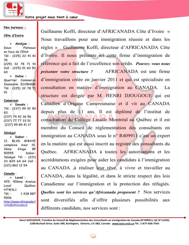 Votre projet nous tient à cœur Nos bureaux : Côte d’Ivoire Abidjan : Deux Plateaux en face de l’ENA Tél : (225) 22 41 81 36 (225) 32 78 71 91 Cell : (225) 01 60 50 60 Daloa : Quartier Commerce Immeuble ECOBANK Tél : (225) 32 78 71 91 Cameroun Douala : Tél. : (237) 99 91 90 83 (237) 74 42 36 56 (237) 77 77 33 51 (237) 99 85 41 17 Sénégal Dakar : 12, BLVD M’BAYE complexe Azur 15, 2ème étage BP 50555 DakarSénégal Tél : (221) 33 829 64 64 Cell : (221) 862 12 54 Canada : Laval : 425, 90ème Avenue Laval Québec H7W3L1 Tél. : 1 438 887 5506 http://www.africanada.f [email protected] Guillaume Koffi, directeur d’AFRICANADA Côte d’Ivoire « Nous travaillons pour une immigration réussie et dans les règles » Guillaume Koffi, directeur d’AFRICANADA Côte d’Ivoire. Il nous présente ici cette firme d’immigration de référence qui a fait de l’excellence son crédo. Pouvez- vous nous présenter votre structure ? AFRICANADA est une firme d’immigration créée en janvier 2011 et qui est spécialisée en consultation en matière d’immigration au CANADA. La structure est dirigée par M. HENRI DJOUGOUE qui est Canadien d’Origine Camerounaise et il vit au CANADA depuis plus de 11 ans. Il est diplômé de l’institut de consultation du Collège Lasalle Montréal au Québec et il est membre du Conseil de réglementation des consultants en immigration au CANADA sous le n° R409911 c’est un expert en la matière qui est aussi inscrit au registre des consultants du Québec. AFRICANADA à toutes les autorisations et les accréditations exigées pour aider les candidats à l’immigration au CANADA ,à réaliser leur rêve, à vivre et travailler au CANADA, dans la légalité, et dans le stricte respect des lois Canadienne sur l’immigration et la protection des réfugiés. Quelles sont les services qu’Africanada proposent ? Nos services sont diversifiés afin d’offrir plusieurs possibilités aux différents candidats, nos services sont : Henri DJOUGOUÉ, membre du Conseil de Réglementation des Consultants en Immigration du Canada (N°409911; QC N°11435) 1100 Burloak Drive, Suite 300, Burlington, Ontario, L7L 6B2, Canada www.iccrc-crcic.ca Tél. :1-877-836-7543 Votre projet nous tient à cœur RESIDENT PERMANENT Travailleur Qualifié Travailleur autonome Entrepreneur Investisseur Asile Regroupement familiale Programme pour les sportifs et dirigeant de haut niveau RESIDENT TEMPORAIRE Permis d’études Aide familiale résident Comment se fait la sélection des candidats à l’immigration au canada ? La sélection des candidats ne se fait pas au hasard le Canada a ses propres critères de sélection, Ses critères sont : l’âge, le diplôme, le domaine de formation, l’expérience professionnelle etc.…. Pour chaque critère mentionné plus haut les candidats seront évalués, ceux qui attendront le seuil de passage en sélection, verront leur projet d’immigration s’aboutir. Quelle est votre méthode de travail ? Notre méthode de travail se distingue des autres et se résume en six étapes qui sont : Henri DJOUGOUÉ, membre du Conseil de Réglementation des Consultants en Immigration du Canada (N°409911; QC N°11435) 1100 Burloak Drive, Suite 300, Burlington, Ontario, L7L 6B2, Canada www.iccrc-crcic.ca Tél. :1-877-836-7543 Votre projet nous tient à cœur 1) Evaluation préliminaire 2) Sélection du programme 3) Constitution du dossier 4) Demande officiel 5) Préparation à l’entrevue 6) Programme d’arrivé et d’intégration au Canada L’âge et l’expérience professionnelle sont- ils des facteurs éliminatoires ? L’âge et l’expérience professionnelle ne sont pas des facteurs qui éliminent. Il n’y a pas d’âge limite pour immigrer au Canada et même sans expérience professionnelle on peut immigrer au Canada toutes fois , on procédera par une évaluation préliminaire. En combien de temps dure la procédure ? Il est difficile de déterminer exactement le temps de la procédure parce que le gouvernement canadien accorde des priorités à certains dossiers en fonction du domaine d’activités et en fonction des besoins qui se font sentir au Canada et surtout que le Canada est la destination la plus prisée en ce moment en matière d’immigration, les demandes d’immigrations viennent de partout dans le monde entier ce qui rend la procédure un peu longue ,mais en règle générale c’est : le premier arriver ,le premier servi . Lorsque le candidat s’est retrouvé au Canada grâce à AFRICANADA à quoi doit – il s’attendre ? Le gouvernement Canadien à pris des dispositions dans ce sens pour accueillir les résidents permanent qui arrivent pour la première fois au Canada et pour faciliter leur intégration. Aussi tous les résidents permanents bénéficient gratuitement du système universel de santé : maladie et hospitalisation. Pour ceux et celles qui sont démunis financièrement et qui n’ont pas de travail, la loi sur la sécurité du revenu du Québec offre une protection de dernier recours en leur accordant un montant mensuel variable selon la taille de la famille. Cette aide social leur permettra de se loger et de se nourrir jusqu’à ce qu’ils obtiennent un emploi mais attention, cette aide n’intervient que trois mois après leur arriver au Canada, il appartient aux nouvelles arrivants de prendre touts les dispositions afin d’assumer leur frais des subsistances durant les trois premiers mois. Il faut aussi noter qu’a coté de tous ce qui vient d’être citer AFRICANADA à la particularité de faciliter l’intégration des résidents permanents dans la communauté africaine et Henri DJOUGOUÉ, membre du Conseil de Réglementation des Consultants en Immigration du Canada (N°409911; QC N°11435) 1100 Burloak Drive, Suite 300, Burlington, Ontario, L7L 6B2, Canada www.iccrc-crcic.ca Tél. :1-877-836-7543 Votre projet nous tient à cœur plus précisément chez les ivoiriens vivants au Canada. En quoi consis
