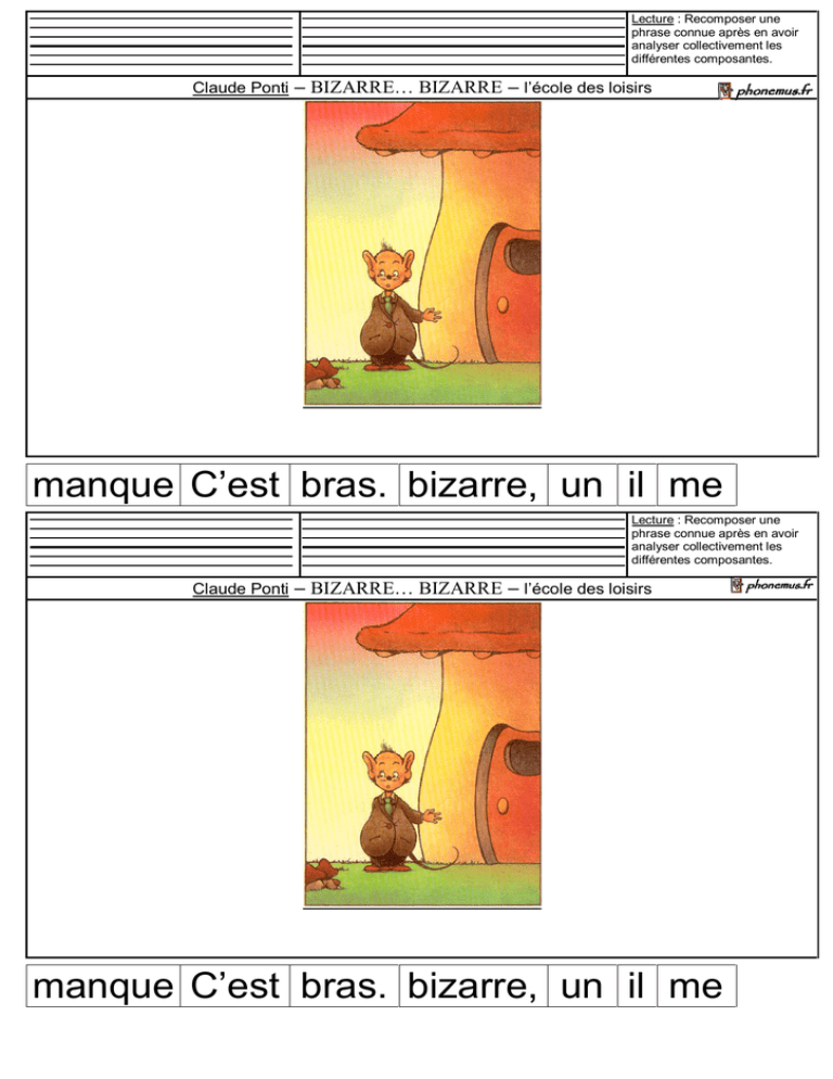 Lecture : Recomposer une phrase connue après en avoir analyser collectivement les différentes composantes. Claude Ponti – BIZARRE… BIZARRE – l’école des loisirs manque C’est bras. bizarre, un il me Lecture : Recomposer une phrase connue après en avoir analyser collectivement les différentes composantes. Claude Ponti – BIZARRE… BIZARRE – l’école des loisirs manque C’est bras. bizarre, un il me