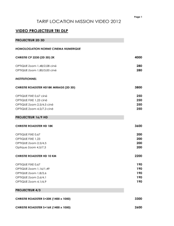 Page 1 TARIF LOCATION MISSION VIDEO 2012 VIDEO PROJECTEUR TRI DLP PROJECTEUR 2D 3D HOMOLOGATION NORME CINEMA NUMERIQUE CHRISTIE CP 2230 (2D 3D) 2K OPTIQUE Zoom 1,48/2,08 ciné OPTIQUE Zoom 1,80/3,00 ciné 4000 280 280 INSTITUTIONNEL CHRISTIE ROADSTER HD18K MIRAGE (2D 3D) OPTIQUE FIXE 0,67 ciné OPTIQUE FIXE 1,23 ciné OPTIQUE Zoom 2,5/4,5 ciné OPTIQUE Zoom 4,5/7,3 ciné 3800 250 250 250 250 PROJECTEUR 16/9 HD CHRISTIE ROADSTER HD 18K OPTIQUE FIXE 0,67 OPTIQUE FIXE 1,23 OPTIQUE Zoom 2,5/4,5 Optique Zoom 4,5/7,3 CHRISTIE ROADSTER HD 10 KM OPTIQUE FIXE 0,67 OPTIQUE Zoom 1,16/1,49 OPTIQUE Zoom 1,8/2,6 OPTIQUE Zoom 2,6/4,1 OPTIQUE Zoom 4,1/6,9 3600 200 200 200 200 2200 190 190 190 190 190 PROJECTEUR 4/3 CHRISTIE ROADSTER S+20K (1400 x 1050) 3300 CHRISTIE ROADSTER S+16K (1400 x 1050) 2600 Page 2 OPTIQUE FIXE 0,73 OPTIQUE FIXE 1,23 OPTIQUE Zoom 2,5/4,5 OPTIQUE Zoom 4,5/7,3 CHRISTIE ROADSTER DS+ 10KM (1400 X 1050) 200 200 200 200 2100 OPTIQUE Zoom 4,3/7,1 190 190 190 190 190 BARCO SLM G8 (1024 X 768) 900 BARCO SLM G5 (1024 X 768) 800 OPTIQUE FIXE 0,8 190 190 190 190 OPTIQUE FIXE 0,73 OPTIQUE Zoom 1,25/1,6 OPTIQUE Zoom 2/2,8 OPTIQUE Zoom 2,8/4,3 OPTIQUE FIXE 1,23 OPTIQUE Zoom 2,8/5 OPTIQUE Zoom 5/8 VIDEO PROJECTEUR MONO DLP PROJECTEUR 16/9 BARCO CLM HD 8 HD 1700 OPTIQUE Zoom 2,2/4,4 170 170 170 170 CHRISTIE DH D670- E HD 800 OPTIQUE FIXE 0,8 OPTIQUE Zoom 1,2/1,5 140 140 PANASONIC PT- DZ 6710 HD 800 OPTIQUE FIXE 0,8 HD OPTIQUE Zoom 1,3/2,1 HD OPTIQUE Zoom 1,8/2,4 HD 130 130 130 OPTIQUE 0,85 OPTIQUE Zoom 1,2/1,5 OPTIQUE Zoom 1,55/2,2 Page 3 OPTIQUE Zoom 3,7/5,6 HD 130 PANASONIC PT- DW 6300 ES (16/10ème) 600 PANASONIC PT- DW 5100 ES 500 memes optiques que pour le PT- DZ 6710 HD 105 PROJECTEUR 4/3 BARCO CLM R10 (1400 X 1050) 1700 OPTIQUE 0,85 OPTIQUE Zoom 1,2/1,5 OPTIQUE Zoom 2,2/4,4 170 170 170 PANASONIC PT- 6000 EK (1024 X 768) 600 PANASONIC PT- D 5600 EK (1024 X 768) 560 PANASONIC PT- D 5500 EK (1024 X 768) 450 OPTIQUE FIXE 0,8 OPTIQUE Zoom 1,3/2,1 OPTIQUE Zoom 1,8/2,4 OPTIQUE Zoom 3,7/5,6 105 105 105 105 ACCROCHE PONT ACCROCHE PONT ALU PIVOTANT CHRISTIE K16 - K20 - HD18 120 ACCROCHE PONT ALU PIVOTANT CHRISTIE HD 10KM - DS 10KM 110 SUPPORT PONT LUMIERE AVEC PLATINES (Hauteur 2,5m) CHRISTIE K16 - K20 - HD18 - k10 120 SUPPORT PONT LUMIERE PANASONIC 40 Page 4 GESTION IMAGE PANORAMIQUE SYSTÈME ENCORE HD- 2K CONFIGURATION 1 ECRAN CONFIGURATION 2 ECRANS CONFIGURATION 3 ECRANS CONFIGURATION 4 ECRANS CONFIGURATION 5 ECRANS CONFIGURATION 6 ECRANS CONFIGURATION 7 ECRANS CONFIGURATION 8 ECRANS 2000 2900 3800 4700 5600 6500 7400 8300 TARIF DETAILLE: CONSOLE LC (Petite) CONSOLE SC (GRANDE) SYSTÈME 3ME (HD SDI OUT PUT 500 700 1500 SYSTÈME SPYDER X20 HD 2K 2D-3D CONFIGURATION 2 SORTIES CONFIGURATION 3 SORTIES CONFIGURATION 4 SORTIES CONFIGURATION 5 SORTIES CONFIGURATION 6 SORTIES CONFIGURATION 7 SORTIES CONFIGURATION 8 SORTIES 3400 4400 5400 6400 7400 8400 9400 SELECTEUR ENCORE HD 2K CONFIGURATION 1 ECRAN CONFIGURATION 2 ECRANS CONFIGURATION 3 ECRANS CONFIGURATION 4 ECRANS CONFIGURATION 5 ECRANS 600 1200 1800 2400 2800 SYSTÈME WATCHOUT HD ORDINATEUR MAITRE ORDINATEUR DE DIFFUSION CONFIGURATION 1 ECRAN CONFIGURATION 2 ECRANS CONFIGURATION 3 ECRANS CONFIGURATION 4 ECRANS CONFIGURATION 5 ECRANS CONFIGURATION 6 ECRANS 600 400 1000 1400 1800 2200 2600 3000 Page 5 SYSTÈME PANDORA HD PANDORA CONSOLE STD 450 PANDORA BOX MEDIA SERVEUR GREEN STORAGE 900 INFOGRAPHIE - POWER POINT ORDINATEUR POWERPOINT DOUBLE SORTIE HD ORDINATEUR PORTABLE P4-2,8Hhz -510Mo 600 220 Page 6 ECRANS PLATS - MONITEURS PLASMA PANASONIC TH- 103 PF 10EK HD (103'') PANASONIC TH-85 PF 10EK HD (65") PANASONIC TH- 65 PF 10EK HD (65'') PANASONIC TH- 50 PF 10EK HD (50'') PANASONIC TH- 42 PF 11EK HD (42'') PIONNER PDT 61 X E1 HD READY PIONNER PDT 50M X E 10 HD READY 1950 1350 690 290 245 500 210 LCD PHILIPS BDL 32 15 E HD LG W 22 61 HD 170 150 BON ELECTRONICS 17'' BROADCAST HD LG MONITEUR LCD 22'' HD NEOVO X- 20 20'' (4/3) NEOVO X- 19 19'' (4/3) NEOVO X- 17 17'' (4/3) NEOVO X- 15 15'' (4/3) 220 220 120 80 60 60 SAMSUNG LE 19D 450 G1 WXZF (16/9) 70 ACCESSOIRES PIED DESIGN ACCROCHE PONT DESIGN ALU LONGUEUR REGLABLE ACCROCHE PONT VERTICAL ACCROCHE PONT HORIZONTAL ENCEINTE (la paire) ARCHE PONT LUMIERE (hauteur 4,50m) pour 103'' SUPPORT DESIGN RETOUR SCENE ECRAN 110 120 40 40 40 180 110 MONITEUR VIDEO SONY PVM - 2930 SONY PVM - 2130 Prompteur 70 45 380 Page 7 PERIPHERIQUE FIBRE NEUTRIK BOITIERS LIGHTWARE DVI (2 sorties) FIBRE NEUTRIK BOITIERS OPTICIS HD SDI FIBRE MULTIBRINS BOITIER GEFEN DVI FIBRE MULTIBRINS BOITIER OPTICIS DVI 650 250 120 120 DISTRIBUTEUR DVI 1E/3S ANALOGWAY DISTRIBUTEUR HD SDI 2E/3S ANALOGWAY DISTRIBUTEUR HD SDI 1E/4S EXTRON 60 90 50 DISTRIBUTEUR RVBS EXTRON 1E/2S DISTRIBUTEUR RVBS EXTRON 1E/4S DISTRIBUTEUR RVBS EXTRON 1E/6S 60 80 90 DISTRIBUTEUR VGA EXTRON 1E/2S DISTRIBUTEUR VGA EXTRON 1E/4S DISTRIBUTEUR VGA EXTRON 1E/6S 40 50 60 DISTRIBUTEUR AV KRAMER 1E/10S 40 CONVERTISSEUR HD SDI - DVI AJA CONVERTISSEUR HD SDI - HDMI AJA EMBEDER- DESEMBEDER HD SDI AJA CONVERTISSEUR IMAGE PRO HD SDI CONVERTISSEUR NUM - YUV 75 75 75 350 80 GRILLE COMMUTATION AV 6E/6S GRILLE FOLSOM HDSDI 8E/8S 60 120 SELECTEUR RVBS EXRON 4E/1S SELECTEUR VGA EXTRON 4E/1S 40 40 PAVLOFF HF 2S MICROCUE PAVLOFF MICROCUE HUM COMPOSITE VIDEONET HUM SDI VIDEONET 90 70 20 40 Page 8 ECRANS SUR CADRE FORMAT 4/3 ECRAN 6M X 4,50M ECRAN 4M X 3M ECRAN 3M X 2,25M ECRAN 2,40M X 1,50M ECRAN 1,80M X 1,35M 250 100 80 75 55 FORMAT 16/9 2,28M X 1,43M 2,86M X 1,70M (2,66 X 1,50 RETRO) 3,45M x 2,03M (3,25 x 1,83 RETRO) 4,47M X 2,60M (4,27 x 2,40 RETRO) 5,08M X 2,94M (4,88 x 3,60 RETRO) 6,30M X 3,63M (6,10 x 3,43 RETRO) 7,60M X 4,27M (7,40 x 4,07 RETRO) 60 80 90 100 300 450 600 ECRANS GRANDES DIMENSIONS 14M X 6M 14M X 10M 12M X 4M 15M X 4M 15M X 5M 20M X 5M 22M X 5M SUR DEVIS Page 9 CAPTATION REGIE HD GRASS VALLEY REGIE 2 CAMERAS HD REGIE 3 CAMERAS HD REGIE 4 CAMERAS HD REGIE 5 CAMERAS HD REGIE 6 CAMERAS HD REGIE 7 CAMERAS HD 3600 4250 4900 5560 6220 6880 REGIE SD GRASS VALLEY REGIE 2 CAMERAS