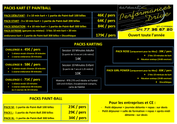 PACKS KART ET PAINTBALL 46€ / pers 64€ / pers 84€ / pers PACK DÉBUTANT : 2 x 10 min kart + 1 partie de Paint-ball 100 billes PACK START : 3 x 10 min kart + 1 partie de Paint-ball 200 billes PACK SENSATION : 4 x 10 min kart + 1 partie de Paint-Ball 300 billes PACK EXTREME (garçons ou mixtes) : 3 fois 10 min kart + 20 min endurance kart + 1 partie de Paint-ball 300 billes + Discothèque 179€ / pers Ouvert toute l’année PACKS KARTING CHALLENGE A : 45€ / pers 1 séance essais chronos 10 minutes 1 course endurance 20 minutes CHALLENGE B : 58€ / pers 1 séance essais chronos 10 minutes 1 course endurance 30 minutes CHALLENGE C : 71€ / pers 1 séance essais 10 minutes 1 course endurance 40 minutes ou 2 courses de 20 minutes Session 10 Minutes Adulte (à partir de 12 ans et 1.45 mètre) 14€ Session 10 Minutes Enfant (à partir de 7 ans et 1.25 mètre) 10€ Matériel : RT8 270 cm3 Adulte et Funkid 120 cm3 Enfant, Encadrement compris, carte de fidélité PACKS PAINT-BALL PACK M : 1 partie de Paint-Ball 100 billes PACK L : 1 partie de Paint-Ball 200 billes PACK XL : 1 partie de Paint-Ball 300 billes PACK ROSE (uniquement pour les filles) : 39€ / pers 2 fois 10 minutes de kart Réunion sextoys (1h30 environ) PACK GIRL POWER (uniquement pour les filles) : 83€ / pers 2 fois 10 mintues de kart Réunion sextoys (1h30 environ) Discothèque Pour les entreprises et CE : 23€ / pers 29€ / pers 34€ / pers - Petit déjeuner + journée détente + repas : sur devis - Petit déjeuner + salle de formation + repas + après-midi détente : sur devis