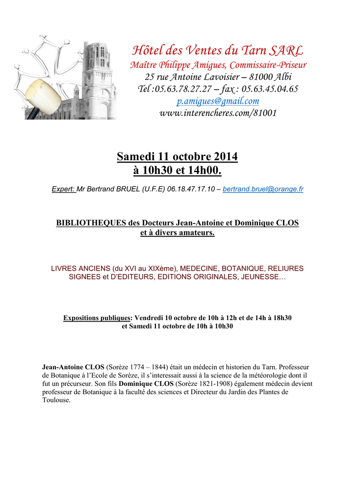 Hôtel des Ventes du Tarn SARL Maître Philippe Amigues, Commissaire-Priseur 25 rue Antoine Lavoisier – 81000 Albi Tel :05.63.78.27.27 – fax : 05.63.45.04.65 [email protected] www.interencheres.com/81001 Samedi 11 octobre 2014 à 10h30 et 14h00. Expert: Mr Bertrand BRUEL (U.F.E) 06.18.47.17.10 – [email protected] BIBLIOTHEQUES des Docteurs Jean-Antoine et Dominique CLOS et à divers amateurs. LIVRES ANCIENS (du XVI au XIXème), MEDECINE, BOTANIQUE, RELIURES SIGNEES et D’EDITEURS, EDITIONS ORIGINALES, JEUNESSE… Expositions publiques: Vendredi 10 octobre de 10h à 12h et de 14h à 18h30 et Samedi 11 octobre de 10h à 10h30 Jean-Antoine CLOS (Sorèze 1774 – 1844) était un médecin et historien du Tarn. Professeur de Botanique à l’Ecole de Sorèze, il s’interessait aussi à la science de la météorologie dont il fut un précurseur. Son fils Dominique CLOS (Sorèze 1821-1908) également médecin devient professeur de Botanique à la faculté des sciences et Directeur du Jardin des Plantes de Toulouse. DOCUMENTS - AFFICHES 1- GRAVURE encadrée sous verre représentant Dominique CLOS (44 x 34 cm). Joint avec une lettre de son frère Jean (4 pp. man. petit in 12) avec enveloppe timbrée et une biographie du Docteur Jean-Antoine CLOS par Léon CLOS. (16 pp. imprimées in 8) 30 / 40 € 2- PARCHEMIN ENLUMINE DU XVIIème (68,5 x 88cm). Diplôme de droit concédé par l’Université de Naples à Maître Ludovic de MAUROC le 30 août 1639. En-tête au nom de François Marie CARRACCIOLI Prince d’AVELLINO grand Chancellier de Naples. La ville étant sous domination espagnole des Habsbourgs, il est précisé que l’on est sous le règne de Philippe IV et un grand aigle à deux têtes couronnées noir et doré couvre l’ensemble du document. Une vierge à l’enfant, des anges, des fleurs et des animaux complètent le décor. Superbe et rare en cet état. 200 / 300 € 3- ENSEMBLE DE 4 DOCUMENTS XVIII et XIXème : Lettre de ½ pp. in 4 de reconnaissance de Charge de Lieutenant dans le Bataillon de Milice de La Rochelle. A Versailles le 15 avril 1729 signée Louis (secrétaire du Roi). 2 lettres in 8 de 1789 signés par le Comte de CHATILLON à La Rochelle concernant la Noblesse de Province. Lettre de 1pp. in 8 du Secrétaire Général à la Guerre à Monsieur de LAPANOUSE Paris 1823 avec en-tête du Ministère de la Guerre. 80 / 100 € 4- 8 pp manuscrites sur l’aiguille aimantée de la boussole. 8 mai 1760 « conclusion de la Dissertation sur l’aiman… » P. Le Père CAVALLERY. 30 / 40 € 5- ENSEMBLE DE 3 DOCUMENTS XVIIIème. ORDRE DU ROI LOUIS XVI au concierge des Prisons de mettre en liberté Monsieur de PONCET fait à Versailles le 14 juillet 1781. Lettre manuscrite d’une ½ pp. in 8 signée Louis (écriture du secrétaire). SAUF-CONDUIT manuscrit pour le Baron de Wetter fait à Paris le 5 novembre 1720. 1 pp. in 8 signée Louis (écriture du secrétaire). BREVET DE 10 000 de Pension pour M.de KALIO Colonel d’Infanterie pour avoir contribuer à l’éducation de l’Infant Duc de Parme. Sur vélin. Signé Louis (écriture du secrétaire). 100 / 150 € 6- ENSEMBLE DE 3 DOCUMENTS EPOQUE REVOLUTIONNAIRE : - EXTRAIT DES REGISTRES DES DELIBERATIONS DU DIRECTOIRE EXECUTIF. 2 pp. in 8 manuscrites avec vignette gravée en en-tête. Paris le 12 Prairial l’an 11. Signé CARNOT président. - LETTRE DU COMITE DE SALUT PUBLIC. 3 pp. in 8 manuscrites. Paris le 19 Nivose an II. Les Représentants au Citoyen Dumont représentant du Peuple. Ordre d’établir la nouvelle politique de la Convention Nationale dans les départements de Somme et de l’Oise. (pour copie). - LETTE DU COMITE DE SALUT PUBLIC à la commission des Administrations civiles, police et tribunaux. Paris le 12 nivose l’an III. En-tête avec vignette gravée. 60 / 80 € 7- ENSEMBLE DE 2 DOCUMENTS ET 3 JOURNAUX XIXème : - Lettre d’1 pp. grd in 8 man. du Général de brigade PROTEAU à l’Adjudant Général Albert de SARMATE le 30 Nivôse an 4 au sujet des intentions de l’ennemi vers la Flandre maritime. Signée Proteau. - Lettre d’1/2 pp. grd in 8 man. de l’Adjudant Général ERNOUF à Beaumont le 31 octobre 1793. Filigrane illustré « pro Patria ». - Supplément à la « Gazette Nationale ». 30 mai 1792. 2 pp. in folio. - « Gazette Nationale ou le Moniteur Universel ». 14 brumaire an XIII (5 novembre 1804). 4 pp. in folio. - Journal « le Publiciste » samedi 19 août 1809. 4 pp. in 8. Epidermures. 40 / 60 € 8- Lettre d’1 pp. in 8 man. du Roi CHARLES-FELIX , Roi de Sardaigne et Duc de Savoie adressée au « Roi Très Chrétien » (Sans doute le Roi de France Charles X). Château d’Aglié le 19 Octobre 1827. Lettre écrite par un secrétaire et signée par le Roi qui a ajouté 2 lignes manuscrites. Au sujet de Carlo ALFIERI DI SOSTEGNO homme politique favorable à l’Unité Italienne du Royaume de Sardaigne. Cachet de cire rouge aux Armes de Sardaigne. 40 / 60 € 9- LAISSEZ-PASSER aux armes de FLORIMOND, COMTE DE MERCYARGENTEAU fait à Paris le 12 Novembre 1784 en faveur du Nommé Pierre Le Grand. In 4 orné d’une grande vignette armoriée. Contre-signé par un des secrétaires. 40 / 60 € 10- ENSEMBLE DE 3 DOCUMENTS : - BREVET DEFINITIF de Matelot Gabier de 1ère Classe. In 8 oblong sur vélin avec en-tête aux Armes Impériales Marine et Colonies. A Cherbourg le 16 novembre 1869. cachet tampon des Equipages de la Flotte. - PASSE-PORT A L’ETRANGER fait à Paris le 11 janvier 1882. In 4 avec signaturetampon Jules Cambon (par le Secrétaire Général). - PASSE-PORT CONSULAT DE FRANCE A BOSTON fait à Boston le 14 Novembre 1881. 30 / 40 € 11- ENSEMBLE DE 12 FASCICULES DE FAC-SIMILES DE DOCUMENTS (in 8) : - « Le Tricentenaire du plus grand monument de la Diplomatie 1648-1948. La pièce historique qui associa l’Alsace et les trois Evêchés aux destinées françaises ». - « Quelques touchants appels du Génie en détresse ». - « Trois Règnes brisés : Louis XVII, Napoléon II, 