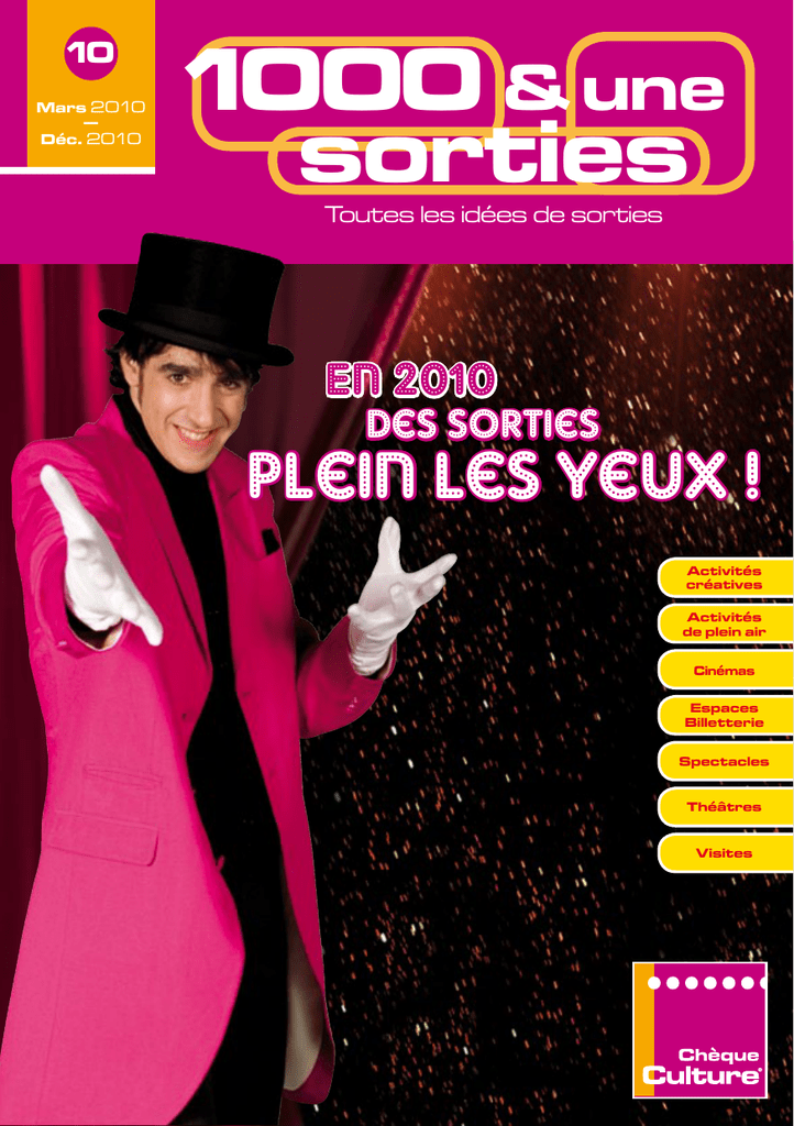 10 Mars 2010 — Déc. 2010 1000 & une sorties Toutes les idées de sorties En 2010 Des Sorties plein les yeux ! Activités créatives Activités de plein air Cinémas Espaces Billetterie Spectacles Théâtres Visites édito Embarquement immédiat pour une année de sorties ! Le Chèque Culture® vous dévoile tous ses partenaires 2010 dans votre région ! Votre nouveau guide 1000 & une sorties entre en scène ! Avec lui, faites le plein d’idées sorties et découvrez tous les divertissements culturels de votre région ! En famille, en couple ou entre amis, partagez de vrais moments de découverte et d’émotions à chaque saison ! Pour vos soirées d’hiver ou les chaudes nuits d’été, avec le Chèque Culture® les sorties c’est partout en France et toute l’année ! Pour multiplier les sorties à petit prix, profitez des Offres Privilèges réservées aux porteurs de Chèques Culture® ! Retrouvez-les sur www.chequeculture.com, rubrique « Où utiliser vos chèques ? ». Et pour connaître tous les bons plans, abonnez-vous à la E-Newsletter mensuelle. Avec vos Chèques Culture®, l’année s’annonce bien remplie côté sorties ! Catherine Coupet Directrice Générale N’oubliez pas de vous inscrire à la E-newsletter Chèque Culture® sur www.chequeculture.com pour connaître tous les bons plans en avant-première. Sommaire ALSACE p. 4 LORRAINE p. 54 AQUITAINE p. 7 MIDI-PYRÉNÉES p. 57 AUVERGNE p. 11 NORD-PAS-DE-CALAIS p. 62 BOURGOGNE p. 14 BASSE-NORMANDIE p. 66 BRETAGNE p. 17 HAUTE-NORMANDIE p. 69 CENTRE-VAL DE LOIRE p. 22 PAYS DE LA LOIRE p. 71 CHAMPAGNE-ARDENNE p. 26 PICARDIE p. 77 CORSE p. 29 POITOU-CHARENTES p. 80 FRANCHE-COMTÉ p. 30 PROVENCE-ALPES-CÔTE D’AZUR p. 84 ÎLE-DE-FRANCE PARIS p. 33 RHÔNE-ALPES LANGUEDOC-ROUSSILLON p. 48 LIMOUSIN p. 52 DOM p. 91 p. 100 NORD-PASDE-CALAIS HAUTENORMANDIE BASSENORMANDIE PICARDIE LORRAINE ÎLE-DE-FRANCE PARIS BRETAGNE PAYS DE LA LOIRE CENTREVAL DE LOIRE ALSACE CHAMPAGNEARDENNE BOURGOGNE FRANCHECOMTÉ POITOUCHARENTES LIMOUSIN AUVERGNE RHÔNE-ALPES AQUITAINE MIDI-PYRÉNÉES LANGUEDOCROUSSILLON PROVENVCEALPES-CÔTE D’AZUR CORSE LES DOM LA GUADELOUPE LA MARTINIQUE LA GUYANE LA RÉUNION La liste des partenaires du Chèque Culture®, présentée dans le guide 1000 & une sorties, est susceptible d’évoluer depuis sa parution. ALSACE CINÉMAS OFFRES PRIVILÈGES BAS-RHIN Retrouvez toutes les Offres Privilèges (réduction tarifaire, 1 place offerte pour 1 place achetée) de l’Alsace sur WISSEMBOURG HAUT-RHIN www.chequeculture.com MULHOUSE ACTIVITÉS CRÉATIVES HAUT-RHIN ALTKIRCH DANNEMARIE WINTZENHEIM BAS-RHIN STRASBOURG HAUT-RHIN COLMAR KINGERSHEIM ROUFFACH STE-MARIE-AUX-MINES WINTZENHEIM CINÉMA BEL AIR 31 rue Fénelon Tél. 08 92 68 05 79 (0,34$ TTC/min) ESPACES BILLETTERIE 68 BAS-RHIN CRAC ALSACE 18 rue du Château Tél. 03 89 08 82 59 www.cracalsace.com MJC DANNEMARIE 2 rue Cernay Tél. 03 89 25 03 21 ESPACE D’ANIMATIONS LOISIRS DU CHEVAL BLANC 8 rue Clemenceau Tél. 03 89 30 00 44 ACTIVITÉS DE PLEIN AIR CINÉ-CLUB DE WISSEMBOURG 2 rte Weiler - Tél. 03 88 94 06 26 ERSTEIN GAMBSHEIM HAGUENAU INGWILLER MOLSHEIM MUNDOLSHEIM 67 SÉLESTAT STRASBOURG FESTIVAL DE MUSIQUE DE STRASBOURG Palais de la musique et des congrès Tél. 03 88 32 43 10 www.festival-strasbourg.com La prévente du festival se fait au magasin Wolf Musique au 24 rue de la Mésange à Strasbourg. FESTIVAL VOIX ET ROUTE ROMANE 43 rue du maréchal Foch Tél. 03 90 41 02 02 - www.voix-romane.com JAZZ D’OR FESTIVAL 25 rue des Frères Tél. 03 88 36 30 48 - www.jazzdor.com Chèques Culture® valables uniquement pour la prévente au bureau du Festival. LE-MAILLON THÉÂTRE DE STRASBOURG Festival Premières, jeunes metteurs en scène européens Le-Maillon Wacken, Parc des Expositions, Place du Wacken Tél. 03 88 27 61 81 - www.le-maillon.com LES NUITS EUROPÉENNES Tél. 09 61 23 23 08 - www.lesnuits.eu Différents lieux à/et autour de Strasbourg. ESPACE BILLETTERIE E. LECLERC 45 rue du Printemps - Tél. 03 88 98 18 20 ESPACE BILLETTERIE SUPER U 120 rte Nationale - Tél. 03 88 96 74 75 CORA BILLETTERIE Rte du Rhin - Tél. 03 88 90 57 10 ESPACE BILLETTERIE SUPER U Zone industrielle - Tél. 03 88 89 28 89 CORA BILLETTERIE 1 rue Mercure - Tél. 03 88 49 71 71 CORA BILLETTERIE RN 63 - Tél. 03 88 20 96 96 ESPACE BILLETTERIE E. LECLERC 3 allée Westrich - Tél. 03 88 58 83 43 ESPACE BILLETTERIE E. LECLERC 1-3 rte du Rhin - Tél. 03 90 41 25 25 HAUT-RHIN COLMAR KINGERSHEIM MULHOUSE SIERENTZ ST-LOUIS WITTENHEIM 68 BAS-RHIN BISCHWILLER 67 68 CORA BILLETTERIE Zone Commercial du Buhfeld Houssen - Tél. 03 89 21 15 15 CULTURA BILLETTERIE CC Kaligone 90 rue de Guebwiller Tél. 03 89 31 83 60 - www.cultura.com CORA BILLETTERIE 258 rue de Belfort - Tél. 03 89 32 38 38 ESPACE BILLETTERIE HYPER U 12 rue du Capitaine Dreyfus - ZAC Hoell Tél. 03 89 83 99 11 ESPACE BILLETTERIE GÉANT CASINO 45 av. du Général De Gaulle - BP 717 Tél. 08 20 21 21 21 (0,09$ TTC/min) - www.geantcasino.fr CORA BILLETTERIE 130 rte de Soultz - Tél. 03 89 52 84 84 SPECTACLES FESTIVAL INTERNATIONAL DE COLMAR 3 lieux de concerts différents au centre de Colmar : Église St-Matthieu (3 Grand-Rue) – Koïfhus (29 GrandRue) – Chapelle St-Pierre (Bd St-Pierre) Tél. 03 89 20 68 97 - www.festival-colmar.com CRÉA Momix 27 rue Hirschau Tél. 03 89 50 68 50 - www.momix.org FESTIVAL MUSICALTA Église de Rouffach Place de la Mairie Tél. 03 89 47 59 93 - www.musicalta.com FESTIVAL C’EST DANS LA VALLÉE 5 rue Kroeber Imlin Tél. 03 89 58 33 10 - www.cestdanslavallee.com CHÂTEAU DU HOHLANDSBOURG Festival de jazz et jazz manouche Rte des Cinq Châteaux Tél. 03 89 30 10 20 www.chateau-hohlandsbourg.com 67 68 67 MAC BISCHWILLER Espace Paul Kauss 1 rue du Stade - Tél. 03 88 53 75 00 ECKBOLHSHEIM ZÉNITH EUROPE STRASBOURG Autoroute A 351 Pour consulter la programmation et pour toute réservation, rendez-vous auprès des espaces billetterie près de chez vous ou sur www.ticketnet.com. HAGUENAU SALLE DU MILLEN