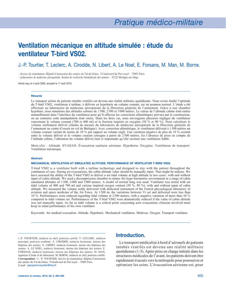 Pratique médico-militaire Ventilation mécanique en altitude simulée : étude du ventilateur T-bird VS02. J.-P. Tourtier, T. Leclerc, A. Cirodde, N. Libert, A. Le Noel, E. Forsans, M. Man, M. Borne. – Service de réanimation, Hôpital d’instruction des armées du Val-de-Grâce, 74 boulevard du Port royal – 75005 Paris. – Laboratoire de médecine aérospatiale, Institut de recherche biomédicale des armées – 91223 Brétigny-sur-Orge. Article reçu le 4 août 2009, accepté le 17 août 2010. Résumé Le transport aérien de patients intubés ventilés est devenu une réalité militaire quotidienne. Nous avons étudié l’aptitude du T-bird VS02, ventilateur à turbine, à délivrer en hypobarie un volume courant, sur un poumon normal. L’étude a été effectuée au laboratoire de médecine aérospatiale de la Direction générale de l’armement. Grâce à une chambre hypobare, nous simulions des altitudes cabines de 1 500, 2 500 et 3 000 mètres. La valeur de l’altitude cabine était entrée manuellement dans l’interface du ventilateur pour qu’il effectue les corrections altimétriques prévues par le constructeur, ou au contraire cette manipulation était omise. Dans les deux cas, nous envisagions plusieurs réglages du ventilateur concernant le volume courant (700 et 400 ml) et la fraction inspirée en oxygène (50 % et 90 %). Nous calculions le volume réellement délivré (chaîne de mesure du laboratoire de médecine aérospatiale de la Direction générale de l’armement au centre d’essais en vol de Brétigny). Avec correction altimétrique, le ventilateur délivrait à 1 500 mètres un volume courant variant de moins de 10 % par rapport au volume réglé. Une variation négative de plus de 10 % existait entre le volume délivré et le volume courant consigne à partir de 2 500 mètres. En l’absence de prise en compte de l’altitude cabine, l’altération du volume délivré était si importante qu’elle excluait une ventilation fiable. Mots-clés : Altitude. EVASAN, Évacuation sanitaire aérienne. Hypobarie. Oxygène. Ventilateur de transport. Ventilation mécanique. Abstract MECHANICAL VENTILATION AT SIMULATED ALTITUDE: PERFORMANCE OF VENTILATOR T-BIRD VS02. T-bird VS02 is a ventilator built with a turbine technology and designed to stay with the patient throughout the continuum of care. During air-evacuations, the cabin altitude value should be manually input. That might be tedious. We have assessed the ability of the T-bird VS02 to deliver a set tidal volume at high altitude in two cases : with and without input of cabin altitude. We used a decompression chamber to mimic the hypo barometric environment at a range of cabin simulated altitudes of 1 500, 2 000 and 3 000 meters. A model of normal lung was used. Ventilator was tested with set tidal volume of 400 and 700 ml and various inspired oxygen content (50 %, 90 %), with and without input of cabin altitude. We measured the volume really delivered with dedicated instrument of the French physiological laboratory of aviation and space medicine of the Air Force. At 1 500 m, the variations between Vt set and delivered were less than 10 %. Performances were reduced regarding tidal volume at 2 500 meters, with a negative variation of more than 10 % compared to tidal volume set. Performances of the T-bird VS02 were dramatically reduced if the value of cabin altitude was not manually input. As far as tidal volume is a critical point concerning aero evacuations clinician involved must keep in mind performance of his own ventilator. Keywords: Air medical evacuation. Altitude. Hypobaric. Mechanical ventilation. Medevac. Oxygen. Transport ventilator. J.-P. TOURTIER, médecin en chef, praticien certifié. T. LECLERC, médecin principal, praticien confirmé. A. CIRODDE, médecin lieutenant, interne des hôpitaux des armées. N. LIBERT, médecin lieutenant, interne des hôpitaux des armées. A. LE NOEL, médecin lieutenant, interne des hôpitaux des armées. E. FORSANS, médecin lieutenant, interne des hôpitaux des armées. M. MAN, ingénieur d’étude et de fabrication. M. BORNE, médecin en chef, praticien certifié. Correspondant : J. –P. TOURTIER, Service de réanimation, Hôpital d’instruction des armées du Val-de-Grâce, 74 boulevard du Port royal – 75005 Paris. E-mail : [email protected] médecine et armées, 2010, 38, 5, 405-408 Introduction. Le transport médicalisé à bord d’aéronefs de patients intubés ventilés est devenu une réalité militaire quotidienne (1-3). Après prise en charge initiale dans les structures médicales de l’avant, les patients doivent être rapidement évacués vers la métropole pour poursuivre et optimiser les soins. L’évacuation aérienne est, pour 405 l’équipe médicale de convoyage, un véritable challenge dont l’objectif est d’assurer la continuité de surveillance et de soins digne d’un service de réanimation. La diminution de la pression barométrique en altitude, malgré la pressurisation des cabines, impose une adaptation des ventilateurs pendant le vol (4, 5). En effet l’hypobarie est responsable d’une variation des volumes (loi de Boyle et Mariotte). Face à la grande diversité des ventilateurs, il est essentiel de définir les avantages et les limites de chaque type de machine en altitude. L’enjeu est de permettre d’anticiper les contraintes pratiques d’usage d’un ventilateur dans ces conditions atypiques. Notre objectif était d’évaluer la fiabilité du ventilateur à turbine T-bird VS02 pour ventiler un patient à poumon normal, en simulant des altitudes cabines de 1 500, 2 500 et 3 000 mètres, avec ou sans correction altimétrique. Matériels et méthodes. Simulation de la ventilation. Les essais se sont déroulés sur le ventilateur VT1 Bioteck TM . Résistance et compliance du poumon artif iciel ont été modulées pour simuler un poumon normal (résistance : 5,6 cm H2O/L/min ; compliance : 50 ml/cm H 2 O). Deux vo