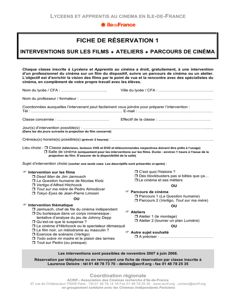 LYCEENS ET APPRENTIS AU CINEMA EN ILE-DE-FRANCE FICHE DE RÉSERVATION 1 INTERVENTIONS SUR LES FILMS ATELIERS PARCOURS DE CINÉMA Chaque classe inscrite à Lycéens et Apprentis au cinéma a droit, gratuitement, à une intervention d’un professionnel du cinéma sur un film du dispositif, suivre un parcours de cinéma ou un atelier. L’objectif est d’enrichir la vision des films par le point de vue et la rencontre avec des spécialistes du cinéma, en complément de votre propre travail avec les élèves. Nom du lycée / CFA : …………………………….. Ville du lycée / CFA : ………….……………………….. Nom du professeur / formateur : ……………………………………………………………………………….………. Coordonnées auxquelles l’intervenant peut facilement vous joindre pour préparer l’intervention : Tél : …………………………………………………………… E-mail : …..……………………………………………. Classe concernée : ………………………..…..…… Effectif de la classe : …………………………………. Jour(s) d’intervention possible(s) : …………………………………………………………………………………...… (Dans les dix jours suivants la projection du film concerné) Créneau(x) horaire(s) possible(s) (prévoir 2 heures) : …………….…………………………………...……………….. Lieu choisi : Classe (télévision, lecteurs VHS et DVD et télécommandes respectives doivent être prêts à l’usage) Salle de cinéma (uniquement pour les interventions sur les films. Durée : environ 1 heure à l’issue de la projection du film. S’assurer de la disponibilité de la salle) Sujet d’intervention choisi (cocher une seule case. Les descriptifs sont présentés ci-après) : Intervention sur les films Dead Man de Jim Jarmusch La Question humaine de Nicolas Klotz Vertigo d’Alfred Hitchcock Tout sur ma mère de Pedro Almodovar Tokyo Eyes de Jean-Pierre Limosin OU C'est quoi l'histoire ? Des blockbusters pas si bêtes que ça… Le cinéma et ses métiers OU Parcours de cinéma Parcours 1 (La Question humaine) Parcours 2 (Vertigo, Tout sur ma mère) Intervention thématique OU Jarmusch, chef de file du cinéma indépendant Ateliers Du burlesque dans un corps romanesque : Atelier 1 (le montage) tentative d’analyse du jeu de Johnny Depp Atelier 2 (tourner un plan Lumière) Qu’est-ce que le suspense ? Le cinéma d’Hitchcock ou le spectateur démasqué OU Le film noir, un mélodrame au masculin ? Autre sujet souhaité Exercice de scénario (Vertigo) A préciser : ………………….……………… Todo sobre mi madre et le plaisir des larmes Tout sur Pedro (ou presque) Les interventions sont possibles de novembre 2007 à juin 2008. Réservation par téléphone ou en renvoyant une fiche de réservation par classe inscrite à Laurence Deloire : tél 01 48 78 73 70 - [email protected] - fax 01 48 78 25 35 Coordination régionale ACRIF– Association des Cinémas recherche d’Ile-de-France 57 rue de Châteaudun 75009 Paris . Tél 01 48 78 14 18 Fax 01 48 78 25 35 . www.acrif.org . [email protected] en groupement solidaire avec les Cinémas Indépendants Parisiens LYCEENS ET APPRENTIS AU CINEMA EN ILE-DE-FRANCE INTERVENTIONS SUR LES FILMS DU DISPOSITIF Les interventions sur les films du dispositif aborderont, selon les intervenants et votre demande : • le contexte de la création de l’œuvre, • le réalisateur, • une analyse filmique, • les influences du réalisateur, • les héritiers du réalisateur. Les intervenants sont des professionnels du cinéma : réalisateurs, critiques, universitaires, scénaristes, techniciens, … Il est important pour les élèves que l’intervention ait lieu dans les dix jours suivants la projection du film. N’oubliez pas de réserver à l’avance. INTERVENTIONS THÉMATIQUES Si vous souhaitez prolonger votre propre travail sur un film avec les élèves, nous vous proposons aussi des interventions plus thématiques. À PARTIR DE DEAD MAN DE JIM JARMUSCH Jarmusch, chef de file du cinéma indépendant par Nachiketas Wignesan Jim Jarmusch est tout simplement le père du cinéma indépendant moderne suivant une tradition qui a toujours existé mais qu’Hollywood étouffe dès qu’il le peut. Jarmusch fait des films inhabituels aux rythmes lancinants -au détriment de la narration et des habitudes des spectateurs- depuis les années 80, sans doute à l’époque où le cinéma fut le plus formaté depuis l’ère classique. L’auteur de Dead Man reprend les avancées de réalisateurs indépendants tels que John Cassavetes, Dennis Hooper, Martin Scorsese, etc. qui permirent l’avènement de réalisateurs indépendants qui oseront faire du cinéma à la suite des premiers succès de Jarmusch. Citons : Spike Lee, Gus Van Sant, James Gray, Todd Haynes, Joel & Ethan Coen, Larry Clark, Ang Lee, Todd Solondz, Abel Ferrara, Quentin Tarantino, David Lynch, Robert Rodriguez, Tom DiCillo, etc. Ces réalisateurs nés dans le giron indépendant seront tous approchés par les sirènes d’Hollywood avant de retrouver leur indépendance artistique et financière. Nous reviendrons sur la biographie et l’œuvre de Jarmusch et l’analyse de ses films ainsi que des meilleurs films indépendants américains contemporains des réalisateurs déjà cités. Du burlesque dans un corps romanesque : tentative d’analyse du jeu de Johnny Depp par David Elkaïm Johnny Depp, c’est Jack Sparrow, le pirate des Caraïbes, gros succès « entairtenment » des dernières années. Mais c’est aussi, depuis longtemps, le comédien fétiche de Tim Burton, cinéaste en marge de l’industrie Hollywoodienne. Et le Bill Blake de Dead Man de Jim Jarmusch, cinéaste confidentiel dans son pays. Johnny Depp passe d’un film à l’autre, d’un genre à l’autre, tel un funambule, imposant, dans un ci