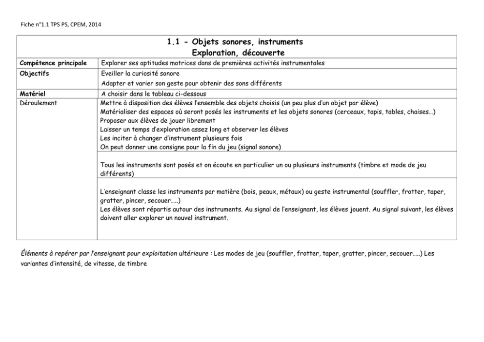 Fiche n°1.1 TPS PS, CPEM, 2014 1.1 - Objets sonores, instruments Exploration, découverte Compétence principale Explorer ses aptitudes motrices dans de premières activités instrumentales Objectifs Eveiller la curiosité sonore Adapter et varier son geste pour obtenir des sons différents Matériel Déroulement A choisir dans le tableau ci-dessous Mettre à disposition des élèves l’ensemble des objets choisis (un peu plus d’un objet par élève) Matérialiser des espaces où seront posés les instruments et les objets sonores (cerceaux, tapis, tables, chaises…) Proposer aux élèves de jouer librement Laisser un temps d’exploration assez long et observer les élèves Les inciter à changer d’instrument plusieurs fois On peut donner une consigne pour la fin du jeu (signal sonore) Tous les instruments sont posés et on écoute en particulier un ou plusieurs instruments (timbre et mode de jeu différents) L’enseignant classe les instruments par matière (bois, peaux, métaux) ou geste instrumental (souffler, frotter, taper, gratter, pincer, secouer…..) Les élèves sont répartis autour des instruments. Au signal de l’enseignant, les élèves jouent. Au signal suivant, les élèves doivent aller explorer un nouvel instrument. Éléments à repérer par l’enseignant pour exploitation ultérieure : Les modes de jeu (souffler, frotter, taper, gratter, pincer, secouer…..) Les variantes d’intensité, de vitesse, de timbre Fiche n°1.1 TPS PS, CPEM, 2014 Action frotter secouer Taper, appuyer rouler gratter souffler retourner déchirer chiffonner Pincer Effleurer Instrument de musique* Ou objet destiné à produire du son guiro percussions à peau, bol tibétains Maracas, hochets, sonnailles, grelots, cloches, sistres, castagnettes à manche, boîte à tonnerre Tambours, djembé,tam tam, percussions diverses, instruments à clavier Petits trains à musique. boomhackers Guitare, instruments à peau (ongles) Flûte, sifflets, appeaux, harmonica, ocarinas, flûte à coulisse Boîte à « meuh » ou à » bê », bâton de pluie, ocean drum Guitare banjo, cithare…. Chimes, carillon Objets de toutes sortes (détournés de leur utilisation première) Liste non exhaustive Papier de verre, tissus, bouteille en plastique cannelée, coquillages, brosses… Salière, boîtes pleines de différents objets ou matière, bracelet… Toute sorte d’objets, boîtes, tonneaux, barils, cuillères… Train, voiture, vélo … jouets roulants, boîtes de conserve, boules en bois, balles de ping-pong. Varier les supports : parquet, carrelage, moquette… Carton, tissus, supports variés, gaine électrique Bouteilles, cônes, tubes divers Boîtes pleines de différents objets ou matières Papier, Carton. tissus Papier, feuille d’aluminium Cordes tendues Mobiles sonores, arbres sonores, Ne pas hésiter à récupérer de vieux instruments de musique ou à construire des instruments avec des matériaux de récupération Bibliographie : « Musique à construire » Agnès Chaumié Ed. Enfance et musique Parties du corps Peau mains Mains, pieds, joues, torse, cuisses peau Bouche, mains Fiche n°1.1 TPS PS, CPEM, 2014 Compétence principale 1.2 - Objets sonores, instruments Son / silence Maîtriser son geste (jouer / ne pas jouer) Objectif Produire du son et s’arrêter Matériel Instruments, objets sonores (un par élève, éviter les grelots, cymbalettes….) Déroulement Etape 1 Après une phase de manipulation, présenter aux élèves le signal. Les élèves jouent de leur instrument. Au signal, les élèves arrêtent de jouer (…on écoute le silence…) Le signal doit évoluer au fur et à mesure de l’année : commencer par un signal sonore et visuel très perceptible. On peut ensuite ne choisir que le signal visuel (mains ouvertes/mains fermées, lumière allumée/lumière éteinte) Etape 2 en 2 équipes d’instruments différents, chacun joue et doit s’arrêter au signal. L’élève qui joue sur le temps de silence dépose son instrument dans un panier. L’équipe qui a conservé le plus d’instruments en fin de partie a gagné. Fiche n°1.1 TPS PS, CPEM, 2014 1.3 - Changer le mode de jeu change le son Compétence principale Explorer ses aptitudes motrices dans de premières activités instrumentales Objectifs Explorer, découvrir et pratiquer différents modes de jeu Matériel Objets sonores et instruments Déroulement 1ère situation : on part du même instrument avec des gestes différents Chaque élève prend un instrument, et cherche une manière d’en jouer (taper, frotter, gratter, …) (Aucune mailloche ni autre outil percuteur n’est distribué aux élèves pour ne pas induire le seul geste de « frapper ») L’enseignant repère et choisit un élève dont le geste est clair, et propose aux autres de reproduire ce geste Le geste est décrit oralement (on tape, on frotte, on gratte, …) On reprend ce même déroulement pour repérer un autre geste, sur le même instrument Jouer au jeu « Kim mode de jeu », « Facteur musical » 2ème situation : on fait le même geste sur des instruments différents Les élèves choisissent un instrument L’enseignant leur demande de réaliser un geste découvert dans la 1ère situation (on tape, on frotte, on gratte, …) On reprend ce même déroulement sur un autre instrument Jouer à « Joue comme moi » 3ème situation : on joue en utilisant l’instrument et le mode de jeu que l’on choisit Chaque élève choisit un instrument, et choisit le mode de jeu qu’il souhaite Les élèves se regroupent par mode de jeu Ils jouent quand l’enseignant leur fait signe, et arrêtent quand ce n’est pas leur tour (cf son/silence) Fiche n°1.1 TPS PS, CPEM, 2014 1.4 - Objets sonores, instruments Intensité Compétence principale Maîtriser son geste Objectifs Produire un son fort ou faible (forte / piano) Matériel Déroulement Instruments, objets sonores Etape 1 : L’enseignant fait écouter une chanson en augmentant ou baissant le 