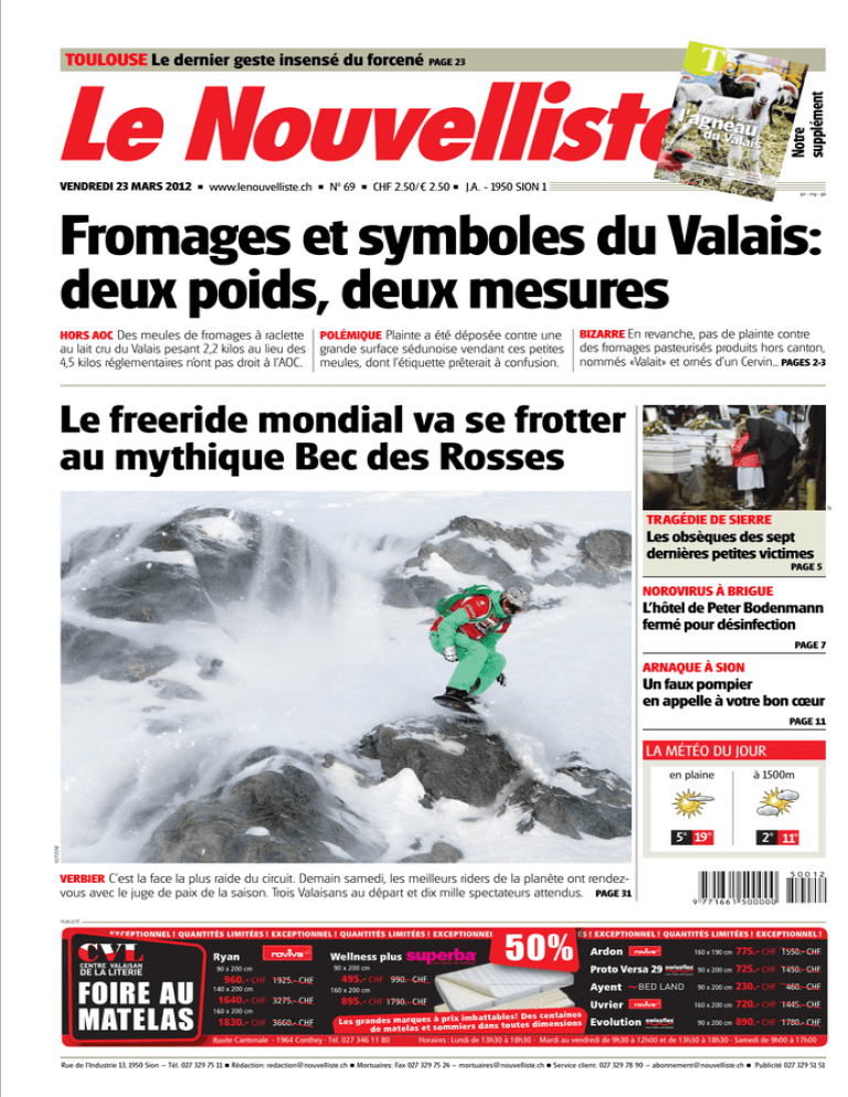 Notre supplément TOULOUSE Le dernier geste insensé du forcené PAGE 23 VENDREDI 23 MARS 2012 www.lenouvelliste.ch N0 69 CHF 2.50/€ 2.50 J.A. - 1950 SION 1 jpr - mg - gb Fromages et symboles du Valais: deux poids, deux mesures HORS AOC Des meules de fromages à raclette POLÉMIQUE Plainte a été déposée contre une au lait cru du Valais pesant 2,2 kilos au lieu des grande surface sédunoise vendant ces petites 4,5 kilos réglementaires n’ont pas droit à l’AOC. meules, dont l’étiquette prêterait à confusion. BIZARRE En revanche, pas de plainte contre des fromages pasteurisés produits hors canton, nommés «Valait» et ornés d’un Cervin... PAGES 2-3 AP Le freeride mondial va se frotter au mythique Bec des Rosses TRAGÉDIE DE SIERRE Les obsèques des sept dernières petites victimes PAGE 5 NOROVIRUS À BRIGUE L’hôtel de Peter Bodenmann fermé pour désinfection PAGE 7 ARNAQUE À SION Un faux pompier en appelle à votre bon cœur PAGE 11 KEYSTONE LA MÉTÉO DU JOUR en plaine à 1500m 5° 19° 2° 11° VERBIER C’est la face la plus raide du circuit. Demain samedi, les meilleurs riders de la planète ont rendez- vous avec le juge de paix de la saison. Trois Valaisans au départ et dix mille spectateurs attendus. PAGE 31 PUBLICITÉ EXCEPTIONNEL ! QUANTITÉS LIMITÉES ! EXCEPTIONNEL ! QUANTITÉS LIMITÉES ! EXCEPTIONNEL ! QUANTITÉS LIMITÉES ! EXCEPTIONNEL ! QUANTITÉS LIMITÉES ! EXCEPTIONNEL ! Ryan 90 x 200 cm FOIRE AU MATELAS 960.- CHF 1925.- CHF 140 x 200 cm 1640.- CHF 3275.- CHF 160 x 200 cm 1830.- CHF 3660.- CHF 50% Wellness plus Proto Versa 29 90 x 200 cm 495.- CHF 990.- CHF 160 x 200 cm Ardon <wm>10CAsNsjY0MDA20zUzMzQwNwIAamsXsQ8AAAA=</wm> <wm>10CFWLMQ6DQAwEX-TTrpezRVxGdIgC0V8Tpeb_FYQuxTSjmXWt3vDwXrZj2YuAwiKI9MpZLcHixJbygpwO-otkoEfnX28K4Bbj1xhkzkEaZZwHoXHPehwnZDs_3wvwxUbNgAAAAA==</wm> Ayent A BED LAND 895.- CHF 1790.- CHF Uvrier attables! Des centaines Les grandes marques à prix imb s toutes dimensions dan rs de matelas et sommie Evolution Route Cantonale · 1964 Conthey · Tél. 027 346 11 80 160 x 190 cm 775.- CHF 1550.- CHF 90 x 200 cm 725.- CHF 1450.- CHF 90 x 200 cm 230.- CHF 460.- CHF 160 x 200 cm 720.- CHF 1445.- CHF 90 x 200 cm 890.- CHF 1780.- CHF Horaires : Lundi de 13h30 à 18h30 · Mardi au vendredi de 9h30 à 12h00 et de 13h30 à 18h30 · Samedi de 9h00 à 17h00 Rue de l’Industrie 13, 1950 Sion – Tél. 027 329 75 11 Rédaction: [email protected] Mortuaires: Fax 027 329 75 24 – [email protected] Service client: 027 329 78 90 – [email protected] Publicité 027 329 51 51 VENDREDI 23 MARS 2012 LE NOUVELLISTE jpr - gb 2 GRAND ANGLE FROMAGES Cervin, mazot, vache, étoiles... Tout ce qui est rouge et blanc n’est pas La force de l’image et la FRANCE MASSY «A l’âge de 7 ans déjà, je raclais des fromages d’alpages dans le restaurant de mes parents. C’est dire si je suis attaché aux fromages valaisans. Je me suis battu pour l’AOC Raclette du Valais, car raient induire le consommateur en erreur et lui faire penser que c’est un fromage AOC.» Pour Claude Luisier, dénoncer un groupe de distribution suisse qui fait la part belle aux spécialités régionales est surprenant. «Les dénonciateurs devraient plu- Claude Luisier râcle depuis des décennies des meules classiques de 4,5 kilos. Toutefois, il produit aujourd’hui des meules plus petites, de 2,2 kilos, convenant mieux, dit-il, aux besoins des familles actuelles. Claude Luisier veut promouvoir des produits valaisans exceptionnels, mais l’étiquette de ses fromages au lait cru d’alpages ne peut cependant utiliser des symboles typiquement valaisans. LDD suis battu pour «l’AOCJe meRaclette du Valais. Mais aujourd’hui, je déchante.» CLAUDE LUISIER AFFINEUR j’ai toujours cru aux qualités exceptionnelles de nos fromages. Aujourd’hui, je déchante car l’AOC pose des barrières qui frisent parfois le ridicule», Claude Luisier, affineur de son état n’est pas content du tout. En cause, une dénonciation du 24 février 2012 – auprès du Labora- tôt se pencher sur les étiquettes de Valait qui utilise non seulement une seule lettre pour se différencier du canton mais encore un Cervin en arrière plan pour vendre des produits qui pour certains sont fabriqués à l’extérieur du Valais avec du lait pasteurisé. Là on se trouve vraiment devant une confusion laboratoire «doitLes’assurer que le consommateur ne soit pas trompé…» Une AOC trop rigide? ELMAR PFAMMATTER CHIMISTE CANTONAL toire cantonal – d’une publicité Manor présentant entre autres, ses fromages d’alpages «easyraclette». La guerre des étiquettes Le texte «Raclette sélection Luisier, affiné trois mois min., Suisse. A base de lait cru de vache du Valais, un arôme intense et authentique» a dérangé certains. Qui? Claude Luisier ne le sait pas. Il sait par contre que c’est l’association de son nom de famille + affineur + Raclette + Valais qui chamboule. «Contrairement à d’autres, je n’utilise ni un mazot, ni un Cervin pour mon logo. Mais il paraît que Raclette sélection Luisier + lait cru de vache du Valais pour- qui nuit à l’image du canton.» L’affineur déclare respecter les règles sur ses propres étiquettes en ne mentionnant plus le lieu d’origine ni le nom Valais, ni bien sûr le drapeau valaisan. «Ça n’a pas eu d’impact sur mes ventes. A Paris, où j’exporte régulièrement mes fromages, la mention de fromage à raclette d’Alpes Suisses est tout aussi vendeur que le mot Valais. Mais pour le Valaisan que je suis, c’est dur à avaler.» L’affaire se termine tout de même bien, car le bon sens a incité le Laboratoire cantonal à classer l’affaire sans suite pour Claude Luisier, le distributeur en étant quitte avec un avertissement et une amende. Des règles claires Pour Elmar Pfammatter, chimiste cantonal, les règles sur la législation des denrées alimen- taires tout comme les cahiers des charges des produits AOC ou IGP sont assez clairs: 