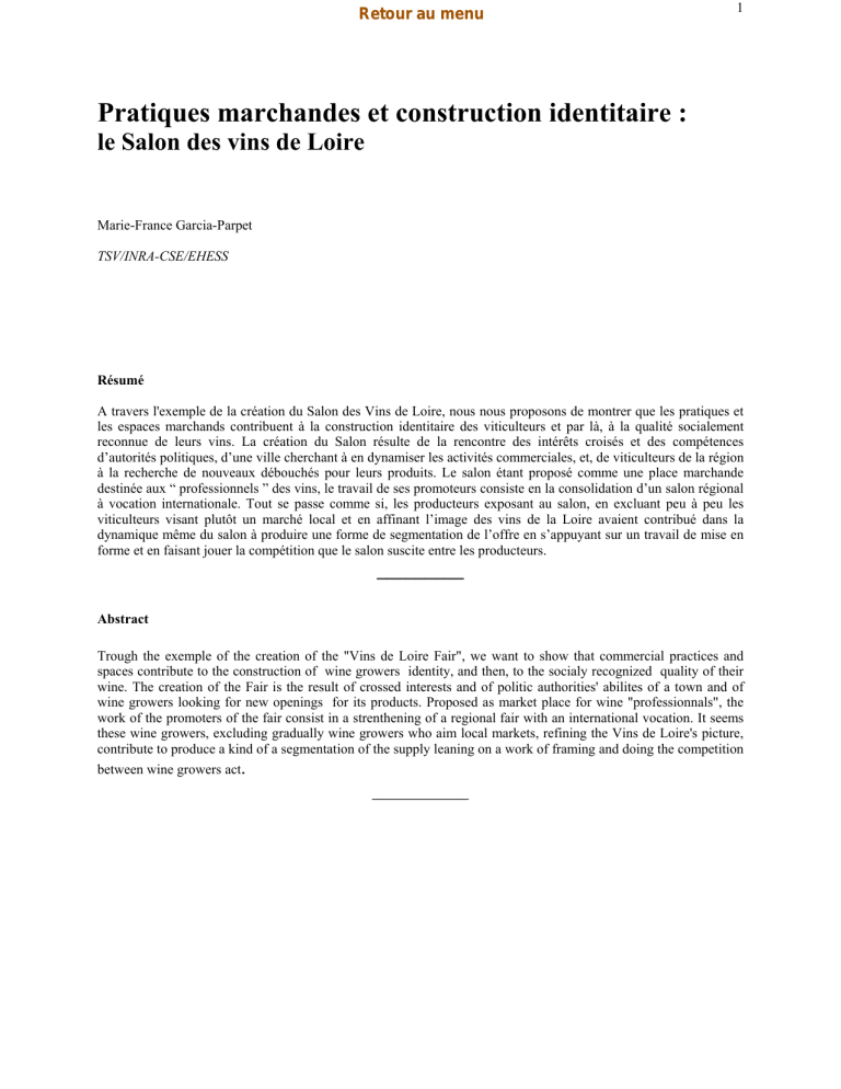 Retour au menu 1 Pratiques marchandes et construction identitaire : le Salon des vins de Loire Marie-France Garcia-Parpet TSV/INRA-CSE/EHESS Résumé A travers l'exemple de la création du Salon des Vins de Loire, nous nous proposons de montrer que les pratiques et les espaces marchands contribuent à la construction identitaire des viticulteurs et par là, à la qualité socialement reconnue de leurs vins. La création du Salon résulte de la rencontre des intérêts croisés et des compétences d’autorités politiques, d’une ville cherchant à en dynamiser les activités commerciales, et, de viticulteurs de la région à la recherche de nouveaux débouchés pour leurs produits. Le salon étant proposé comme une place marchande destinée aux “ professionnels ” des vins, le travail de ses promoteurs consiste en la consolidation d’un salon régional à vocation internationale. Tout se passe comme si, les producteurs exposant au salon, en excluant peu à peu les viticulteurs visant plutôt un marché local et en affinant l’image des vins de la Loire avaient contribué dans la dynamique même du salon à produire une forme de segmentation de l’offre en s’appuyant sur un travail de mise en forme et en faisant jouer la compétition que le salon suscite entre les producteurs. _________ Abstract Trough the exemple of the creation of the "Vins de Loire Fair", we want to show that commercial practices and spaces contribute to the construction of wine growers identity, and then, to the socialy recognized quality of their wine. The creation of the Fair is the result of crossed interests and of politic authorities' abilites of a town and of wine growers looking for new openings for its products. Proposed as market place for wine "professionnals", the work of the promoters of the fair consist in a strenthening of a regional fair with an international vocation. It seems these wine growers, excluding gradually wine growers who aim local markets, refining the Vins de Loire's picture, contribute to produce a kind of a segmentation of the supply leaning on a work of framing and doing the competition between wine growers act. __________ Retour au menu 2 Le champ viticole français est constitué de telle manière que les stratégies des producteurs sont structurées par leur appartenance ou non à une Appellation d’Origine Contrôlée, qui elle-même dépend de la notoriété de la région où elle est située. Le travail de valorisation des vins relève donc à la fois, des soins apportés par le producteur à sa propre production et à la gestion de son exploitation, et de la mise en valeur des constellations constituées par les appellations et les régions, dans laquelle sont impliqués les autres producteurs, les professionnels du vin, les représentations des organisations professionnelles et les autorités locales ou régionales (Bartoli, 1990 ; Boyer, 1990). La compétition se joue, entre autres, à travers l’imposition et l’institutionnalisation des différentes formes de vente de vins (vente aux enchères, négoce, vente directe, foires, grande distribution, etc) qui constituent, elles aussi, des supports de légitimité qui confèrent aux produits des profits symboliques et économiques. Il en est du vin comme des produits artistiques ou littéraires qui sont autant l'œuvre des producteurs que des commerçants, des éditeurs, que des critiques ou des prescripteurs, etc. Le commerçant d'art comme le négociant en vins n'est pas seulement celui qui procure à l'œuvre ou à la bouteille de vin une valeur commerciale en les mettant en rapport avec un certain marché, il est celui qui peut proclamer la valeur de l'auteur ou du producteur qu'il défend (Bourdieu, 1977). La valorisation des vins les plus prestigieux (Bordeaux, Champagne, Bourgogne) est liée, entre autres, à la présence de négociants puissants et d’événements symboliquement et économiquement mondialement connus dans les milieux œnophiles comme la vente aux enchères annuelle des Hospices de Beaune ou les enchères de Christie’s. La valorisation des vins du Val de Loire qui occupent traditionnellement une place beaucoup plus modeste dans la hiérarchie des vins, n’a pas obéi à la même logique que celle des vins les plus prestigieux. Elle n’a pas mis en jeu l’intervention de négociants, pour la plupart originaires de la région nantaise où les appellations sont moins valorisées et ne disposent pas d’un capital symbolique à la mesure des autres producteurs prétendant accéder à une plus grande notoriété œnologique. La commercialisation la plus valorisante résulte le plus souvent de la pratique de la vente directe, vente à la propriété, exposition sur les foires locales ou sur les salons destinés au grand public qui regroupent une clientèle en fonction de critères externes au champ œnologique - “ Salon des caves particulières ”, association qui regroupe ses adhérents sur le principe de contrôle par le producteur de tout le processus de production, "salons d’agriculture biologique", etc…- et de la construction de réseaux souvent caractérisés par une dénégation de l’aspect commercial. C’est le cas notamment dans l’appellation Chinon où une confrérie constitue un élément clef pour la création de réseaux commerciaux sur le plan national, voire international (Garcia-Parpet, 2000). L’ensemble de ces pratiques n’est pas en mesure d’assurer aux producteurs des vins de Loire une présence plus significative sur le marché mondial des vins de qualité, à un moment où la concurrence internationale est exacerbée par la stagnation de la consommation des pays traditionnellement producteurs de vins, par la montée en puissance de la production des pays du “ Nouveau Monde ” (Montaigne, 2002) et l’émergence dans l’espace viticole français des vins de région du Languedoc-Roussillon dynamisée, entre autres, par une recomposition sociale des produ