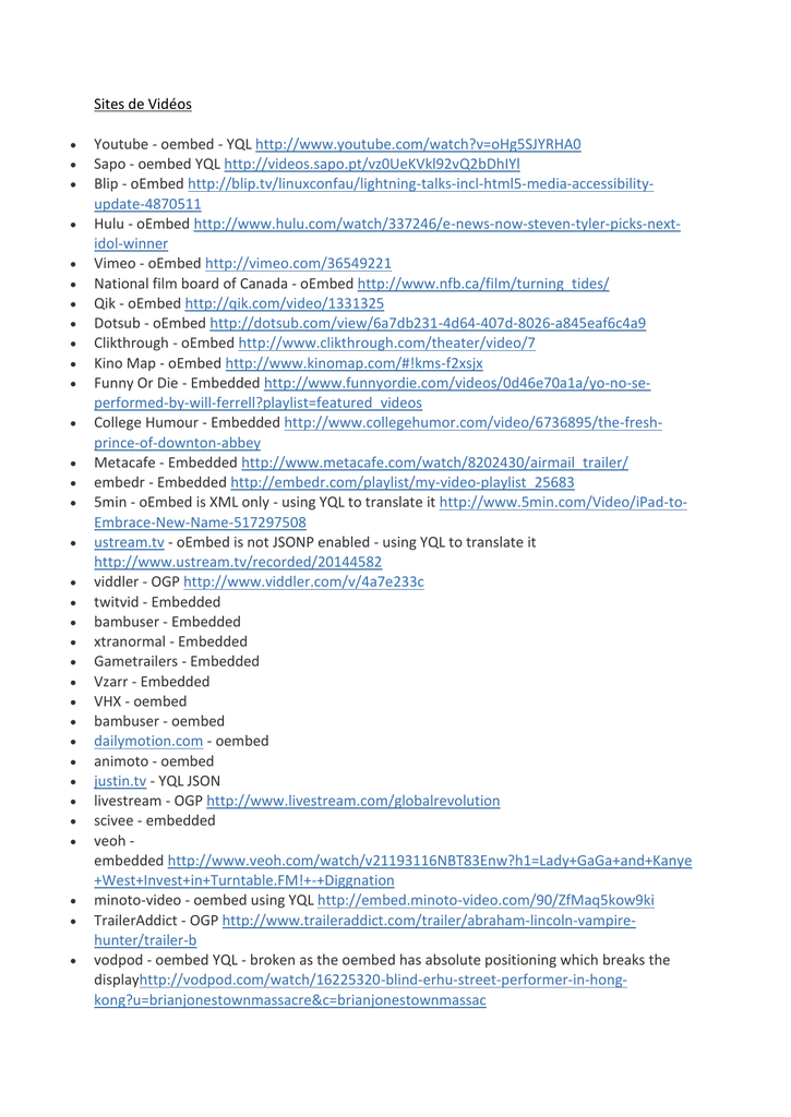 Sites de Vidéos Youtube - oembed - YQL http://www.youtube.com/watch?v=oHg5SJYRHA0 Sapo - oembed YQL http://videos.sapo.pt/vz0UeKVkl92vQ2bDhIYl Blip - oEmbed http://blip.tv/linuxconfau/lightning-talks-incl-html5-media-accessibilityupdate-4870511 Hulu - oEmbed http://www.hulu.com/watch/337246/e-news-now-steven-tyler-picks-nextidol-winner Vimeo - oEmbed http://vimeo.com/36549221 National film board of Canada - oEmbed http://www.nfb.ca/film/turning_tides/ Qik - oEmbed http://qik.com/video/1331325 Dotsub - oEmbed http://dotsub.com/view/6a7db231-4d64-407d-8026-a845eaf6c4a9 Clikthrough - oEmbed http://www.clikthrough.com/theater/video/7 Kino Map - oEmbed http://www.kinomap.com/#!kms-f2xsjx Funny Or Die - Embedded http://www.funnyordie.com/videos/0d46e70a1a/yo-no-seperformed-by-will-ferrell?playlist=featured_videos College Humour - Embedded http://www.collegehumor.com/video/6736895/the-freshprince-of-downton-abbey Metacafe - Embedded http://www.metacafe.com/watch/8202430/airmail_trailer/ embedr - Embedded http://embedr.com/playlist/my-video-playlist_25683 5min - oEmbed is XML only - using YQL to translate it http://www.5min.com/Video/iPad-toEmbrace-New-Name-517297508 ustream.tv - oEmbed is not JSONP enabled - using YQL to translate it http://www.ustream.tv/recorded/20144582 viddler - OGP http://www.viddler.com/v/4a7e233c twitvid - Embedded bambuser - Embedded xtranormal - Embedded Gametrailers - Embedded Vzarr - Embedded VHX - oembed bambuser - oembed dailymotion.com - oembed animoto - oembed justin.tv - YQL JSON livestream - OGP http://www.livestream.com/globalrevolution scivee - embedded veoh embedded http://www.veoh.com/watch/v21193116NBT83Enw?h1=Lady+GaGa+and+Kanye +West+Invest+in+Turntable.FM!+-+Diggnation minoto-video - oembed using YQL http://embed.minoto-video.com/90/ZfMaq5kow9ki TrailerAddict - OGP http://www.traileraddict.com/trailer/abraham-lincoln-vampirehunter/trailer-b vodpod - oembed YQL - broken as the oembed has absolute positioning which breaks the displayhttp://vodpod.com/watch/16225320-blind-erhu-street-performer-in-hongkong?u=brianjonestownmassacre&c=brianjonestownmassac fora.tv -OGP YQL http://fora.tv/2011/09/21/GENERATOR_Turntablefm_Discussion__Demonstration TED - OGP YQL http://www.ted.com/talks/scott_summit_beautiful_artificial_limbs.html Aniboom - embedded http://www.aniboom.com/animation-video/187178/The-Flower/ Comedy Central - OGP http://www.comedycentral.com/video-clips/qdybr3/cc-studios-tinyhands-tiny-hands--glove-shopping snotr - embedded http://www.snotr.com/video/9125/Fun_at_work zapiks - OGP http://www.zapiks.com/teva-slopestyle-2012.html youku - embedded http://v.youku.com/v_show/id_XMzgxNzY3NTU2.html wistia - Oembed http://home.wistia.com/m/NI3bSQ Vine - template regex Boxoffice Buz - template regex http://boxofficebuz.com ClipSyndicate - template regex http://clipsyndicate.com/ Coub - template regex http://coub.com/ Discoverychannel - template regex http://discovery.com/ Minilogs - template regex http://minilogs.com/ Telly - template regex http://telly.com/ Viddy - template regex http://viddy.com/ Worldstarhiphop - template regex http://worldstarhiphop.com/ Zapiks - template regex http://www.zapiks.fr/ Sites Audio Soundcloud - oEmbed HuffDuffer - oEmbed BandCamp - YQL and Embedded http://clearsoulforces.bandcamp.com/album/detroitrevolution-s- Seems to be broken podomatic - OGP http://wahwah.podomatic.com/ rdio.com - oEmbed hark.com - OGP http://www.hark.com/clips/bgqbwlkvwb-your-king-is-a-vile-bag-of-filth chirb.it - YQL and oembed official.fm - YQL and oembed mixcloud - YQL and oembed shoudio - oembed audioboo.fm - OGP http://audioboo.fm/boos/710079-geofencing-and-the-future Spotify - Oembed http://open.spotify.com/album/1YwzJz7CrV9fd9Qeb6oo1d Chirbit - template regex http://www.chirbit.com/ Sites d'images et de photos flickr - oEmbed photobucket - oEmbed instagram - oEmbed yfrog - oEmbed 23HQ - oEmbed Smugmug - oEmbed twitpic - OGP YQL http://twitpic.com/8wpcby 500px.com - OGP http://500px.com/photo/5926615 visual.ly - YQL Lookup img.ly - Thumbnail view http://img.ly/fwVM imgur.com - Thumbnail view http://imgur.com/gallery/t4i8O twitgoo.com - Thumbnail view http://twitgoo.com/5met93 gravatar - Thumbnail view when using mailto:[email protected] pinterest - YQL - Embedded view of a sort. http://pinterest.com/pin/147422587771702052/ circuitlab - image view https://www.circuitlab.com/circuit/z242cn/555-timer-as-pulse-widthmodulation-pwm-generator/ skitch - YQL oembed http://skitch.com/sethferreira/nmbr8/the-kings-new-toy graphic.ly - OGP http://graphicly.com/eldritch/eldritch/2 dribble - jsonp lookup http://dribbble.com/shots/464661-Rebounding-Station-Shot Lockerz - YQL lookup http://lockerz.com/d/5504214 AsciiArtFarts - YQL Lookup http://www.asciiartfarts.com/20111016.html lego cusoo - OGP over YQL http://lego.cuusoo.com/ideas/view/96 plannary - OGP over YQL http://svihackathon3.plannary.com/ propic - OGP http://propic.com/254 avairy.com - OGP http://advanced.aviary.com/artists/jas7229/creations/glowing_orb lomography - ogp http://www.lomography.com/photos/cameras/3334141-lomo-lcwide/popular/14660387 weheartit - ogp http://weheartit.com/entry/26832936 glogster - ogp http://www.glogster.com/lacocom/glog/g-6m025lt047et8od1f3iona0 chart.ly - embedded http://chart.ly/v3eemh9 twitrpix - OGP http://twitrpix.com/l39c chictopia - OGP http://www.chictopia.com/photo/show/641423-homeless-black-leathervintage-shorts-beige-forever-21-jacket Achewood - template regex http://achewood.com/ Fotokritik - template regex http://fotokritik.com/ Giflike - template regex http://giflike.com Autres sites Meetup - oEmbed gigapans - Embedded Slideshare - oEmbed ebay - Embedded scribd - Embedded screenr - Embedded tumblr- JSONP lookup imdb - JSONP lookup via imdbapi.com wikipedia- JSONP lookup github- JSONP lookup (CSS) https://github.com/starfishmod/jquery-oembed-all eventful - OGP http://eventful.com/brisbane/venues/rna-showgrounds-/V0-001-0004816639http://eventful.com/brisbane/event