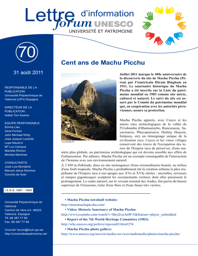 Lettre d’information ������������������������ 70 31 août 2011 RESPONSABLE DE LA PUBLICATION: Université Polytechnique de Valencia (UPV) Espagne DIRECTEUR DE LA PUBLICATION : Isabel Tort Ausina EQUIPE RESPONSABLE: Emma Lieu Irene Fornes John Michael Kirby Jose Joaquín Lorente Lupe Navarro Mª Luz Campos Marielle Richon Montse Martínez CONSULTANTS: Jose Luis Montalvá Manuel Jesús Ramírez Concha de Soto ������������������������ Cent ans de Machu Picchu Juillet 2011 marque le 100e anniversaire de la découverte du site de Machu Picchu (Pérou) par l’Américain Hiram Bingham en 1911. Le sanctuaire historique du Machu Picchu a été inscrite sur la Liste du patrimoine mondial en 1983 comme site mixte, culturel et naturel. Le suivi du site est assuré par le Comité du patrimoine mondial qui, en coopération avec les autorités péruviennes, assure sa protection. Machu Picchu apporte, avec Cuzco et les autres sites archéologiques de la vallée de l'Urubamba (Ollantautaybo, Runcuracay, Sayacmarca, Phuyupamarca, Huiñay Huayna, Intipucu, etc) un témoignage unique de la civilisation inca. Cuzco et les vieux villages ©UNESCO conservent des traces de l'occupation des terres de l'Empire inca de préserver, d'une manière plus globale, un patrimoine archéologique qui est devenu sensible aux effets de l'urbanisation. Par ailleurs, Machu Picchu est un exemple remarquable de l'interaction de l’homme avec son environnement naturel. À 2 430 m d'altitude, dans un site montagneux d'une extraordinaire beauté, au milieu d'une forêt tropicale, Machu Picchu a probablement été la création urbaine la plus stupéfiante de l'Empire inca à son apogée aux XVe et XVIe siècles : murailles, terrasses et rampes gigantesques sculptent les escarpements rocheux dont elles paraissent le prolongement. Le cadre naturel, sur le versant oriental des Andes, fait partie du bassin supérieur de l'Amazone, riche d'une flore et d'une faune très variées. I.S.S.N. 1887 - 1666 Université Polytechnique de Valencia Camino de Vera s/n. 46022 Valencia. Espagne Tlf. 96 387 77 80 Fax. 96 387 77 89 Courriel: [email protected] http://universiteetpatrimoine.net • Machu Picchu townhall website: http://munimachupicchu.com/ • Video: Historic Sanctuary of Machu Picchu: http://www.youtube.com/watch?v=BeyZxu3mW-Y&feature=player_embedded • Report of the 7th World Heritage Committee (1983): http://whc.unesco.org/archive/repcom83.htm#274 • Machu Picchu photo gallery: http://www.unesco.org/new/en/media-services/multimedia/photos/machu-picchu/ Architecture de terre Architecture de terre Nouvelles Agenda Publications Nouvelles (en italien) A.A.A. Mecenati per Pompei cercasi - Pompei (Italia) Dopo l’accordo tra il MiBAC e l’imprenditore Diego Della Valle (proprietario del marchio Tod’s) per il restauro del Colosseo, anche a Pompei, dopo la presentazione del piano di recupero dell’area archeologica, sembra affacciarsi l’ipotesi di un mecenate privato in grado di fronteggiare i costi per il recupero degli spazi. Dal crollo della Domus dei Gladiatori ad oggi, l’area archeologica campana è stata oggetto di una mappatura approfondita da parte delle facoltà di architettura dell’Università di Genova e del Politecnico di Milano, che avevano già portato avanti un lavoro analogo per l’anfiteatro Flavio, a seguito del quale è stato approvato, la scorsa settimana, un piano di intervento. Nel piano, si dichiara, verranno utilizzati 85 milioni di euro in partenza ed altri 10 successivamente, tutti provenienti da fondi europei Poin, da destinare a indagini e rilievi idrogeologici. + info: http://www.tafter.it/2011/06/22/a-a-a-mecenati-per-pompei-cercasi/ Cent ans de Machu Picchu Juillet 2011 marque le 100e anniversaire de la découverte du site de Machu Picchu (Pérou) par l’Américain Hiram Bingham en 1911. Inscrite sur la Liste du patrimoine mondial en 1983, la cité inca devient victime de son succès : la pression touristique menace la conservation du site et il est placé sous haute surveillance par le Comité en juin 2011. + info: http://www.unesco.org/new/fr/media-services/single-view/news/ one_hundred_years_of_machu_picchu/ New Global Heritage Fund Project - Marcahuamachuco - Peru The site of Marcahuamachuco was a major regional center in the Andean Early Middle Horizon period (300–700A.D.). Located in the northern Peruvian highlands of La Libertad and until recently a difficult site to reach, today a new road makes it accessible in three and a half hours from Trujillo, the third largest city on the country's Pacific coast and the location of major Moche heritage sites. The function of the site, although not fully clear, was as the seat of a ceremonial oracle, as well as a religious and political center, including turning into a burial site in its later stages. Its influence extended to all of northern Peru and contemporary southern Ecuador. Global Heritage Fund is working with the Unidad Ejecutivo Marcahuamachuco (UEM) to prepare a program of planning, conservation and community development to enable long- term site sustainability. + info: http://www.globalheritagefund.org/news/publications/ghr_2011_vol2.html Mexican Archaeologists Find Probable Prehispanic Maya Cemetery in State of Tabasco - Tabasco State- Mexico In the surroundings of Comalcalco Archaeological Zone, Tabasco, the National Institute of Anthropology and History (INAH) found 116 burials that are more than 1,000 years old; 66 of them were deposited in funerary urns while the other 50 were placed around them. The finding represents the greatest skeleton sample found in this Maya region, suggesting it could be a Prehispanic Maya cemetery. + info: http://www.artdaily.org/index.asp?int_sec=2&int_new=48684 Ossuary Belonging to a Daughter of the Caiaphas Family of High Priests Discovered http://universityandheritage.net/fra/noticias/newsletter_70/01_20