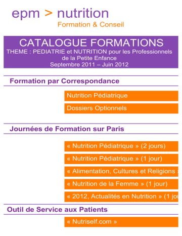 epm > nutrition Formation & Conseil CATALOGUE FORMATIONS THEME : PEDIATRIE et NUTRITION pour les Professionnels de la Petite Enfance Septembre 2011 – Juin 2012 Formation par Correspondance Nutrition Pédiatrique Dossiers Optionnels Journées de Formation sur Paris « Nutrition Pédiatrique » (2 jours) « Nutrition Pédiatrique » (1 jour) « Alimentation, Cultures et Religions » « Nutrition de la Femme » (1 jour) « 2012, Actualités en Nutrition » (1 jour Outil de Service aux Patients « Nutriself.com » Présentation d’EPM Nutrition Qui sommes-nous ? EPM Nutrition est avant tout le fruit d’une passion, celle de la Nutrition. EPM Nutrition a été conçue dans cet esprit : vous fournir la formation et les outils nécessaires à une excellente qualité de prescription nutritionnelle. EPM Nutrition est un Organisme de Formation Continue agréé, indépendant et répondant à la Charte d’Accréditation à la Formation Continue. Et pour cela, EPM Nutrition répond à plusieurs exigences : • Être indépendant pour pouvoir vous enseigner la Nutrition en toute objectivité. • Disposer d’un Comité scientifique dont les membres sont très attachés à cette qualité de Formation et dont les compétences sont variées et complémentaires en Nutrition. • Avoir une approche très concrète, alimentaire et diététique. Nos Formations et Services ne sont pas des cours de médecine : nous vous parlons d’aliments, de régimes, de conseils nutritionnels, d’idées reçues, de pratique quotidienne. Nous vous formons à prescrire des régimes avec efficacité et pertinence et à maîtriser la connaissance des aliments, des produits et des Marques. Fondateur et Directeur Dr. Laurence PLUMEY : Médecin Nutritionniste, Professeur de Nutrition à l’Ecole de Diététique de Paris, Responsable de la Consultation de Nutrition pédiatrique en prévention et traitement du surpoids de l’Enfant à l’Hôpital Necker, Paris. Fondateur et Directeur d’EPM Nutrition. Coordonnées Adresse : EPM Nutrition 11 avenue des Vignes 92210 SAINT CLOUD Tél. : Fax : 01 41 12 96 07 01 46 02 72 89 Mail : Site : Siret : N° formateur : [email protected] www.epm-nutrition.org 451 498 406 00011 1192 146 78 92 epm > nutrition Formation & Conseil Formation par Correspondance « Nutrition Pédiatrique » « En 9 mois, vous apprenez à bien savoir conseiller les parents sur l’Alimentation de leurs enfants et adolescents » Programme de la Formation Alimentation du nourrisson : Les besoins nutritionnels du nourrisson. L’allaitement maternel : impact de l’alimentation de la mère sur l’allaitement et recommandations. Lait maternel et sa composition nutritionnelle. Laits infantiles et indications. Diversification alimentaire : règles et justifications. Alimentation du jeune enfant : Les besoins nutritionnels. Les règles de l’équilibre alimentaire. En pratique médicale : comment évaluer la qualité de l’alimentation d’un enfant ? Comment dépister et corriger les troubles du comportement alimentaire ? L’enfant et certains contextes alimentaires : restauration scolaire, Fast-foods, Végétarisme, Végétalisme, Ramadan. L’enfant et le sport : Quels conseils nutritionnels ? Le surpoids de l’enfant et de l’adolescent : Approche médicale et nutritionnelle telle qu’elle est pratiquée en milieu spécialisé. L’enfant en situation pathologique : Allergies alimentaires chez l’enfant. Le diabète de type 1 et de type 2. Les dyslipidémies sévères. L’enfant sous corticothérapie. L’enfant dénutri. Pathologies digestives. La mucoviscidose. L’adolescent : Les besoins nutritionnels spécifiques et Déficiences nutritionnelles. Anorexie, boulimie : dépistage et conduite à tenir. Déroulement La Formation se déroule sur 9 mois, de Janvier à Septembre 2011. Comptez une journée et demi de travail par mois (apprentissage des cours et réponse au Test mensuel d’Auto - Evaluation des connaissances), s’y ajoute une Journée de Révision sur Paris en Septembre. Au total, comptez environ 100 heures de travail au total, à votre rythme. epm > nutrition Formation & Conseil Documents Deux Tomes - Dossiers sont envoyés en début de Formation aux stagiaires. Toutes les données ont été actualisées en 2010. Un ensemble de Fiches Régimes à remettre aux patients est également adressé aux stagiaires. Lors de la Séance Révision Collective (Septembre), une Attestation de Formation est remise aux participants. Modalités En Janvier, vous recevrez les dossiers de votre Formation par courrier. Chaque mois, vous étudierez un ou plusieurs chapitres du programme selon nos instructions et réaliserez un Test d’Evaluation des Connaissances. Fin Septembre ou début Octobre, vous serez convié(e) à la Séance de Révision Collective à Paris pour une révision ultime du programme, et vous passerez le Test final. L’Attestation vous est ensuite délivrée. Coût Le coût de la Formation s’élève à 750 € HT* . Ce coût comprend les frais d’impression et d’envoi des Dossiers, des Fiches patients, le courrier mensuel avec votre programme de travail et le test mensuel d’évaluation des connaissances, la Séance de Révision Collective et le test final. * Exonération de TVA au titre de la Formation Continue. Intervenant Dr. Laurence PLUMEY, Directeur EPM Nutrition et Médecin Nutritionniste, Professeur de Nutrition à l’Ecole de Diététique de Paris, Consultation Enfants en Surpoids Hopital Necker. Pour aller plus loin EPM Nutrition vous propose : Dossier Optionnel « Nutrition de la Femme », pour savoir conseiller les femmes enceintes et les femmes allaitantes que vous voyez également lors de vos consultations (voir programme ci-dessous). epm > nutrition Formation & Conseil Formation par Correspondance Dossiers Optionnels « Pour donner des conseils adaptés aux femmes durant ces périodes délicates que sont la grossesse, l’allaitement, la ménopause » Programme Nutriti