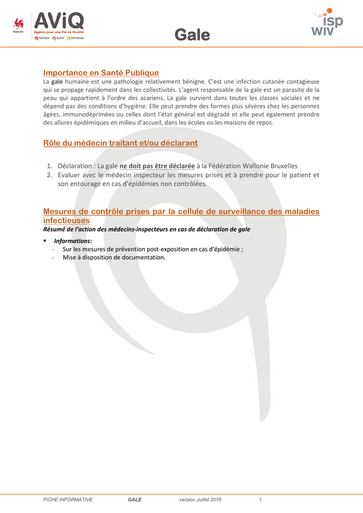 Gale Importance en Santé Publique La gale humaine est une pathologie relativement bénigne. C’est une infection cutanée contagieuse qui se propage rapidement dans les collectivités. L’agent responsable de la gale est un parasite de la peau qui appartient à l’ordre des acariens. La gale survient dans toutes les classes sociales et ne dépend pas des conditions d’hygiène. Elle peut prendre des formes plus sévères chez les personnes âgées, immunodéprimées ou celles dont l’état général est dégradé et elle peut également prendre des allures épidémiques en milieu d’accueil, dans les écoles ou les maisons de repos. Rôle du médecin traitant et/ou déclarant 1. Déclaration : La gale ne doit pas être déclarée à la Fédération Wallonie Bruxelles 2. Evaluer avec le médecin inspecteur les mesures prises et à prendre pour le patient et son entourage en cas d’épidémies non contrôlées. Mesures de contrôle prises par la cellule de surveillance des maladies infectieuses Résumé de l’action des médecins-inspecteurs en cas de déclaration de gale Informations: - Sur les mesures de prévention post-exposition en cas d’épidémie ; - Mise à disposition de documentation. FICHE INFORMATIVE GALE version Juillet 2016 1 Gale Agent pathogène Germe Provoquée par l’acarien Sarcoptes scabiei hominis. Réservoir L’hôte principal est l’homme mais le chien peut l’héberger temporairement. Résistance Physicochimique - A température ambiante, les acariens adultes ont un temps de survie moyen hors de l’hôte de 1 à 2 jours, les nymphes (larves) de 2 à 5 jours et les œufs de 10 jours ; - Destruction des adultes et des larves en quelques minutes à température supérieure ou égale à 60 °C ; - Destruction par produits acaricides après temps de contact de 12h à 24h selon les produits. Clinique Transmission Incubation Période de contagiosité Symptômes Complications - Par contact cutané direct ; Dans une moindre mesure par contact avec des vêtements, des draps et des couvertures infectés. 2 à 6 semaines (moyenne 3 semaines); 1 à 3 jours pour les « réinfestations ». Dès la phase d'incubation d’une gale commune ; Forte contagiosité avec risque de propagation directement proportionnel à la quantité de parasites présents. Gale commune : - Eruption papuleuse, prurit, nodules, vésicules, pustules, croûtes, lésions de grattage, papules érythémateuses, sillons et lésions eczématiformes ; - Présente principalement sur les mains (espaces interdigitaux), sur le pli cutané du poignet, du coude ou du genou, sur les fesses, sur la région inguinale, sur les aisselles, sur les mamelons chez la femme, sur le fourreau de la verge et sur la plante des pieds chez les nourrissons ; - Démangeaison intense sur tout le corps suite à l’infestation. Ce prurit est à recrudescence nocturne. Gale hyperkératosique (ou « norvégienne ») : - Forme plus grave de gale, extrêmement contagieuse ; - Dermatose hyperkératosique d’aspect farineux touchant les régions palmo-plantaires, unguéales, les coudes ou et les aréoles mammaires ; - Peu ou non prurigineuse ; - Elle peut simuler diverses dermatoses squameuses telles que le psoriasis, la dermite séborrhéique ou une éruption d’origine médicamenteuse. - La gale profuse est la conséquence soit d’un diagnostic tardif, soit d’un traitement inadapté par corticoïdes - Gale profuse : lésions atypiques et d’éruption papuleuse, érythémateuse et vésiculeuse. Type de gale floride et prurigineuse où les sillons sont absents. Diagnostic Diagnostic biologique Examen microscopique des prélèvements effectués sur les sillons et les vésicules. FICHE INFORMATIVE GALE version Juillet 2016 2 Gale Définition de cas de l’ECDC (European Centre for Disease Prevention and Control)1 Critères de diagnostic N/A. Cas possible N/A. Cas probable Cas confirmé Symptomatologie clinique compatible avec une des formes de gale, chez un patient dont la présence du parasite n’a pas pu être démontrée sur la peau. Diagnostic confirmé par le laboratoire (le diagnostic de laboratoire repose sur l’examen microscopique des prélèvements effectués sur les sillons et les vésicules). Epidémiologie Groupe d’âge Pas d’âge spécifique. Incidence En Belgique l’incidence est mal connue car ce n’est pas une maladie à déclaration obligatoire. Immunité Absence d’immunité naturelle ou vaccinale. Saisonnalité N/A Géographie Sex-ratio Ubiquitaire. Populations à risque Groupes à risques de développer la maladie Groupes à risque de développer des formes graves Grossesse allaitement - Personnes vivant en collectivité (milieu scolaire, maisons de retraite, foyers pour personnes sans domicile fixe, prisons, etc.) avec des personnes atteintes de gale ; - Personnes soignant des personnes atteintes de gale commune ou hyperkératosique. En particuliers en collectivités ; - Personnes ayant des contacts cutanés prolongés (>15 minutes) avec un patient atteint de gale (ex. rapports sexuels) ; - Personnes ayant un contact cutané fugace avec un patient atteint de gale hyperkératosique ou profuse ; - Les personnes ayant un contact cutané avec du matériel utilisé au préalable par un patient atteint de gale hyperkératosique ou profuse (ex. linge, draps, matériel de toilette, sièges, sanitaires, matériel médical, etc.). Personnes soumises à des facteurs de risque de contracter la gale commune ET atteinte du SIDA et/ou âgés et/ou un handicap moteur et/ou une démence et/ou un coma et/ou un diabète et/ou une incontinence et/ou une lésion cérébrale et/ou un stade terminal et/ou des cytostatiques et/ou des immunosuppresseurs (ex. corticoïdes) N/A. Prise en charge du patient Traitement Mesures d’Hygiène Principalement topique avec de la crème acaricide précédée d'un bain chaud avec savonnage soigneux. Appliquer les mesures générales d’hygiène et les mesures d’hygiène spécifiq