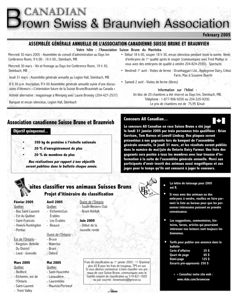 Feb ru a ry 2005 ASSEMBLÉE GÉNÉRALE ANNUELLE DE L’ASSOCIATION CANADIENNE SUISSE BRUNE ET BRAUNVIEH Votre hôte : l’Association Suisse Brune du Manitoba • Mercredi 30 mars 2005 - Assemblée du conseil d’administration au Days Inn • Début 18 h 00, souper 18 h 30, encan silencieux pendant toute la soirée. Vente Conference Room, 9 h 00 - 16 h 00., Steinbach, MB d’embryons de 1re qualité après le souper (communiquez avec Fred Mathys si vous avez des embryons de qualité à vendre 204-824-2590). Spectacle. • Mercredi 30 mars - Vin et fromage au Days Inn Conference Room, 19 h 30, Steinbach, MB • Vendredi 1er avril - Visites de ferme - Drumhaggart Ltd., Applegrove Dairy, Crikside Farm, Max & Susanne Buechi • Jeudi 31 mars - Assemblée générale annuelle au Legion Hall, Steinbach, MB • Samedi 2 avril - Visites de ferme (libres) • 8 h 30 a.m. Inscription, 9 h 00 Assemblée générale annuelle suivie d’une discussions d’éleveurs « L’orientation future de la Suisse Brune/Braunvieh au Canada » Information sur l’hôtel : Un bloc de 20 chambres a été réservé au Days Inn, Steinbach, MB. • Activité alternative : magasinage à Winnipeg avec Laurie Broesky (204-427-2537) Téléphone : 1-877-906-9200 ou 204-320-9200. • Banquet et encan silencieux, Legion Hall, Steinbach Le prix de chambres est de 75,95 $/nuit Association canadienne Suisse Brune et Braunvieh Objectif quinquennal... • 350 kg de protéine à l’échelle nationale • 20 % d’enregistrement de plus • 20 % de membres de plus Nos réalisations par rapport à nos objectifs seront publiées dans le bulletin chaque année. Concours All Canadian... Faites classifier vos animaux Suisses Bruns • Projet d’itinéraire de classification • Février 2005 Québec - Bas Saint-Laurent - Est du Québec - Saint-Francois - Howick-Huntingdon - Pontiac Est de l’Ontario - Kingston- Bellville Du District - Leed - Grenville Mars 2005 Québec - Bedford - Etchemin, est de l’Ontario - Saint-Laurent - Trent Valley Avril 2005 Québec - Etchemin/Les Érables - Les Érables - Beauce Ouest de l’Ontario - South-Western Club - Brant-Norfolk Juin 2005 - Début de la nouvelle ronde Ouest de l’Ontario - Bruce - Waterloo - Brant - Oxford Mai 2005 Québec - Saint-Hyacinthe - Lanaudière - Laurentides - Mauricie/Portneuf u Le concours All Canadian en race Suisse Brune a été jugé le lundi 31 janvier 2005 par trois personnes très qualifiées : Brian Garrison, Tom Barnes et Lowell Lindsay. Des plaques seront présentées à nos gagnants lors du banquet de l’assemblée générale annuelle, le jeudi 31 mars, et les résultats seront publiés dans le numéro de mai/juin du Ontario Dairy Farmer. Une liste des gagnants sera postée à tous les membres avec leur trousse d’information à la suite de l’assemblée générale annuelle. Merci aux participants d’avoir inscrit des animaux aussi magnifiques et aux juges pour le temps qu’ils ont consacré à juger le concours. • • Frais de classification au 1er janvier 2003 : 11 $/animal plus 65 $ pour les frais de troupeau, TPS en sus Si vous désirez commencer à faire classifier vos animaux de race Suisse Brune, communiquez avec le Comité conjoint de classification au 519-821-1020 ou par courriel : [email protected] La lettre de tatouage pour 2005 est R. Si vous avez des animaux ou des embryons à vendre, veuillez en faire parvenir la liste au bureau pour que les personnes intéressées puissent en prendre connaissance. Les suggestions, commentaires, histoires, farces, articles qui pourraient intéresser nos lecteurs sont toujours les bienvenus. Tarifs pour publier une annonce dans le bulletin Carte d’affaires 25 $ Quart de page 65 $ Demi-page 125 $ Encarts pré-approuvés 250 $ » » Consultez notre site web : www.rkde.com/browncow Rapports des clubs Suisses Bruns provinciaux Manitoba Liste des officiers de l’Association SB du Manitoba - 2005 Directeurs (mandat de trois ans) • Armin Dueck, Four Oak Farms • Fred Mathys, Swiss Dream Farms, Ltd. Président (mandat de un an) • Louis Guimond Crikside Farms, Woodmore, MB, R0A 2M0 Téléphone : 204-427-2942, Télec. : 204-427-3081 Vice-président (mandat de un an) • Armin Dueck Ontario Salutations de l’Ontario à nos collègues éleveurs Suisses Bruns et Braunvieh partout au Canada! Nous avons hâte à l’été, tout le monde en a assez de l’hiver. À notre assemblée annuelle en novembre, nous avons élu un nouveau conseil d’administration. Nos administrateurs sont Lori Bates, Mark McLean, Ernst Gubelmann, Markus Daetwyler, Bill Henhoeffer, Kevin Osborne, Amy Beischlag et Alexandra Lawlor. Hans et Margreth Signer ont invité les personnes intéressées à la Suisse Brune à une journée d’étable au printemps et nous avons hâte au pique-nique, nos hôtes cet été seront Harold et Marsha Jelinski. Chaque année, l’Association Suisse Brune de l’Ontario offre une bourse de 500 $ à un étudiant qui poursuite ses études dans le domaine agricole. La gagnante de cette année est Romy Signer. Romy étudie en 2e année du programme agricole à Guelph, elle se dirige vers la recherche dans le domaine animal. Les membres présents à l’assemblée se sont questionnés sur la façon de promouvoir la race Suisse Brune auprès des nouveaux membres. Au fil des ans, de nombreux grands éleveurs prennent leur retraite et procèdent à la dispersion de leur troupeau. Cette année, nous aimerions nous concentrer sur la façon de promouvoir la race et de répondre aux besoins des producteurs laitiers, en mettant l’association à la disposition des nouveaux éleveurs qui ont besoin d’information et de soutien. Tracy Reid Québec Le Salon international laitier 2005 : la deuxième édition est en marche! Le comité promotionnel des races laitières est fier d’annoncer que la deuxième édition du Salon international laitier aura lieu les 14 et 15 avril sur les terrains d’exposition de Saint-Hyacinthe.