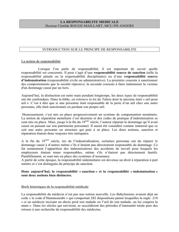 LA RESPONSABILITE MEDICALE Docteur Clotilde ROUGE-MAILLART, MCU-PH ANGERS INTRODUCTION SUR LE PRINCIPE DE RESPONSABILITE La notion de responsabilité Lorsque l’on parle de responsabilité, il est important de savoir quelle responsabilité est concernée. Il peut s’agir d’une responsabilité source de sanction (telle la responsabilité pénale ou la responsabilité disciplinaire) ou d’une responsabilité source d’indemnisation (responsabilité civile ou administrative). La première consiste à sanctionner des comportements que la société réprouve; la seconde consiste à faire indemniser la victime d'un dommage causé par un tiers. Aujourd’hui, la distinction est nette mais pendant longtemps, les deux types de responsabilité ont été confondues. Dans la bible, on retrouve la loi du Talion dont la maxime était « œil pour œil ». C’est à dire que si une personne était responsable de la perte d’un œil chez une autre personne, elle était sanctionnée en perdant son propre œil. Heureusement, s’est mis en place progressivement un système de compensation monétaire. La notion de réparation monétaire s’est dessinée et des codes de pratique d’indemnisation se sont mis en place. Mais, jusqu’à la fin du 19ème siècle, l’auteur réparait le dommage qu’il avait causé en puisant sur son patrimoine personnel. Il aurait été considéré comme immoral que ce soit une autre personne ou structure qui paie à sa place. Les deux notions, sanction et réparation étaient donc toujours très intriquées. A la fin du 19ème siècle, ère de l’industrialisation, certaines personne ont du réparer le dommage causé à d’autres même s’ils n’étaient pas directement responsable du dommage. Ce fut notamment l’apparition des indemnisations des accidents de travail pour lesquels les employeurs étaient tenus responsables, même s'ils n’étaient pas directement fautifs. Parallèlement, se sont mis en place des systèmes d’assurance. A partir de cette époque, la responsabilité indemnitaire est devenue un droit à réparation à part entière et s’est distinguée du principe de sanction. Donc aujourd’hui, la responsabilité « sanction » et la responsabilité « indemnisation » sont deux notions bien distinctes. Brefs historiques de la responsabilité médicale La responsabilité du médecin n’est pas une notion nouvelle. Les Babyloniens avaient déjà un code « le code d’Hammourabi » qui comportait 282 dispositions parmi lesquelles la règle 218 « si un médecin incisant un abcès perd son malade ou l’œil de son malade, on lui coupera la main ». Dans les siècles qui suivirent, se succédèrent des périodes d’immunité totale puis des retours à une recherche de responsabilité des médecins. Mais c’est à partir du 19ème siècle que s’est instaurée la responsabilité médicale telle qu’on la conçoit aujourd’hui. La responsabilité pénale et la responsabilité disciplinaire ont une fonction répressive. La responsabilité civile et la responsabilité administrative ont pour seul but l'indemnisation d'une victime. Ces deux aspects seront envisagés tour à tour sous les titres: responsabilitésindemnisations et responsabilités-sanctions. La profession nourrit de nombreux fantasmes en matière de responsabilité. Il s'agit pourtant d'un contentieux de très faible importance numérique, toutes les études sérieuses le démontrent. Et le nombre d'affaires n'augmente pas de manière significative, contrairement à ce qu'il est parfois prétendu. Ce qui est en augmentation c'est le nombre des déclarations de "sinistres" faites par les médecins à leurs assureurs, qui ne reflète que leur louable prudence. Mais l'immense majorité de ces déclarations ne débouche sur aucune action en justice. La "dérive à l'américaine" est l'un de ces fantasmes, et une crainte infondée compte-tenu des conditions juridiques très différentes entre les Etats-Unis et la France. D'autre part, les actions pénales, qui sont le plus à redouter, essentiellement parce que la presse en fait état, représentent à peine 10% des actions en justice Reste que, individuellement, pour le médecin qui fait l'objet d'une recherche en responsabilité, peu importe le caractère rassurant des statistiques! LA RESPONSABILITE INDEMNITAIRE Comme son nom l’indique, la responsabilité indemnitaire a uniquement une fonction indemnitaire. Elle est mise en jeu lorsque, de part son fait, une personne a entraîné un dommage. La personne responsable engage sa responsabilité dans le sens où elle doit indemniser la victime. Le but d’une responsabilité indemnitaire n’est donc pas de « punir » un responsable mais d’indemniser une victime. La responsabilité indemnitaire est une responsabilité civile lorsque l'exercice médical se fait en milieu privé (activité libérale, clinique). Il s’agit d’une responsabilité administrative lorsque l’activité est exercée en milieu hospitalier. I) LA RESPONSABILITE MEDICALE CIVILE A) Principes de la responsabilité civile La responsabilité civile peut être de deux types : délictuelle ou contractuelle. La responsabilité délictuelle est retenue lorsqu’une personne, de part son fait, a porté préjudice à une autre personne (elle lui a causé un dommage). Il n’existe aucun lien particulier entre ces deux personnes. Par exemple, un individu A renverse un individu B et lui cause un dommage (une jambe cassée). L’individu A engage sa responsabilité vis à vis de B et devra l’indemniser. La responsabilité contractuelle est mise en jeu lorsqu’un contrat a été établi entre deux personnes (avec détermination d’obligations pour chacun des contractants) et qu’un des contractants n’a pas rempli les obligations auxquelles il s’était engagé dans ce contrat. Les contrats peuvent être divers et variés. Ils ne nécessitent pas forcément de formalisme (rédaction d’un écrit) et peuvent êt