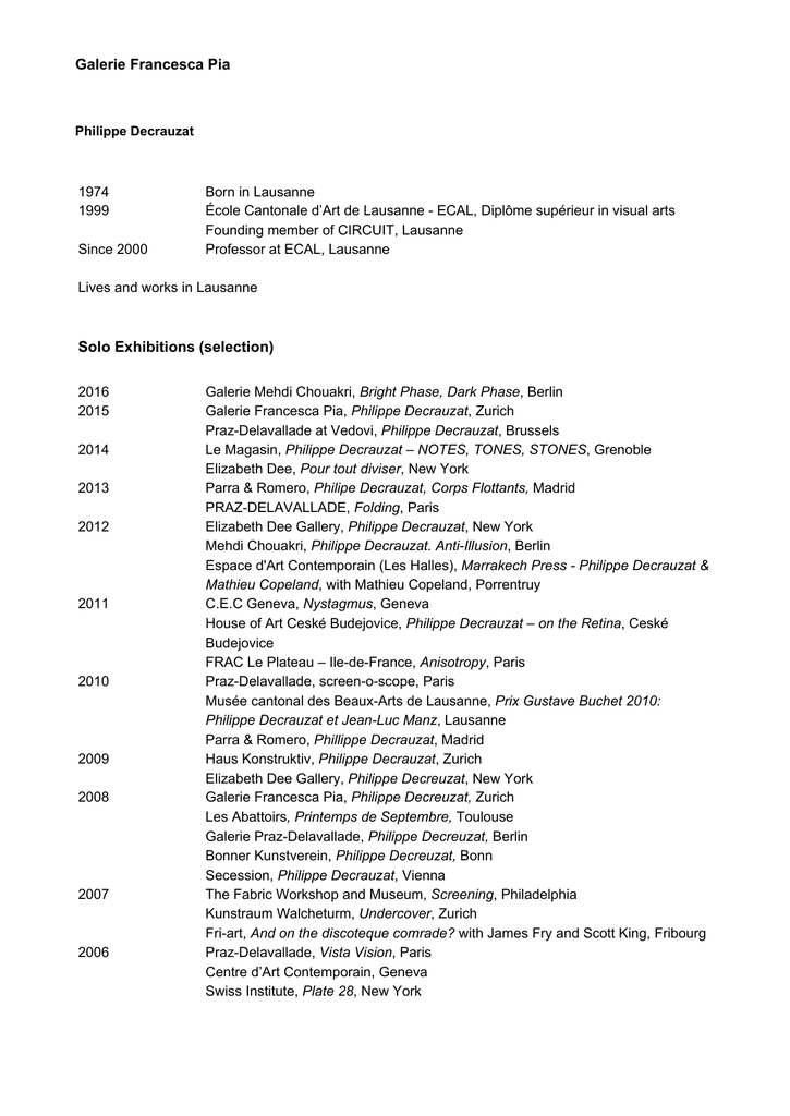 Galerie Francesca Pia Philippe Decrauzat 1974 1999 Since 2000 Born in Lausanne École Cantonale d’Art de Lausanne - ECAL, Diplôme supérieur in visual arts Founding member of CIRCUIT, Lausanne Professor at ECAL, Lausanne Lives and works in Lausanne Solo Exhibitions (selection) 2016 2015 2014 2013 2012 2011 2010 2009 2008 2007 2006 Galerie Mehdi Chouakri, Bright Phase, Dark Phase, Berlin Galerie Francesca Pia, Philippe Decrauzat, Zurich Praz-Delavallade at Vedovi, Philippe Decrauzat, Brussels Le Magasin, Philippe Decrauzat – NOTES, TONES, STONES, Grenoble Elizabeth Dee, Pour tout diviser, New York Parra & Romero, Philipe Decrauzat, Corps Flottants, Madrid PRAZ-DELAVALLADE, Folding, Paris Elizabeth Dee Gallery, Philippe Decrauzat, New York Mehdi Chouakri, Philippe Decrauzat. Anti-Illusion, Berlin Espace d'Art Contemporain (Les Halles), Marrakech Press - Philippe Decrauzat & Mathieu Copeland, with Mathieu Copeland, Porrentruy C.E.C Geneva, Nystagmus, Geneva House of Art Ceské Budejovice, Philippe Decrauzat – on the Retina, Ceské Budejovice FRAC Le Plateau – Ile-de-France, Anisotropy, Paris Praz-Delavallade, screen-o-scope, Paris Musée cantonal des Beaux-Arts de Lausanne, Prix Gustave Buchet 2010: Philippe Decrauzat et Jean-Luc Manz, Lausanne Parra & Romero, Phillippe Decrauzat, Madrid Haus Konstruktiv, Philippe Decrauzat, Zurich Elizabeth Dee Gallery, Philippe Decreuzat, New York Galerie Francesca Pia, Philippe Decreuzat, Zurich Les Abattoirs, Printemps de Septembre, Toulouse Galerie Praz-Delavallade, Philippe Decreuzat, Berlin Bonner Kunstverein, Philippe Decreuzat, Bonn Secession, Philippe Decrauzat, Vienna The Fabric Workshop and Museum, Screening, Philadelphia Kunstraum Walcheturm, Undercover, Zurich Fri-art, And on the discoteque comrade? with James Fry and Scott King, Fribourg Praz-Delavallade, Vista Vision, Paris Centre d’Art Contemporain, Geneva Swiss Institute, Plate 28, New York Galerie Francesca Pia 2005 2003 2002 2000 1998 1997 MAMCO, Komakino, Geneva Kunsthaus Baselland, nowherenow, Muttenz/Basel Synagogue de Delme - Centre d’art contemporain, General Dynamics, with Vincent Szarek & Loïc Raguenes, Delme Glassbox, That’s the image I want, Paris Le Hall, Go for a ride, Enba, Lyon Elac, Prix Manor, Lausanne Musée cantonal des Beaux Arts, Le Rez, Lausanne Temporary public space intervention, Permanent show, Lausanne Temporary public space intervention, Rien que pour vous, Lausanne Group Exhibitions (selection) 2016 2015 2014 2013 Galerie Mehdi Chouakri, In Retrospect: Good & Plenty, Berlin Honolulu Art Gallery, Honolulu Triennale, Zurich MAMCO, GVA<->JFK, Geneva Palais de Tokyo, Le Prix Jean-François Prat, Paris Circuit, Tous les tableaux sont à l'envers, Lausanne Galerie des Galeries, ALL OVER, Paris Kunstmuseum Luzern, Collectionneurs, Lucerne Kunsthalle Wien, The Promise of Total Automation, Vienna Praz-Delavallade, Pierre Ardouvin, Philippe Decrauzat, Fabien Mérelle, Amanda La Bâtie, Philippe Decrauzat & AlanParis Licht Anisotropy, Geneva Ross-Ho, Analia Saban, Jim Shaw, MACRO, Global echange: astrazione geometrica dal 1950, Rome Anatomy of the Automaton La Panacée, , Montpellier Aargauer Kunsthaus, Docking Station, Aarau Galerie Nikolaus Ruzicska, The Shadow of Your Smile, Salzburg Le Château, Explore, Rentilly Parra & Romero, Stefan Brüggemann, Philippe Decrauzat, Ibiza The New Institute,Inflected 1:1 SetsObjects for Erwin & Bekleidung, Istituto Svizzero, #1:Olaf Abstraction, MilanoRotterdam MOMA, Abstract Generation: Now in Print, New York Musée Rath, BIENS PUBLICS, Geneva Galeries Nationales du Grand Palais, Lumineux! Espace et vision dans l'art de nos jours à 1913, curated by Serge Lemoine, Paris Galerie Gouvennec Ogor, Capitale(s), Marseille MUAC, Mandala Mental, Mexico City Galerie Francesca Pia 2012 2011 2010 Municipal Art Gallery at Barnsdall Park, LOST, Los Angeles LiveinYourHead, Institut curatorial de la Head, 50 Partitions, Geneva Parra & Romero, The Beginning of Beyond, Madrid Le 19 CRAC – Centre Régional d’Art Contemporain, Au delà du tableau, Montbéliard Bischoff/Weiss, Advert, Insert, Cover, Headline... Or A Secret and Arbitrary Connection Between London and Lake Geneva, London Frac Basse-Normandie, Le blues du chien, Caen Museum of Contemporary Art, Collection Amplifiée, Rochechouart Aargauer Kunsthaus, Kubiläum Manor Kunstpreis 2012, La jeunesse est un art, Aarau Galerie Nikolaus Ruzicska, Take Off Your Silver Spurs And Help Me Pass The Time, Salzburg Gallery Elizabeth Dee, 10th Anniversary Summer Exhibition, New York La Salle de bains, Tell the Children/ Abstraction pour enfants, Lyon Kunsthalle Bern, The Old, The New, The Different, Bern Graf Mourge d’Algue, Mr. I, Geneva Museum für Gestaltung Zürich, Schwarz Weiss – Design für Gegensätze, Zurich Circuit, Play Bach, Lausanne Palais de Tokyo, Carte blanche à John M Armleder - All of the above, Paris Parra & Romero, Ventajas de Viajar en Tren, Madrid Nymphius Projekte, Philippe Decrauzat, Oliver Mosset, Paul Snowden, Berlin Cité internationale des Arts, L’Ecal à Paris, Paris Centre culturel Suisse, Echoes, Paris Frac Languedoc-Roussillon, Et pis meu là, et pis teu là!, Montpellier Académie de France à Rome - Villa Médicis, EUROPUNK, la culture visuelle punk en Europe, 1976-1980, Rom ERBA de Rouen, Black should bleed to edge (organisé par Le Spot du Havre), Rouen Collection du CAPC, CAPC – Musée d’art contemporain de Bordeaux, Le Château, Bordeaux Le Lieu unique, Safari, Nantes Evergreen, Cut - Stéphane Dafflon, Philippe Decrauzat, Geneva MOCA, Asbury Park, It’s all American, New Jersey L. A. P, Chim Chim Cheree, Bruxelles FRAC Auvergne, Babel, Clermont-Ferrand FRAC Limousin, Electro Geo, Limonges Galerie les filles du calvaire, Radical Postures, Brussels Kantor Gallery, NEGATION, SUBTRACTION, DISSOLUTION, Los Angeles Galerie Francesca Pia 2009 2008 Galerie Francesca Pia, Top 10 Allegories. An exhibition curated by Hard Hat, Zurich Fondation And