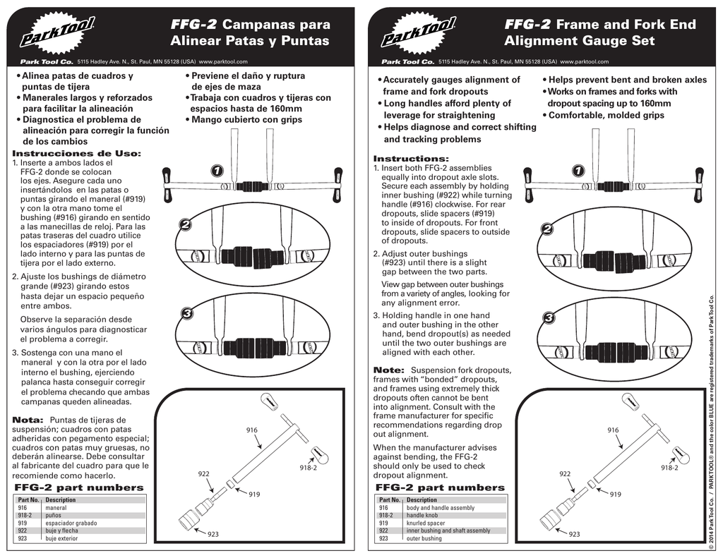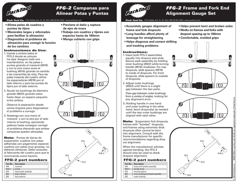 FFG-2 Campanas para Alinear Patas y Puntas Park Tool Co. 5115 Hadley Ave. N., St. Paul, MN 55128 (USA) www.parktool.com Instrucciones de Uso: 1. Inserte a ambos lados el FFG-2 donde se colocan los ejes. Asegure cada uno insertándolos en las patas o puntas girando el maneral (#919) y con la otra mano tome el bushing (#916) girando en sentido a las manecillas de reloj. Para las patas traseras del cuadro utilice los espaciadores (#919) por el lado interno y para las puntas de tijera por el lado externo. 2. Ajuste los bushings de diámetro grande (#923) girando estos hasta dejar un espacio pequeño entre ambos. Observe la separación desde varios ángulos para diagnosticar el problema a corregir. Park Tool Co. 5115 Hadley Ave. N., St. Paul, MN 55128 (USA) www.parktool.com • Previene el daño y ruptura de ejes de maza • Trabaja con cuadros y tijeras con espacios hasta de 160mm • Mango cubierto con grips Instructions: 1. Insert both FFG-2 assemblies equally into dropout axle slots. Secure each assembly by holding inner bushing (#922) while turning handle (#916) clockwise. For rear dropouts, slide spacers (#919) to inside of dropouts. For front dropouts, slide spacers to outside of dropouts. 1 2 2 View gap between outer bushings from a variety of angles, looking for any alignment error. 3 3. H olding handle in one hand and outer bushing in the other hand, bend dropout(s) as needed until the two outer bushings are aligned with each other. 918-2 922 919 923 3 Note: Suspension fork dropouts, frames with “bonded” dropouts, and frames using extremely thick dropouts often cannot be bent into alignment. Consult with the frame manufacturer for specific recommendations regarding drop out alignment. 916 FFG-2 part numbers Part No. Description 916 maneral 918-2 puños 919 espaciador grabado 922 buje y flecha 923 buje exterior 1 2. Adjust outer bushings (#923) until there is a slight gap between the two parts. 3. Sostenga con una mano el maneral y con la otra por el lado interno el bushing, ejerciendo palanca hasta conseguir corregir el problema checando que ambas campanas queden alineadas. Nota: Puntas de tijeras de suspensión; cuadros con patas adheridas con pegamento especial; cuadros con patas muy gruesas, no deberán alinearse. Debe consultar al fabricante del cuadro para que le recomiende como hacerlo. • Accurately gauges alignment of • Helps prevent bent and broken axles frame and fork dropouts •W orks on frames and forks with • Long handles afford plenty of dropout spacing up to 160mm leverage for straightening • Comfortable, molded grips • Helps diagnose and correct shifting and tracking problems When the manufacturer advises against bending, the FFG-2 should only be used to check dropout alignment. 916 FFG-2 part numbers Part No. Description 916 body and handle assembly 918-2 handle knob 919 knurled spacer 922 inner bushing and shaft assembly 923 outer bushing 918-2 922 919 923 © 2014 Park Tool Co. / PARK TOOL® and the color BLUE are registered trademarks of Park Tool Co. • Alinea patas de cuadros y puntas de tijera • Manerales largos y reforzados para facilitar la alineación • Diagnostica el problema de alineación para corregir la función de los cambios FFG-2 Frame and Fork End Alignment Gauge Set FFG-2 Mess- und Richtwerkzeug für Ausfallenden Park Tool Co. 5115 Hadley Ave. N., St. Paul, MN 55128 (USA) www.parktool.com Park Tool Co. 5115 Hadley Ave. N., St. Paul, MN 55128 (USA) www.parktool.com • Exaktes Vermessen von • Vermeidet verbogene und Ausfallenden an Rahmen und Gabel gebrochene Achsen • Lange Hebel für leichtes Justieren • Passend für Rahmen und Gabeln • Ermitteln & Korrigieren von bis 160 mm Baubreite Problemen bei Geradeauslauf und • Komfortabel geformte Handgriffe Schaltverhalten Bedienungsanleitung: 1. Setzen Sie beide Lehren des FFG2 auf die gleiche Weise in die Ausfallenden ein. Fixieren Sie sie, indem Sie die innere Buchse (#922) halten und dabei den Handgriff im Uhrzeigersinn festdrehen. Platzieren Sie die Unterlegscheiben (#919) jeweils bei Hinterbauten auf der Innenseite der Ausfallenden, bei Gabeln auf der Außenseite. 1 2 Examiner cet espace de chaque côté pour évaluer les erreurs d‘alignement. 3 2 3 3. En tenant la poignée avec une main et la douille extérieure avec l‘autre plier la patte avec suffisamment de force pour aligner parfaitement les deux douilles. Hinweis: Federgabeln, Rahmen mit geklebten oder extrem dicken Ausfallenden lassen sich häufig nicht zurecht biegen. Wenden Sie sich im Zweifelsfall an den jeweiligen Hersteller für spezifische Hinweise zum Richten der Ausfallenden. A noter: les pattes de fourches à suspension, ainsi que certaines pattes surdimensionnées ne peuvent pas être „plier“ pour les redresser. Bien vérifier les notices techniques des fabricants. 916 918-2 922 FFG-2 part numbers Part No. Description 916 körper und handgriff einheit 918-2 handgriff 919 rändel-distanzstück 922 innere buchse und schaft 923 äußere lagerbuchse 1 2. P ositionner les douilles (#923) en laissant une très légère ouverture entre les deux douilles. Taxieren Sie die Anordnung der äußeren Buchsen aus verschiede nen Blickwinkeln und suchen Sie nach Abweichungen Wenn der Hersteller das Zurechtbiegen der Ausfallenden verbietet, verwenden Sie das FFG-2 nur zur Kontrolle der Ausfallenden. • Pour mesurer avec précision • Pour éviter de plier ou casser l‘alignement des pattes de cadres les axes de roues • Les longues poignées offrent un • Pour des cadres avec bras de levier important empattement jusqu‘à 160mm • Permet de diagnostiquer et corriger • Poignées ergonomique confortables des erreurs de transmission Mode d‘emploi: 1. Placer les deux embouts du FFG-2 dans les pattes de cadre. Bien fixer chaque partie en tenant la pièce interne (#922) avec votre main en tournant la poignée (#916) dans le sens des aiguilles d‘une montre. Pour les pattes arrières, introduire des bagues d