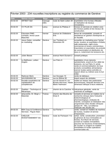 Février 2003 : 234 nouvelles inscriptions au registre du commerce de Genève Date 03.02.03 Raison sociale ARTBAT Sàrl Siège Carouge (GE) 03.02.03 CV PLUS SA Lancy 03.02.03 Fiduciaire PMEConseils, Anne-Laure Maechler Vernier avenue de Châtelaine 91A tenue de comptabilité, conseils et assistance en gestion d'entreprise et en fiscalité. 03.02.03 Jesus Galan, conseiller en marketing Genève rue Trente-et -unDécembre 59 conseiller en marketing pour l'achat, vente, location et exploitaton d'hôtels, café-restaurants, night-clubs, commerces et locaux commerciaux. Importation et exportation de produits de consommation et distribution de ceux-ci, notamment de boissons etc. 03.02.03 Julien Besse Genève avenue Henri-Dunant 2 conseil juridique. 03.02.03 Le Balthazar, Lettieri Angelo Genève rue Patru 6 03.02.03 03.02.03 03.02.03 Radovan Beric SAVIGRAINS SA Société coopérative de capitalisation de compétences Genève Genève Genève 03.02.03 Zwahlen - Technique et Lancy Mécanique chemin de la Caroline 14 mécanique générale, vente de machines et outillages 04.02.03 ad-juvantis, Dr. Birgit J. Maschek chemin des Moulins de Drize 9 04.02.03 BSA Copy & Conférence Genève Services - Piguet Alain rue Ferrier 1 04.02.03 CAELIUS INVESTISSEMENT SA route de Florissant 112 Troinex Genève Adresse Objet route de Saint -Julien 20 exploitation d'un bureau d'études et réalisation de travaux immobiliers. avenue du Plateau 2 travaux et services en relation avec les travaux publics et les travaux de construction. exploitation d'une épicerie, sandwicherie, snack et d'un débit de boissons, sis rue Patru 6; achat, vente et commercialisation de tous produits comestibles alimentaires; exercer toutes autres activités en rapport direct ou indirect avec le but initial. rue Gourgas 10 vente de tableaux. rue du Rhône 50 import -export de céréales. rue de l'Avenir 8, c/o mettre en réseau des partenaires Bureau-Services, Heide- économiques, lesquels donnent une Marie Hartmann dimension éthique à leurs relations. conseils et services en matière de la recherche clinique dans l'industrie biotechnologique et pharmacologique, analyses de marché, conception et réalisation des programmes et/ou études cliniques (phase I/II - IIIb), surveillance médicale des études etc. vente, conseil en matière de machine de bureau, location et service d'impression achat, vente, construction, promotion et gérance de tous immeubles en Suisse, fourniture de services, conseil en matière immobilière; assumer les fonctions d'intermédiaire, de courtier ou d'agent en matière immobilière et toutes opérations commerciales etc. 04.02.03 Carlucci Boutique, M. et Genève Mme Carlucci 04.02.03 DEMEPRO SA Lancy 04.02.03 Genève 04.02.03 Duarte Moura Alves Carlos F.I. Fides Immo Sàrl 04.02.03 Gourmet Vite, Zahnd Satigny 04.02.03 JÄGGI - Bar de l'Ile Genève 04.02.03 LuerChem Sàrl Aire-la-Ville rue du Vieux-Four 42 04.02.03 Mauri CollongeBellerive chemin du VieuxVésenaz 60 04.02.03 MJ Conseil, Jahansouz Genève 04.02.03 Neva Visualnight Thônex 04.02.03 04.02.03 Pereira Antonio Genève Pharmacie de la Trinité, Genève Khalid Kiwirra RES Real Estate Service Lancy Sàrl avenue de Sécheron 10 conseiller commercial, vente, marketing; courtage immobilier promenade des Oiseaux montage vidéo, diffusion d'animation 6 vidéo pour discothèque. rue de Lyon 47 entreprise de carrelage. rue de Lausanne 67 bis exploitation d'une pharmacie. 04.02.03 04.02.03 Bernex rue du Rhône 114 commerce de chaussures, objets en cuir, vêtements, sacs, bijoux et accessoires. chemin Louis-Hubert 2 déménagements, manutention, garde-meubles et archivages. boulevard de la Cluse 87 kiosque avec épicerie, sandwicherie; déménagements. route de Pré-Marais 26 activités de conseils et de service dans le domaine de l'immobilier, soit en particulier gérance d'immeubles, expertise, courtage et prestation s'y rapportant; activités de conseils et de services en matières commerciale et fiscale, soit en particulier ten chemin du Pré-de-laproduction et vente de produits Fontaine 13 alimentaires. quai des Moulins 12 exploitation d'un café-restaurant à l'enseigne "Bar de l'Ile" commerce de produits chimiques et de plastiques et tous services y relatifs. exploitation d'une crêperie et vente de kebab à l'enseigne "Crêperie de Vésenaz". route des Jeunes 6 travaux d'architecture, promotion immobilière et courtage dans le domaine de l'immobilier. chemin de Tréchaumont 3 rue de Berne 9 rue De-Livron 15 exploitation du café-restaurant buvette du "Tennis de Confignon". exploitation d'un tabacs-journaux. exploitation d'une entreprise dans le domaine des installations et rénovations sanitaires. Restaurant du Tennis, Rubsam S. Kahraman SENSAS Sàrl Confignon 04.02.03 The Business Humanitarian Forum Association Genève avenue de la Paix 7bis, c/Centre for Applied Studies in International Negotiations développement des relations de soutien positives et réciproques entre le monde des affaires et les organisations humanitaires. 04.02.03 Thierry Pellerin Genève 04.02.03 Time Tech SA Satigny avenue de Miremont 31 Ter rue du Pré-Bouvier 7 exploitation d'un café restaurant à l'enseigne "Le Miremont". fabrication, création et développement de composants utilisés dans l'industrie horlogère, ainsi que la commercialisation de tous brevets et marques de commerce, licences, procédés et secrets de fabrication, achat et vente de matières premières, etc. 04.02.03 04.02.03 Genève Meyrin 04.02.03 Toma, Alex XS 05.02.03 rue des Peupliers 2-4 05.02.03 Atelier Féroé, Christian Genève Foehr Baumgartner Consulting Genève 05.02.03 E-W B Gestion SA 05.02.03 FUTURE MULTIMEDIA Meyrin DISTRIBUTION SOLER Martinotti P.A., Vernier Consultant NARDITA Sàrl ChêneBougeries rue Jacques-Dalphin 37 management et planification en A, c/o Befac Fiduciaire matière financière, gestion de SA fortune, placements financiers pour le compte de tiers, intermédiation bancaire, délég