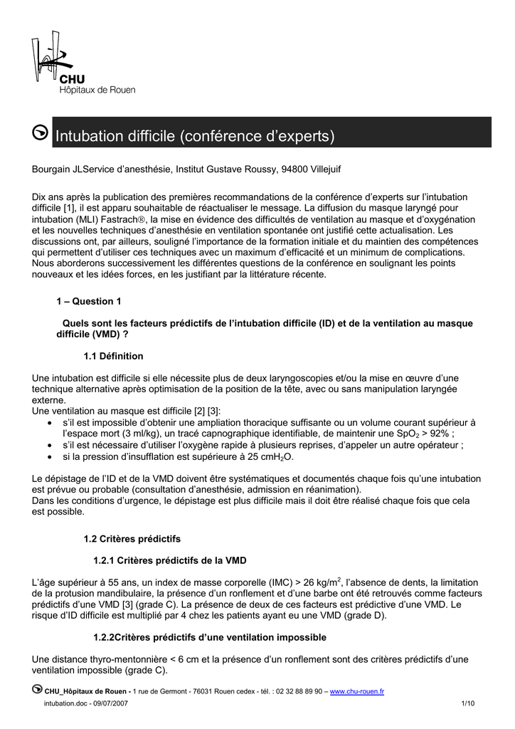 Intubation difficile (conférence d’experts) Bourgain JLService d’anesthésie, Institut Gustave Roussy, 94800 Villejuif Dix ans après la publication des premières recommandations de la conférence d’experts sur l’intubation difficile [1], il est apparu souhaitable de réactualiser le message. La diffusion du masque laryngé pour intubation (MLI) Fastrach®, la mise en évidence des difficultés de ventilation au masque et d’oxygénation et les nouvelles techniques d’anesthésie en ventilation spontanée ont justifié cette actualisation. Les discussions ont, par ailleurs, souligné l’importance de la formation initiale et du maintien des compétences qui permettent d’utiliser ces techniques avec un maximum d’efficacité et un minimum de complications. Nous aborderons successivement les différentes questions de la conférence en soulignant les points nouveaux et les idées forces, en les justifiant par la littérature récente. 1 – Question 1 Quels sont les facteurs prédictifs de l’intubation difficile (ID) et de la ventilation au masque difficile (VMD) ? 1.1 Définition Une intubation est difficile si elle nécessite plus de deux laryngoscopies et/ou la mise en œuvre d’une technique alternative après optimisation de la position de la tête, avec ou sans manipulation laryngée externe. Une ventilation au masque est difficile [2] [3]: • s’il est impossible d’obtenir une ampliation thoracique suffisante ou un volume courant supérieur à l’espace mort (3 ml/kg), un tracé capnographique identifiable, de maintenir une SpO2 > 92% ; • s’il est nécessaire d’utiliser l’oxygène rapide à plusieurs reprises, d’appeler un autre opérateur ; • si la pression d’insufflation est supérieure à 25 cmH2O. Le dépistage de l’ID et de la VMD doivent être systématiques et documentés chaque fois qu’une intubation est prévue ou probable (consultation d’anesthésie, admission en réanimation). Dans les conditions d’urgence, le dépistage est plus difficile mais il doit être réalisé chaque fois que cela est possible. 1.2 Critères prédictifs 1.2.1 Critères prédictifs de la VMD L’âge supérieur à 55 ans, un index de masse corporelle (IMC) > 26 kg/m2, l’absence de dents, la limitation de la protusion mandibulaire, la présence d’un ronflement et d’une barbe ont été retrouvés comme facteurs prédictifs d’une VMD [3] (grade C). La présence de deux de ces facteurs est prédictive d’une VMD. Le risque d’ID difficile est multiplié par 4 chez les patients ayant eu une VMD (grade D). 1.2.2Critères prédictifs d’une ventilation impossible Une distance thyro-mentonnière < 6 cm et la présence d’un ronflement sont des critères prédictifs d’une ventilation impossible (grade C). CHU_Hôpitaux de Rouen - 1 rue de Germont - 76031 Rouen cedex - tél. : 02 32 88 89 90 – www.chu-rouen.fr intubation.doc - 09/07/2007 1/10 1.2.3 Critères prédictifs d’une ID Les critères suivants sont prédictifs d’une ID et il est recommandé de les rechercher : antécédents d’ID, classe de Mallampati > 2, distance thyro-mentonnière (DTM) < 6 cm et ouverture de bouche < 35 mm (grade C). Il est conseillé également d’apprécier la mobilité mandibulaire (test de morsure de lèvre) [4], la mobilité du rachis cervical (angle fait par la tête en extension maximum sur le cou et en flexion maximum supérieur à 90°) (grade E). Certaines situations cliniques augmentent le risque d’ID : un IMC > 35 kg.m-2, un syndrome d’apnée du sommeil (SAOS) avec tour de cou > 45,6 cm, une pathologie cervico-faciale (grade D) et un état prééclamptique (grade E). Chez l’enfant la classification de Mallampati n’est pas validée (grade E). Les critères prédictifs d’une ID sont une dysmorphie faciale, une DTM < 15 mm chez le nouveau-né, 25 mm chez le nourrisson et < 35 mm chez l’enfant de moins de 10 ans, une ouverture de bouche inférieure à trois travers de doigt de l’enfant et un ronflement nocturne avec ou sans SAOS (grade E). 1.2.4 Critères prédictifs d’une ID dans le contexte de l’urgence Les critères doivent être recherchés dans la mesure du possible mais ils sont mal adaptés au contexte de l’urgence. Certaines situations doivent alerter l’opérateur : un traumatisme cervico-facial (traumatisme du rachis, traumatisme facial), une pathologie ORL (cervico-faciale ou oropharyngolaryngée) et la présence de brûlures faciales (grade E). 2 – Question 2 Désaturation artérielle en O2 et maintien de l’oxygénation pendant l’intubation. Tous les patients doivent être pré oxygénés, plus particulièrement quand une ID et/ou une VMD sont prévues [5] (grade C) et quand les patients sont à risque de désaturation pendant l’intubation. Les facteurs de risque de désaturation pendant l’intubation sont : une intubation en urgence avec induction en séquence rapide (ISR) [6], une VMD prévisible [2], une ID prévisible, l’obésité [7]et la grossesse[8], le nourrisson et le nouveau-né [9], l’enfant classe ASA 3 ou 4, l’enfant ronfleur et l’enfant avec infection des voies aériennes supérieures (VAS). Enfin le sujet âgé [10] et le bronchopathe chronique [11] sont également à risque de désaturation (grade D). L’obèse[7], la femme enceinte[8], le nourrisson[12], l’enfant porteur d’une infection des VAS et l’insuffisant respiratoire peuvent désaturer malgré une pré oxygénation bien conduite (grade A). Chez l’obèse, l’enfant et la femme enceinte, en raison de la diminution de la CRF, la dénitrogénation est plus rapide mais le temps d’apnée est plus court (grade B). La fréquence des échecs de la pré-oxygénation a été évaluée à 25% [13] ; ces échecs sont liés à des problèmes techniques. Les manœuvres de pré-oxygénation doivent donc être réalisées avec un masque étanche, un débit de gaz suffisant et un ballon de taille adaptée (grade D). La surveillance de la F