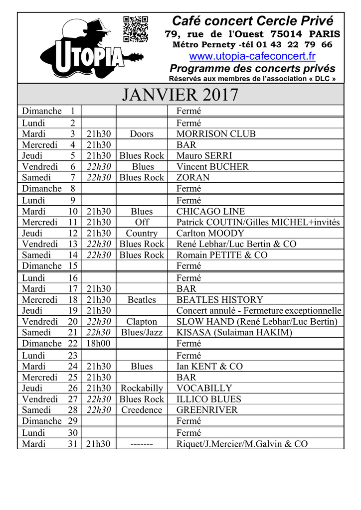 Café concert Cercle Privé 79, rue de l'Ouest 75014 PARIS Métro Pernety -tél 01 43 22 79 66 www.utopia-cafeconcert.fr Programme des concerts privés Réservés aux membres de l’association « DLC » JANVIER 2017 Dimanche Lundi Mardi Mercredi Jeudi Vendredi Samedi Dimanche Lundi Mardi Mercredi Jeudi Vendredi Samedi Dimanche Lundi Mardi Mercredi Jeudi Vendredi Samedi Dimanche Lundi Mardi Mercredi Jeudi Vendredi Samedi Dimanche Lundi Mardi 1 2 3 4 5 6 7 8 10 9 10 11 12 13 14 15 18 16 17 18 19 20 21 22 26 23 24 25 26 27 28 29 4 30 31 21h30 Doors 21h30 21h30 Blues Rock 22h30 Blues 22h30 Blues Rock 21h30 Blues 21h30 Off 21h30 Country 22h30 Blues Rock 22h30 Blues Rock 21h30 21h30 21h30 22h30 22h30 18h00 Beatles Clapton Blues/Jazz 21h30 Blues 21h30 21h30 Rockabilly 22h30 Blues Rock 22h30 Creedence 21h30 ------- Fermé Fermé MORRISON CLUB BAR Mauro SERRI Vincent BUCHER ZORAN Fermé Fermé CHICAGO LINE Patrick COUTIN/Gilles MICHEL+invités Carlton MOODY René Lebhar/Luc Bertin & CO Romain PETITE & CO Fermé Fermé BAR BEATLES HISTORY Concert annulé - Fermeture exceptionnelle SLOW HAND (René Lebhar/Luc Bertin) KISASA (Sulaiman HAKIM) Fermé Relache Fermé Ian KENT & CO BAR VOCABILLY ILLICO BLUES GREENRIVER Fermé Fermé Riquet/J.Mercier/M.Galvin & CO