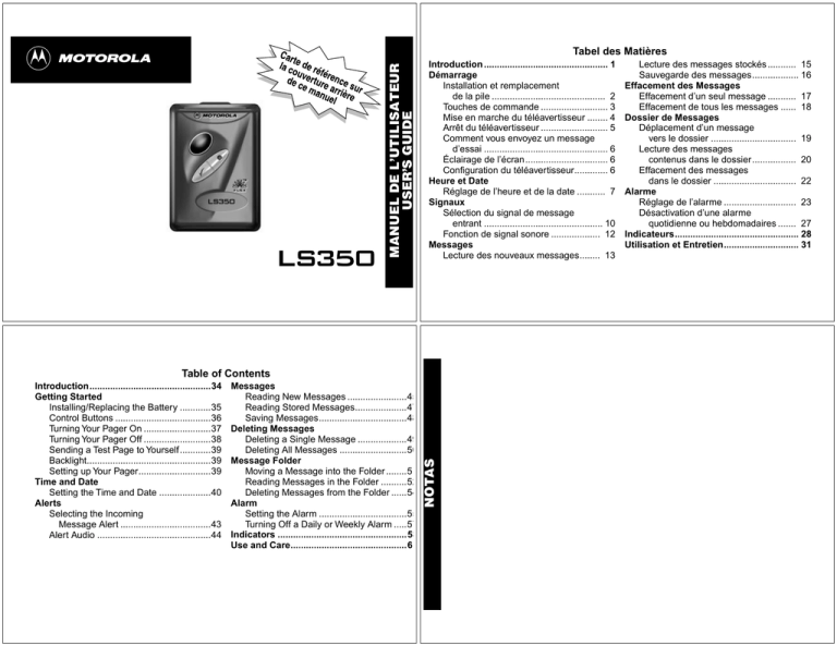 A MANUEL DE L’UTILISATEUR USER’S GUIDE Tabel des Matières Introduction ................................................ 1 Démarrage Installation et remplacement de la pile ............................................ 2 Touches de commande .......................... 3 Mise en marche du téléavertisseur ........ 4 Arrêt du téléavertisseur .......................... 5 Comment vous envoyez un message d’essai ................................................ 6 Éclairage de l’écran................................ 6 Configuration du téléavertisseur............. 6 Heure et Date Réglage de l’heure et de la date ........... 7 Signaux Sélection du signal de message entrant .............................................. 10 Fonction de signal sonore ................... 12 Messages Lecture des nouveaux messages........ 13 Messages Reading New Messages .......................45 Reading Stored Messages....................47 Saving Messages..................................48 Deleting Messages Deleting a Single Message ...................49 Deleting All Messages ..........................50 Message Folder Moving a Message into the Folder ........5 Reading Messages in the Folder ..........52 Deleting Messages from the Folder ......54 Alarm Setting the Alarm ..................................55 Turning Off a Daily or Weekly Alarm .....57 Indicators ..................................................58 Use and Care.............................................6 NOTAS Table of Contents Introduction...............................................34 Getting Started Installing/Replacing the Battery ............35 Control Buttons .....................................36 Turning Your Pager On ..........................37 Turning Your Pager Off ..........................38 Sending a Test Page to Yourself ............39 Backlight................................................39 Setting up Your Pager............................39 Time and Date Setting the Time and Date ....................40 Alerts Selecting the Incoming Message Alert ...................................43 Alert Audio ............................................44 Lecture des messages stockés ........... 15 Sauvegarde des messages.................. 16 Effacement des Messages Effacement d’un seul message ........... 17 Effacement de tous les messages ...... 18 Dossier de Messages Déplacement d’un message vers le dossier ................................. 19 Lecture des messages contenus dans le dossier................. 20 Effacement des messages dans le dossier ................................ 22 Alarme Réglage de l’alarme ............................ 23 Désactivation d’une alarme quotidienne ou hebdomadaires ....... 27 Indicateurs................................................ 28 Utilisation et Entretien............................. 31 Information sur la pile Félicitations pour votre achat du téléavertisseur LS350! Votre nouveau téléavertisseur vous offre des fonctions de messagerie des plus intéressantes et pourrait bien devenir un élément essentiel de votre vie tant au niveau professionnel que personnel. Ce téléavertisseur de format compact et facile à transporter combine des fonctions de messagerie et d’horloge. Si le symbole f est apposé sur votre LS350, cela signifie que ce téléavertisseur fait appel à la technologie FLEX™. Les téléavertisseurs articulés autour du protocole FLEX de Motorola offrent une plus grande fiabilité et permettent à la pile de durer plus longtemps. Pour bien comprendre les fonctions de ce téléavertisseur, il est important de consacrer quelques minutes à la lecture du présent guide de l’utilisateur. Vous trouverez également à l’endos de ce guide une carte de consultation rapide détachable. Votre téléavertisseur fonctionne à l’aide d’une pile alcaline AAA (l’utilisation de piles au carbone-zinc est déconseillée). INTRODUCTION DÉMARRAGE Installation et remplacement de la pile ➊ Arrêtez le téléavertisseur (consultez la Utilisation efficace de votre téléavertisseur Votre téléavertisseur peut vous aider à rester en contact avec tous ceux qui sont importants pour vous. Lorsque vous donnez votre numéro de téléavertisseur à vos collaborateurs, à votre famille et à vos amis, il devient alors possible de vous joindre en tout temps. Si vous possédez un téléphone cellulaire, donnez plutôt votre numéro de téléavertisseur. Ainsi, vous pouvez choisir les personnes que vous voulez rappeler à l’aide de votre téléphone cellulaire sans avoir à défrayer les coûts des appels entrants. 2 1 Indicateur Compartiment section intitulée «Arrêt du de polarité de la pile téléavertisseur» à la page 5. ➋ Repérez le couvercle du compartiment de la pile, qui se trouve à l’arrière du téléavertisseur. ➌ Faites glisser le couvercle dans le sens indiqué par la flèche pour le déverrouiller. ➍ Soulevez le couvercle du compartiment pour l’ouvrir. ➎ Retirez la pile à remplacer, en notant la position des pôles. ➏ Insérez la nouvelle pile de façon que les symboles + et - de la pile correspondent à ceux indiqués dans le compartiment. ➐ Refermez le couvercle du compartiment. ➑ Faites glisser le couvercle pour le verrouiller. Note : Après le remplacement de la pile, vérifiez l’heure indiquée par l’horloge du téléavertisseur. Touches de commande t r s Menu Touche de menu m Cette touche sert à accéder aux menus du téléavertisseur et à activer l’éclairage de l’écran. Lecture Cette touche sert à mettre en marche le téléavertisseur, à lire les messages et à naviguer dans les menus. Sélection Cette touche sert à sélectionner les paramètres et les fonctions du téléavertisseur. Elle est également utilisée pour afficher d’autres écrans de messages. 88 f hjlb e ➊ Appuyez sur la touche r. Les écrans de mise MOTOROLA DÉMARRAGE DÉMARRAGE Touche de lecture Touche de sélection Mise en marche du t