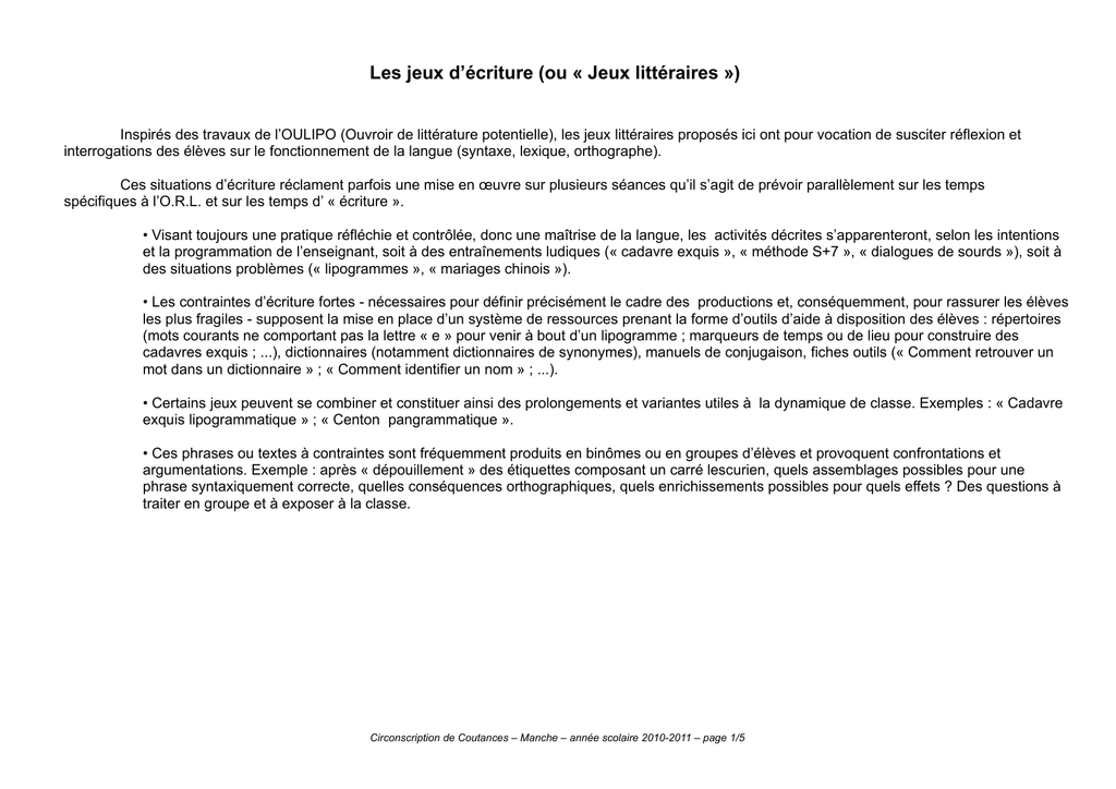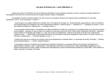Les jeux d’écriture (ou « Jeux littéraires ») Inspirés des travaux de l’OULIPO (Ouvroir de littérature potentielle), les jeux littéraires proposés ici ont pour vocation de susciter réflexion et interrogations des élèves sur le fonctionnement de la langue (syntaxe, lexique, orthographe). Ces situations d’écriture réclament parfois une mise en œuvre sur plusieurs séances qu’il s’agit de prévoir parallèlement sur les temps spécifiques à l’O.R.L. et sur les temps d’ « écriture ». • Visant toujours une pratique réfléchie et contrôlée, donc une maîtrise de la langue, les activités décrites s’apparenteront, selon les intentions et la programmation de l’enseignant, soit à des entraînements ludiques (« cadavre exquis », « méthode S+7 », « dialogues de sourds »), soit à des situations problèmes (« lipogrammes », « mariages chinois »). • Les contraintes d’écriture fortes - nécessaires pour définir précisément le cadre des productions et, conséquemment, pour rassurer les élèves les plus fragiles - supposent la mise en place d’un système de ressources prenant la forme d’outils d’aide à disposition des élèves : répertoires (mots courants ne comportant pas la lettre « e » pour venir à bout d’un lipogramme ; marqueurs de temps ou de lieu pour construire des cadavres exquis ; ...), dictionnaires (notamment dictionnaires de synonymes), manuels de conjugaison, fiches outils (« Comment retrouver un mot dans un dictionnaire » ; « Comment identifier un nom » ; ...). • Certains jeux peuvent se combiner et constituer ainsi des prolongements et variantes utiles à la dynamique de classe. Exemples : « Cadavre exquis lipogrammatique » ; « Centon pangrammatique ». • Ces phrases ou textes à contraintes sont fréquemment produits en binômes ou en groupes d’élèves et provoquent confrontations et argumentations. Exemple : après « dépouillement » des étiquettes composant un carré lescurien, quels assemblages possibles pour une phrase syntaxiquement correcte, quelles conséquences orthographiques, quels enrichissements possibles pour quels effets ? Des questions à traiter en groupe et à exposer à la classe. Circonscription de Coutances – Manche – année scolaire 2010-2011 – page 1/5 Dix propositions de situations d’écriture « jeux littéraires » en lien direct avec l’étude de la langue Jeux littéraires (Type Oulipo) Méthode S+7 (S + ou - 4) Brève description Contraintes d’écriture et de construction Remplacer, dans un texte, certains mots (nom, verbe, adjectif) par ceux qui les suivent (ou les précèdent) sur le dictionnaire à une distance variable définie à l’avance (+ ou – 4, 5, 7, par exemple) Compétence(s) ou notion(s) dominante(s) Exemples Productions d’élèves → identifier les verbes, les noms (voire les adjectifs) dans une phrase ; « Si deux druides situés dans une plantation font avec une même seconde des animations intérieures de la même cotisation dont la → utiliser un dictionnaire pour retrouver un mot sommité soit plus petite que deux dromadaires, (en tenant compte de sa classe) ces deux druides se rencontrent dans cette cotisation. » → réaliser les chaînes d'accord dans le G.N. Postulat d’Euclide en S+7 par Jean Lescure "Le loustic et l’agnostique Le râle le plus fouetté est toujours le plus mellifère Nous l’allons morfondre tout à l’hexagone Un agnostique s désapprovisionnait dans la courbure d’un ongle pusillanime Un loustic suspecta à jeun,... " D’après Jean de la Fontaine « Le loup et l’agneau » - extrait de transformation par des élèves de cycle 3 Cadavre exquis ou jeu dit des « petits papiers » Construire une phrase en assemblant les « petits papiers » produits par les joueurs (sans communication entre eux) selon les contraintes définies (groupes fonctionnels ou classes : GNS, Verbe, C. de verbe, ...). Exemple* : joueur A = GN (sujet), joueur B = verbe, joueur C = GN (C. de V.), joueur D = GN (C. de lieu), joueur E = adjectif → effectuer des manipulations dans une phrase (combinaisons, déplacements) « Le cadavre exquis boira le vin nouveau. » (J. Prévert ) → manipuler les différentes fonctions (GNS, Compléments de verbe ou de phrase, GV) manipuler les différentes relations entre les éléments d’une phrase * Sur une île du Pacifique, une danseuse microscopique * Sur une île du Pacifique, une danseuse microscopique → + toute(s) compétence(s) liée(s) aux E = microscopique. (élèves de cycle 3) Circonscription de Coutances – Manche – année scolaire 2010-2011 – page 2/5 [A = une danseuse , B = ébouriffer, C = une boîte de sardines, D = sur une île du Pacifique] Le carré Lescurien Construire une phrase constituée de quatre éléments placés aux quatre coins contraintes spécifiques (initialement définies ou d’enrichissement et de réécriture) papillon lune rêver noir du carré (deux noms, un adj. et un verbe + liens éventuels) La lune rêve à des papillons noirs. (élèves de Cycle ll) Mariage chinois ou Questionnaire surréaliste Composer un texte à partir des réponses (non divulguées au départ) des joueurs aux questions qui leur sont posées . Exemple de questionnaire* : de qui s’agit-il ? où se trouve-t-il (elle)** ? que fait-il (elle) ? quand cela se passe-t-il ? que dit-il (elle) ? qu’en pensent les gens ? Conclusion (**il ou elle mais aussi ils ou elles possibles) Le questionnaire évolue en fonction des compétences visées et des projets d’écriture. manipuler les constituants d’une phrase ou d’un texte → repérer les relations qu’ils entretiennent et réaliser les chaînes d’accords → assurer une cohésion d’ensemble Texte composé par des élèves de Cycle lll à partir du questionnaire* (après ajustements et réécriture) : "Une vieille dame assise sur la Tour Eiffel → + toute(s) compétence(s) liée(s) aux tricote des chaussettes de lai