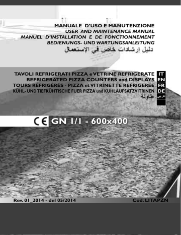 MANUALE D’USO E MANUTENZIONE USER AND MAINTENANCE MANUAL MANUEL D’INSTALLATION E DE FONCTIONNEMENT BEDIENUNGS- UND WARTUNGSANLEITUNG TAVOLI REFRIGERATI PIZZA e VETRINE REFRIGERATE REFRIGERATED PIZZA COUNTERS and DISPLAYS TOURS RÉFRIGÉRÉS - PIZZA et VITRINETTE REFRIGEREE KÜHL- UND TIEFKÜHTISCHE FUER PIZZA und KUHLAUFSATZVITRINEN IT EN FR DE GN 1/1 - 600x400 Rev. 01_2014 - del 05/2014 Cod. LITAPZN IT | Tavoli Refrigerati TN/BT | Manuale d’uso e manutenzione Benvenuto Il Produttore la ringrazia per aver scelto uno dei suoi prodotti. La invitiamo a leggere attentamente il nostro manuale: ciò assicurerà un utilizzo ottimale del suo Mobile refrigerato. RAEE WEEE RAEE WEEE RAEE WEEE RAEE WEEE 2 ITALIANO RAEE - Gestione rifiuti apparecchiature elettriche ed elettroniche Il simbolo del bidone barrato posto sul prodotto o sulla documentazione del manuale d’uso, indica che il prodotto è stato immesso nel mercato dopo la data del 13 agosto 2005. Al termine del ciclo di vita utile, il prodotto, deve essere raccolto, smaltito, trasportato in modo separato rispetto agli altri rifiuti urbani seguendo le normative vigenti in ogni paese. In questo modo potrà essere recuperato contribuendo ad evitare possibili effetti negativi sull’ambiente e sulla salute, favorendo il reimpiego e/o il riciclo dei materiali di cui è composta l’apparecchiatura. Lo smaltimento abusivo del prodotto da parte dell’utente comporta l’applicazione di sanzioni amministrative previste dalla norma vigente. La Direttiva comunitaria RAEE N° 2002/96/CE, (in Italia recepita con il Dgls del 15.05.2005 N°151); Direttiva comunitaria N°2003/108/CE riguardante il trattamento dei rifiuiti delle apparecchiature elettriche ed elettroniche. ENGLISH RAEE - Electrical and Electronic Waste Management The barred can symbol displayed on the product or in the use manual documentation indicates that the product has been placed for sale on the market after August 13, 2005. At the end of its useful life-cycle, the product must be collected, disposed of, and transported separately from urban waste, in accordance to the norms in force in each individual country. In this way, it can be recovered, contributing to avoid possible negative effects on the environment and health, and favoring the re-use and/or recycling of the materials of which the equipment is made of.The abusive disposal of the product by the user entails the application of administrative sanctions established by the norms in force. The EU Directive RAEE N. 2002/96/CE, (implemented in Italy by the Law Decree n. 151 dated May 15, 2005); EU Directive N. 2003/108/CE concerning the handling of electrical and electronic waste. FRANCAIS RAEE - Gestion des déchets d’appareillages électriques et électroniques Le symbole de la poubelle barrée placé sur le produit ou sur la documentation du manuel d’utilisation, indique que le produit a été mis sur le marché après la date du 13 août 2005.A la fin du cycle de vie utile, le produit doit être trié, éliminé, transporté de façon séparée par rapport aux autres déchets urbains en suivant les normatives en vigueur dans chaque pays. De cette façon, il pourra être récupéré en contribuant à éviter d’éventuels effets négatifs sur l’environnement et sur la santé, en favorisant le réemploi et/ou le recyclage des matériaux dont est composé l’appareillage. L’élimination abusive du produit de la part de l’utilisateur comporte l’application de sanctions administratives prévues par la normative en vigueur. La Directive communautaire RAEE N° 2002/96/CE, (en Italie définie dans le D. lég. du 15.05.2005 n°151); Directive communautaire N° 2003/108/CE concernant le traitement des déchets des appareillages électriques et électroniques. DEUTSCH RAEE - Umgang mit Abfällen elektrischer und elektronischer Geräte Das Symbol der durchkreuzten Mülltonne auf dem Produkt oder der Dokumentation der Gebrauchsanweisung gibt an, dass das Produkt nach dem 13. August 2005 auf den Markt gebracht wurde. Am Ende des Nutzungszyklus muss das Produkt entsprechend der im jeweiligen Land geltenden Bestimmungen gesammelt, entsorgt und getrennt von anderem Hausmüll transportiert werden. Auf diese Weise kann es zurückgewonnen werden, wodurch zur Vermeidung möglicher negativer Auswirkungen auf die Umwelt und die Gesundheit beigetragen sowie die Wiederverwertung und das Recycling der Materialien erleichtert wird, aus denen das Gerät besteht. Die widerrechtliche Entsorgung des Produktes durch den Nutzer zieht die Anwendung der von den gültigen Bestimmungen vorgesehenen Verwaltungsstrafen nach sich. Die gemeinschaftliche Richtlinie RAEE Nr. 2002/96/EG, (in Italien mit der Gesetzesverordnung Nr. 151 vom 15.05.2005 umgesetzt); Gemeinschaftliche Richtlinie Nr. 2003/108/CE bezüglich der Behandlung von Abfällen elektrischer und elektronischer Geräte. RAEE WEEE ESPANOL RAEE - Gestión de los residuos de aparatos eléctricos y electrónicos El símbolo del bidón barrado en el producto o en la documentación del manual de utilización, indica que el producto, ha sido introducido en el mercado después de la fecha 13 de Agosto del 2005. Al final de su ciclo de vida, el producto debe ser recogido, eliminado y transportado de forma separada respecto a los otros residuos urbanos, siguiendo la normativa vigente en cada país. De este modo podrá ser recuperado contribuyendo a evitar posibles efectos negativos en el medio ambiente y en la salud, favoreciendo así la reutilización y/o el reciclaje de los materiales que componen el aparato. La eliminación ilegal del producto por parte del usuario, supone la aplicación de sanciones administrativas previstas en la normativa vigente La Directiva comunitaria RAEE N° 2002/96/CE, (en Italia se acoge al Decreto Legislativo del 15.05.2005 nº.151); Directiva comunitaria N° 2003/108/CE respecto al tratamiento de los residuos de los aparatos eléctricos y electrónicos. RAEE WEEE P