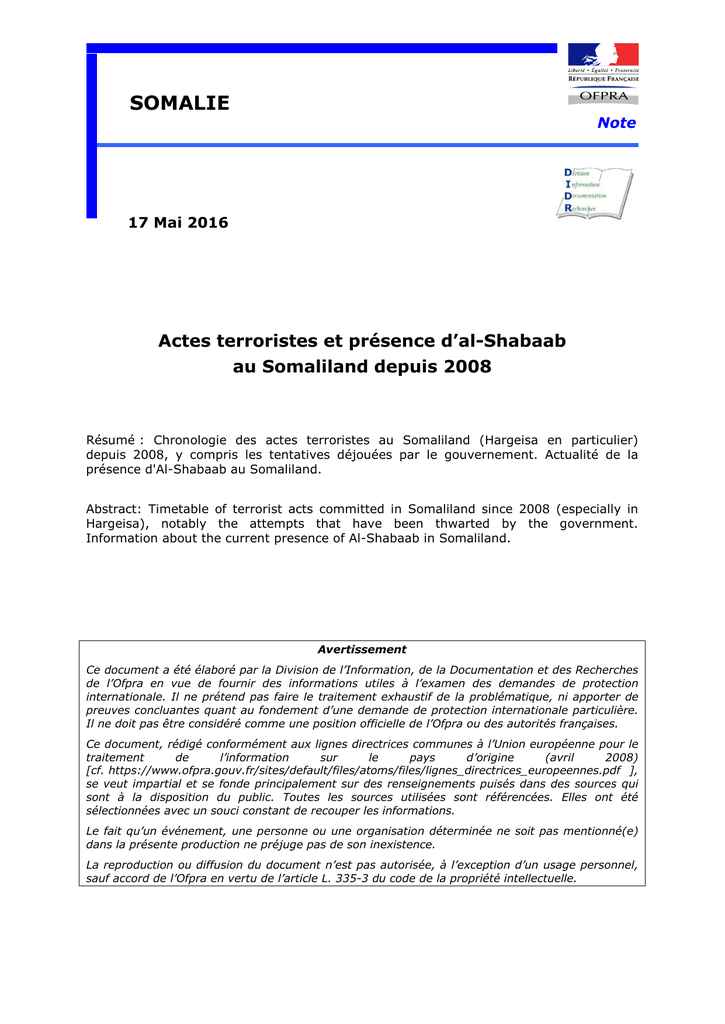 SOMALIE Note 17 Mai 2016 Actes terroristes et présence d’al-Shabaab au Somaliland depuis 2008 Résumé : Chronologie des actes terroristes au Somaliland (Hargeisa en particulier) depuis 2008, y compris les tentatives déjouées par le gouvernement. Actualité de la présence d'Al-Shabaab au Somaliland. Abstract: Timetable of terrorist acts committed in Somaliland since 2008 (especially in Hargeisa), notably the attempts that have been thwarted by the government. Information about the current presence of Al-Shabaab in Somaliland. Avertissement Ce document a été élaboré par la Division de l’Information, de la Documentation et des Recherches de l’Ofpra en vue de fournir des informations utiles à l’examen des demandes de protection internationale. Il ne prétend pas faire le traitement exhaustif de la problématique, ni apporter de preuves concluantes quant au fondement d’une demande de protection internationale particulière. Il ne doit pas être considéré comme une position officielle de l’Ofpra ou des autorités françaises. Ce document, rédigé conformément aux lignes directrices communes à l’Union européenne pour le traitement de l’information sur le pays d’origine (avril 2008) [cf. https://www.ofpra.gouv.fr/sites/default/files/atoms/files/lignes_directrices_europeennes.pdf ], se veut impartial et se fonde principalement sur des renseignements puisés dans des sources qui sont à la disposition du public. Toutes les sources utilisées sont référencées. Elles ont été sélectionnées avec un souci constant de recouper les informations. Le fait qu’un événement, une personne ou une organisation déterminée ne soit pas mentionné(e) dans la présente production ne préjuge pas de son inexistence. La reproduction ou diffusion du document n’est pas autorisée, à l’exception d’un usage personnel, sauf accord de l’Ofpra en vertu de l’article L. 335-3 du code de la propriété intellectuelle. Actes terroristes et présence d’al-Shabaab au Somaliland depuis 2008 La menace terroriste est apparue de façon ponctuelle au Somaliland ces dernières années. De sérieux incidents ont touché le pays au début des années 2000, mais sans commune mesure avec les attaques coordonnées d’Hargeisa survenues en octobre 2008. Au cours de la décennie 2000, une coopération renforcée en matière de renseignement avec Djibouti, l’Ethiopie et la Grande-Bretagne a permis le démantèlement de nombreuses cellules terroristes au Somaliland, dont certaines sur le point de passer à l’action 1. Le 29 octobre 2008, une vague d’attentats-suicides à la voiture piégée, attribuée au mouvement al-Shabaab, ensanglante les rues d’Hargeisa, la capitale du Somaliland, faisant près d’une trentaine de victimes et plusieurs dizaines de blessés. Les six kamikazes ont fait exploser leurs charges aux abords du palais présidentiel, de l’ambassade éthiopienne et des locaux de la représentation des Nations-Unies 2. En mai 2009, la police du Somaliland appréhende dans les environs de Burco (ou Burao), dans la province de Togdheer, trois individus suspectés d’appartenir à alShabaab 3. En 2010, les forces de sécurité déjouent au moins trois tentatives d’attentats du mouvement al-Shabaab, dont deux à l’approche des élections générales du 26 juin 4. AlShabaab, par la voix de son chef Ahmed Abdi Godane, originaire lui-même du Somaliland, avait menacé de représailles les habitants du Somaliland qui se rendraient aux urnes pour élire leur président et députés 5. Le mouvement islamiste dispose alors de camps d’entraînement, rassemblant plusieurs centaines de combattants, dans la chaîne montagneuse des Golis située dans la province du Sanaag, une région du Nord de la Somalie convoitée par le Puntland et le Somaliland 6. Le 9 janvier, une tentative d’attentat est déjouée contre la mosquée Imam Sheikh Aden Sira à Hargeisa. Des explosifs sont retrouvés à l’intérieur de la mosquée 7. Au cours du même mois, al-Shabaab dépêche des combattants au Sanaag, avec pour mission, selon la presse locale, de s’infiltrer en territoire somalilandais. Ces miliciens islamistes s’associent aux forces de Mohamed Atom, un chef de guerre local rallié à al-Shabaab 8. Le 10 juin, une cellule dormante d’al-Shabaab est démantelée à Burco. Onze personnes (sept hommes et quatre femmes) sont arrêtées en possession d’explosifs et d’armes à feu. Un policier est tué et deux autres sont blessés au cours de l’intervention 9. 1 International Crisis Group, Somaliland: The strains of success, Africa Briefing N°113, 05/10/2015. 2 BBC, « Deadly car bombs hit Somaliland », 29/10/2008; Jeune Afrique, « Les milices shebab accusées d’une série d’attentats au Somaliland », 27/11/2008; The Jamestown Foundation, « Somaliland charges al-Shabaab extremists with suicide bombings », Terrorism Monitor, Volume 6, Issue 23, 08/12/2008; Somaliland Press, « Somaliland remembers victims of October 29, 2008 tourist attack », 29/10/2011. 3 BBC, « Somalia: Somaliland police arrest 3 men suspected of terrorism », 28/05/2009. 4 The Jamestown Foundation, « Al-Shabaab’s unavoidable clash with Somaliland democracy », Terrorism Monitor, Volume 8, Issue 33, 19/08/2010. 5 Jeune Afrique, « Le Somaliland menacé de déstabilisation par les shebab », 26/06/2010. 6 Jeune Afrique, « Somalie: les insurgés assoient leur présence dans les montagnes du nord », 22/07/2010. 7 Africa News, « Somalia; Somaliland forces thwart mosque attack », 09/01/2010; The Jamestown Foundation, 19/08/2010, op.cit. 8 BBC, « Hardline islamists plan to infiltrate Somaliland », 27/01/2010. 9 Somaliland Press, « Somaliland police arrest four suspected terrorists », 14/06/2010; The Jamestown Foundation, 19/08/2010, op.cit. 2 DIDR – OFPRA 17/05/2016 Actes terroristes et présence d’al-Shabaab au Somaliland depuis 2008 Le 14 juin, la police arrête à Gabiley, province de