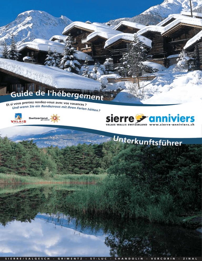 Guide de l'hébergement us preniez ren dez-vous avec vos vacances ? Et si vo Sie ein Rendezvous mit Ihren F Und wenn erien hät te n ? Unterku nftsführer S I E R R E / S A L G E S C H - G R I M E N T Z - S T - L U C - C H A N D O L I N - V E R C O R I N - Z I N A L 2 Amsterdam-Hamburg-Frankfurt INFORMATION & RESERVATION München Stuttgart Basel London-Bruxelles Sierre-Anniviers Tourisme Case Postale 59 CH - 3960 Sierre Zürich Wien Paris-Dijon Tél. ++41 (0) 848 848 027 [email protected] Bern Chur St-Gotthard b sch Löt Brig erg Lausanne SIERRE Martigny ANNIVIERS Torino-Milano Grd-St-Bernard Lyon-Marseille lon Sion Simp Genève Milano Roma OFFICES DU TOURISME / VEHRKERSBÜRO Office du toursime de Sierre, Salgesch et environs Office du tourisme de Grimentz Office du tourisme de St-Luc Office du tourisme de Chandolin Office du tourisme de Vercorin Office du tourisme de Zinal Office du tourisme de Vissoie [email protected] [email protected] [email protected] [email protected] [email protected] [email protected] [email protected] LABEL DE QUALITÉ POUR LE TOURISME SUISSE QUALITÄTS-GÜTESIEGEL FÜR DEN SCHWEIZER TOURISMUS Bienvenue! Ces labels indiquent que tout est réalisé pour que vous bénéficiez des meilleures prestations de service possibles. Le programme «Label de qualité» est soutenu par les organisations faîtières touristiques suisses. Les entreprises titulaires de ces labels veillent en permanence à la qualité et s'engagent à tout mettre en œuvre pour vous satisfaire pleinement. Chaque année, des mesures visant à poursuivre l'amélioration de la qualité sont fixées et appliquées. Les entreprises présentes dans cette brochure avec ces labels sont toutes particulièrement recommandées. Willkommen! Diese Gütesiegel bedeuten, dass wir alles daran setzen, die Qualität der Dienstleistung für Sie so hoch wie möglich zu halten. Das Programm «Qualitäts-Gütesiegel» wird von allen Schweizer Tourismusverbänden unterstützt und hat zum Ziel, in den touristischen Betrieben das Qualitätsbewusstsein zu steigern. Die Betriebe, die mit den Qualitäts-Gütesiegeln ausgezeichnet sind, haben Sie als Gast die Gewähr, dass sich Mitarbeitende und Betriebsleitung kontinuierlich mit dem Thema Qualität auseinandersetzen. Die in der Broschüre mit diesen Label präsentierten Unternehmen empfehlen wir ganz besonders. PRIX EN EURO E Tél. +41 (0)27 455 85 35 Tél. +41 (0)27 475 14 93 Tél. +41 (0)27 475 14 12 Tél. +41 (0)27 475 18 38 Tél. +41 (0)27 455 58 55 Tél. +41 (0)27 475 13 70 Tél. +41 (0)27 475 13 38 / PREISE IN EURO Nos prix sont indiqués en francs suisses. Nous vous proposons une table de conversion indicative de francs suisses (CHF) en Euro (E). Elle se base sur un cours moyen de CHF 1.58 pour E 1.-; le taux du jour sera appliqué pour le paiement de votre séjour. Die Preise sind in diesem Prospekt in Schweizer Franken angegeben. Die untenstehende Umrechnungstabelle soll Ihnen das Umrechnen von Schweizer Franken (CHF) in Euro (E) erleichtern (Basis = Mittelkurs von CHF 1.58 für E 1.-); Die Tagestaxe dient der Bezahlung Ihres Aufenthalts. CHF 10 20 30 40 50 60 70 80 90 E 6.30 12.65 19.00 25.30 31.65 38.00 44.30 50.65 56.95 CHF 100 200 300 400 500 600 700 800 900 1000 E 63.30 126.60 190.00 253.20 316.45 379.75 443.00 506.30 569.60 632.90 HÔTELS / HOTELS > 4 LOGEMENTS DE GROUPE / GRUPPENUNTERKÜNFTE > 16 AGENCES DE LOCATION / MIETEAGENTUREN > 12 GÎTES & CABANES / HERBERGEN & HÜTTEN > 19 CAMPINGS > 14 BED & BREAKFAST > 22 Bienvenue Willkom men Benvenu ti Welcome Présentation de la destination Vorstellung der Destination Sierre, Salgesch et environs, le royaume du soleil et du vin au cœur du Valais et les 5 stations-villages du Val d’Anniviers vous ouvrent leurs portes. Des rives du Rhône aux sommets montagneux, du sport au folklore, de la modernité aux traditions, bref, …de la vigne aux neiges éternelles! La région touristique de Sierre-Anniviers, située au sud de la Suisse, en Valais Central, vous offre des attractions aussi hautes en couleur que de paysages variés. Cette destination est fortement étagée. Les zones d’habitation s’étendent entre 500 et 2000 mètres et les chaînes alpines projettent leurs sommets bien au-delà de 4000 mètres. Sierre, Salgesch et environs (en plaine) et le Val d’Anniviers (sur les hauteurs) ont uni leurs connaissances et leur savoir-faire en matière touristique pour vous offrir un plus large éventail de produits et diversifier votre séjour. Siders, Salgesch und Umgebung, Königreich der Sonne, Wein- und Kulturregion im Herzen des Wallis, und die 5 Kurorte des Val d’Anniviers heissen Sie herzlich willkommen! Vom Rhoneufer bis zu den höchsten Berggipfeln, vom Sport bis zur Folklore, von althergebrachten Traditionen bis zu modernsten Einrichtungen, kurz, von den Weinbergen bis zum ewigen Schnee! Die gastfreundliche Ferienregion Sierre-Anniviers, im Süden der Schweiz gelegen, bietet Ihnen im Zentralwallis eine enorme Vielfalt an Attraktionen. Die Wohnzonen erstrecken sich von 500 bis 2000 Meter und die Bergketten zeigen ihre Gipfel über 4000 Meter hinaus. Aber entdecken Sie doch am besten selbst, was sie alles zu bieten hat! Siders, Salgesch und Umgebung (in der Ebene) sowie das Val d'Anniviers (in den Bergen) haben ihre Erfahrungen und ihr Know-how im Tourismussektor vereinigt, um Ihnen eine noch breitere Palette an Produkten anzubieten. Ihr Aufenthalt wird unvergesslich sein! 4 > Hôte ls > Hotels Sierre, Salgesch et environs 37 n 62 O Hôtel Atlantic *** 30 n 60 O Hôtel Casino *** Situé à l’entrée ouest de la cité du soleil. 37 chambres avec le meilleur confort actuel. Restaurant français, brasserie et grande terrasse avec carte sélective et traditionnelle. Piscine et parc ombragé. Im Westen der Sonnenstadt gelegen. 37 Zimmer mit modemstem Komfort. Französisches Restaurant, Brasserie und grosse Terrasse. Spezielle und traditionelle Küche. Schwimmbad, baumbeschatteter Park. Rte de Sion 38 3960