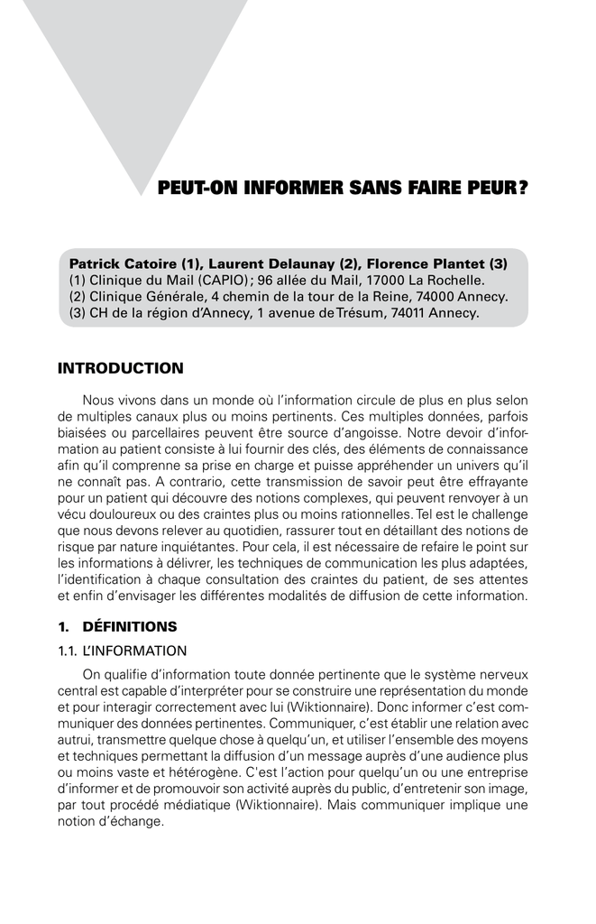 Peut-on informer sans faire Peur ? Patrick Catoire (1), Laurent Delaunay (2), Florence Plantet (3) (1) Clinique du Mail (CAPIO) ; 96 allée du Mail, 17000 La Rochelle. (2) Clinique Générale, 4 chemin de la tour de la Reine, 74000 Annecy. (3) CH de la région d’Annecy, 1 avenue de Trésum, 74011 Annecy. IntroDuCtIon Nous vivons dans un monde où l’information circule de plus en plus selon de multiples canaux plus ou moins pertinents. Ces multiples données, parfois biaisées ou parcellaires peuvent être source d’angoisse. Notre devoir d’information au patient consiste à lui fournir des clés, des éléments de connaissance afin qu’il comprenne sa prise en charge et puisse appréhender un univers qu’il ne connaît pas. A contrario, cette transmission de savoir peut être effrayante pour un patient qui découvre des notions complexes, qui peuvent renvoyer à un vécu douloureux ou des craintes plus ou moins rationnelles. Tel est le challenge que nous devons relever au quotidien, rassurer tout en détaillant des notions de risque par nature inquiétantes. Pour cela, il est nécessaire de refaire le point sur les informations à délivrer, les techniques de communication les plus adaptées, l’identification à chaque consultation des craintes du patient, de ses attentes et enfin d’envisager les différentes modalités de diffusion de cette information. 1. DéFInItIons 1.1. L’InfORMATIOn On qualifie d’information toute donnée pertinente que le système nerveux central est capable d’interpréter pour se construire une représentation du monde et pour interagir correctement avec lui (Wiktionnaire). Donc informer c’est communiquer des données pertinentes. Communiquer, c’est établir une relation avec autrui, transmettre quelque chose à quelqu’un, et utiliser l’ensemble des moyens et techniques permettant la diffusion d’un message auprès d’une audience plus ou moins vaste et hétérogène. C'est l’action pour quelqu’un ou une entreprise d’informer et de promouvoir son activité auprès du public, d’entretenir son image, par tout procédé médiatique (Wiktionnaire). Mais communiquer implique une notion d’échange. 634 MAPAr 2010 1.2. LA PeuR La peur est une émotion ressentie généralement en présence ou dans la perspective d’un danger. Par extension, le terme peut aussi désigner l’appréhension liée à des situations déplaisantes ou à des animaux répugnants. On parle alors de phobie, mot issu d’une racine grecque désignant la peur : claustrophobie, agoraphobie etc... Elle peut entraîner une inhibition de la pensée et prépare l’individu à fuir ou à se défendre (Wiktionnaire). La peur permet de préserver l’individu en le soustrayant au danger. Elle permet souvent l’action et il n’y a pas d’héroïsme sans peur. Cependant la peur active des processus physiologiques potentiellement délétères et facilite les voies de la douleur : « quand on cède à la peur du mal, on ressent déjà le mal de la peur » disait déjà Beaumarchais. 1.3. L'AnxIéTé L'anxiété, est un trouble psychique se caractérisant par la crainte de survenue d’un danger réel ou imaginaire. A la différence de l’angoisse qui se définit plus spécifiquement par un sentiment d’appréhension et de profonde inquiétude. L’anxiété est donc une peur sans objet. Il existe des outils pour évaluer l’anxiété. Parmi ceux-ci : • Le Gold standard est le Stait and Trait Anxiety Inventory [1] de Spielberger (STAI) : un questionnaire de 2 fois 20 questions qui a été traduit en Français [2]. • L’échelle visuelle analogique (EVA) d’anxiété est bien corrélée au STAI et plus facile à mettre en œuvre en consultation [3]. • L’Amsterdam Preoperative Anxiety and Information Scale de Moeramn et al (APAIS) est un questionnaire très simple de 2 fois 4 items cotés de 1 à 5, et permet d’évaluer l’angoisse et le désir d’information [4]. Donc au total, informer sans faire peur c’est communiquer des données d’une part sans induire de peur, et d’autre part en essayant de diminuer les peurs ou l’anxiété préexistantes. 2. QueLLes sont Les InForMAtIons à FAIre PAsser ? 2.1. Les InfORMATIOns MédICO-LéGALes Ces informations sont obligatoires. Différents arrêts en fixent le cadre. L’arrêt de la Cour de Cassation du 14 octobre 1997 précise que l’information doit être donnée en fonction de la gravité du risque et non plus de sa fréquence, exceptionnelle ou pas. L’arrêt de la Cour de Cassation du 7 octobre 1998 précise que « Hormis les cas d’urgence, d’impossibilité ou de refus du patient d’être informé, un médecin est tenu de lui donner une information… ». Le refus de l’information doit donc être recherché et respecté par le praticien. Les informations obligatoires sont centrées sur les risques. Ce sont des informations anxiogènes pour le patient, mais aussi pour le médecin. C’est pourquoi les médecins hésitent à les donner. Surtout les complications rares, qui sont aussi les plus graves. 2.2. Les InsTRuCTIOns PRéOPéRATOIRes Elles sont anxiogènes à dessein, et centrées sur les risques. En effet pour expliquer le jeûne préopératoire on parle du risque d’inhalation, pour l’arrêt des anticoagulants du risque de saignement, etc… session professionnelle 635 2.3. Les InfORMATIOns suR LA PRIse en CHARGe du PATIenT Il s’agit d’exposer la prise en charge voire les différentes alternatives afin que le patient soit en mesure d’intégrer l’information et de devenir acteur de la stratégie proposée. C’est dans cette phase de la relation que les peurs et les angoisses peuvent s’exprimer au travers de questions. Les patients peuvent cependant masquer leurs craintes sous des attitudes passives ou agressives. On peut alors les démasquer grâce à l’empathie. 3. CoMMent CoMMunIQuer sAns InQuIéter ? 3.1. L’eMPATHIe Avant de communiquer des informations, il faut ent