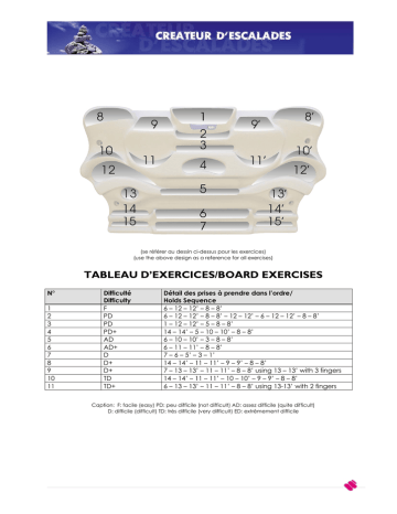 (se référer au dessin ci-dessus pour les exercices) (use the above design as a reference for all exercises) TABLEAU D’EXERCICES/BOARD EXERCISES N° 1 2 3 4 5 6 7 8 9 10 11 Difficulté Difficulty F PD PD PD+ AD AD+ D D+ D+ TD TD+ Détail des prises à prendre dans l’ordre/ Holds Sequence 6 – 12 – 12’ – 8 – 8’ 6 – 12 – 12’ – 8 – 8’ – 12 – 12’ – 6 – 12 – 12’ – 8 – 8’ 1 – 12 – 12’ – 5 – 8 – 8’ 14 – 14’ – 5 – 10 – 10’ – 8 – 8’ 6 – 10 – 10’ – 3 – 8 – 8’ 6 – 11 – 11’ – 8 – 8’ 7 – 6 – 5’ – 3 – 1’ 14 – 14’ – 11 – 11’ – 9 – 9’ – 8 – 8’ 7 – 13 – 13’ – 11 – 11’ – 8 – 8’ using 13 – 13’ with 3 fingers 14 – 14’ – 11 – 11’ – 10 – 10’ – 9 – 9’ – 8 – 8’ 6 – 13 – 13’ – 11 – 11’ – 8 – 8’ using 13-13’ with 2 fingers Caption: F: facile (easy) PD: peu difficile (not difficult) AD: assez difficile (quite difficult) D: difficile (difficult) TD: très difficile (very difficult) ED: extrêmement difficile TRAINING BOARD BY THE PETIT BROTHERS Programme dÊentraînement Training program Version française English version Manuel d’utilisation de l’agrès TRAINING BOARD Merci d’avoir acheté TRAINING BOARD une poutres d’entraînement développer par Arnaud et François Petit. Conseils généraux Les séances de poutre sont un bon complément de l’entraînement. Si vous êtes débutant cet agrès vous permettra de vous améliorer et d’obtenir vite et facilement des résultats. Si vous êtes déjà un bon grimpeur un entraînement sur poutre pourra combler certaines de vos lacunes. Bien entendu, quel que soit votre niveau un entraînement sur poutre seul ne suffit pas, il faut l’insérer dans un programme d’entraînement plus régulier en SAE (difficulté ou bloc), falaise, foncier… Installez TRAINING BOARD dans un endroit sec ni trop chaud, ni trop froid. Le bon emplacement : au-dessus d’une porte ou d’une poutre ; l’idéal étant d’avoir de la place au-dessus pour ne pas s’assommer au plafond à chaque traction. Veillez aussi à ce que l’agrès ne soit pas trop bas (ce n’est pas bien pratique de faire des tractions et des suspensions avec les genoux qui touchent le sol). La hauteur idéale ? Vous devez atteindre le milieu de l’agrès quand vos pieds sont au sol. Installation terminée ! Vous voulez l’essayer ? attention, pas tout de suite. Pensez d’abord à l’échauffement. Eh oui, la poutre fait partie de ces agrès barbares avec lesquels il est facile de se blesser. Faites tout d’abord un échauffement général (footing, mouvements généraux : cou, épaules, coudes, poignets, doigts, dos, puis quelques étirements) suivi d’un échauffement spécifique (utilisez pour cela les meilleures préhensions de TRAINING BOARD pour habituer votre organisme à travailler… quelques tractions lentes, suspensions… attention, quelques… gardez-en un peu pour après !). Planifiez votre entraînement ! Comme il a été précisé précédemment, les séances de poutre sont de bons compléments d’un entraînement global. Il s’agit bien de compléments, alors n’hésitez pas à les intercaler avec des séances d’escalade qui elles, vous apporteront la motivation et les sensations. De plus, les séances de poutre sollicitent les doigts, il est donc prudent de ne pas les enchaîner. Quelques conseils de planification : en-vue d’une progression, il faut travailler les filières courtes et aller progressivement sur les filières longues au fil des entraînements tout en variant le plus possible les exercices. Vous êtes fatigués ? Favorisez la quantité (ou le volume) à l’intensité (difficulté des mouvements), vous éviterez ainsi les blessures. Les exercices TRAINING BOARD permet de travailler les différentes filières énergétiques exploitées en escalade : force, résistance et continuité ; et grâce à ses préhensions variées vous utiliserez divers groupes musculaires. Les trois types d’exercices de base sur une poutre sont : les tractions, les suspensions et les déplacements (montés/descentes), et ce pour chaque filière. Voici quelques exercices pour chacune des filières. FIXING INSTRUCTIONS Please find following instructions for the fixing of your Training Board. We can only give you recommendations since we do not know exactly your support (type, origin, age, kind of assembly, quality…). Please refer to the instructions from the bolts manufacturer or your local hardware store. Bolts Drilling Length of Screws Diameter Drilling Adapter Sleeve M8 with resin 14 mm *SPIT CMIX *FISCHER FIP *SPITNYI, 8 bolt *FISCHER, S 8 8 mm >55 mm Adapter Sleeve Refer to bolt M8 with resin manufacturer’s and screen notice *SPIT SATELLIS *FISCHER FIP Fixing by drilling thru Fixing on wood Solid concret Solid brick Solid block Hard rock Hollow block Hollow brick Wood >18 mm Kind of Support Remarks 2 CHC 8x70 Expand the screws hole in the board to diameter 9 ☺☺☺☺ 2 CHC 8x40 With a concrete drill and drilling machine Screw wood profile ☺ Cuttered head 2 6x100 2 6x70 2 CHC 8x70 2 CHC 8x40 ☺ Drilling thru: *4 threaded stems M6 *8 hexagonal nuts M6 *4 steel washers *1 plywood panel 65 x 30 cm thickness >15 mm 2 VBA 6x50 2 VBA 6x80 ☺☺ ☺ ☺ = OK = NO ENTRE-PRISES: Z.I. DE TIRE-POIX – 38660 ST. VINCENT DE MERCUZE, France TEL : 33 (0) 4 76 08 53 76 FAX : 33 (0) 4 76 08 55 56 WEB-SITE : www.entre-prises.com 2. The minute contract exercise for 30 seconds then take a rest for 30 seconds. Do this ten times in a row. Exercise: • hanging on 6: 30 seconds • rest for 30 seconds • pull-ups on 8 – 8’: 30 seconds • rest for 30 seconds • hanging on 10 – 10’: 30 seconds • rest for 30 seconds • pull-ups on 12 – 12’: 30 seconds 3. Pull-ups per minute Test: choose 2 holds (eg: 8 –8’) and do the maximum number of pull-ups you can in one minute. 