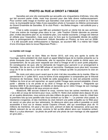 PHOTO de RUE et DROIT à l’IMAGE Sarcelles est une vile cosmopolite qui accueille une cinquantaine d’ethnies. Une ville qui fait souvent parler d’elle, mais trop souvent pour des faits divers malheureusement. Pour contrer cette image et montrer que Sarcelles c’est avant tout un endroit où il fait bon vivre, la municipalité lance l’idée d’une exposition photo à l’occasion du 50ème anniversaire du Grand Ensemble de Sarcelles. Et le club Photo « les Belles Images » est sollicité pour y participer. C’est à cette occasion que MB son président fournit un cliché tiré de ses archives. C’est une scène de mariage prise dans la rue : jolie Traction Citroën décorée au premier plan, invités deuxième plan et, au troisième plan, une mariée souriante. L’image est retenue et utilisée pour l’exposition, mais aussi pour le livre que la municipalité décide de publier dans le prolongement de l’évènement. Intitulé Sarcelles en Photos, ce livre sort en 2008. « Il a été accueilli avec enthousiasme à l’époque, se souvient MB. Il a même fait l’objet d’une chronique dans la revue Réponses Photo » La mariée voit rouge Jusque-là tout va bien. Mais en février 2013, soit cinq ans après la sortie de l’ouvrage, notre président de club reçoit un appel téléphonique de la mariée présente sur la photo évoquée plus haut. Véhémente, elle lui reproche d’avoir publié le cliché sans son consentement, de ne pas avoir respecté son droit à l’image et de lui avoir porté préjudice. En conséquence de quoi, elle lui demande de l’argent pour parvenir à un arrangement à l’amiable. Sûr de son bon droit MB refuse et raccroche. Quelques jours plus tard, nouveau coup de fil de la dame. Le ton se durcit : elle lui indique qu’elle va poursuivre le club en justice. Six mois vont alors courir avant que le club n’ait des nouvelles de la mariée. Elles lui parviennent le 11 juillet 2013, sous la forme d’une assignation à comparaître par le tribunal d’instance de Gonesse. Dans le libellé de cette assignation, le club est présenté comme l’éditeur du livre et se voit reprocher, en ayant publié l’image sans accord préalable, d’avoir porté « atteinte à la vie privée et au droit à l’image de la plaignante ». Plaignante qui réclame 3000 € de dommages et intérêts et demande qu’on retire l’image de son mariage des livres déjà diffusés et de ceux encore en stock. Abasourdi, MB accuse d’abord le coup, comme tous les autres membres du club. « Ça a été un coup de tonnerre pour nous, confie-t’il. Notre club existait alors depuis 42 ans et, en quatre décennies, nous avions pris des milliers de gens en photo, mais là, c’était bien la première fois qu’une pareille tuile nous tombait sur la tête ! ». Le premier choc passé, la résistance s’organise, et des membres du club mènent une petite enquête sur le Web pour en savoir un peu plus sur leur adversaire. Ils découvre alors que celle-ci possède un profil accessible à tous sur le réseau social Copains d’Avant, site qui revendique plus de 15 millions de membres. On peut y lire ses nom, prénom et date de naissance, ainsi que des détails relevant de sa vie privée, comme le fait qu’elle attend alors son troisième enfant. Mais il y a plus étonnant : sa photo de profil est une photo de son mariage où elle apparaît en gros plan… Droit à l’image CV, d’après Réponses Photo n° 272 1/5 Droit à l’information contre droit à l’image L’avocat du club Photo, maître NB, se servira de ces découvertes dans les conclusions qu’il livre avant l’audience, initialement prévue le 30 janvier 2014 (à noter que l’avocate pratiquant le droit de la photographie, Joëlle Verbrugge, a prêté main forte dans cette affaire). Il va aussi faire valoir que l’éditeur du livre est la Ville de Sarcelles et non le club Photo, et que la demande de la mariée est de ce fait irrecevable. Enfin, il va opposer les principes de droit à l’information et de la liberté d’expression artistique. Il explique que ces derniers ne peuvent être limités que dans certaines circonstances : Lorsque la photo est contraire à la dignité. Ce n’est pas le cas ici. Lorsque la personne représentée n’est pas directement liée au sujet évoqué. Ce n’est pas le cas non plus, l’image du mariage ayant bien été prise à Sarcelles et témoignant effectivement de la vie dans la ville. Lorsque la publication de l’image litigieuse a entraîné des conséquences d’une particulière gravité. Sur ce point, le plaignant doit démontrer l’existence et l’étendue du préjudice, ce que notre mariée n’est pas en mesure de faire, même si elle précise que la photo lui a causé un préjudice moral en raison de son statut d’ancienne fonctionnaire de Sarcelles. Face à ces conclusions l’avocat de la mariée demande le report de l’audience et tente de persuader sa cliente d’abandonner les poursuites. Mais elle persiste et signe en décidant d’attaquer le club en tant que « fournisseur d’images », ce qui est recevable. L’audience a finalement lieu le 12 juin 2014 et le jugement rendu le 24 juillet. Comme on pouvait s’y attendre, il est favorable au club « les Belles Images », la plaignante ayant été déboutée de toutes ses demandes et même condamnée à verser 300 € à la partie adverse. Ajoutons qu’il est rendu « en dernier ressort », ce qui signifie qu’il ne peut pas faire l’objet d’un appel. Il deviendra définitif à l’expiration du délai de pourvoi en cassation (2 mois), c’est à dire le 25 septembre. « Ce qui est intéressant ici, c’est que la décision est fortement motivée, commente maître NB. Sur le fond, la décision est heureuse et rassurante pour tous ceux dont la photographie de rue est le métier ou la passion. Elle pose avec beaucoup de clarté et beaucoup de force les principes qui s’appliquent à la f