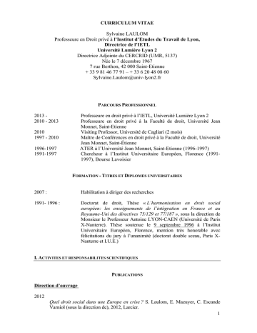 CURRICULUM VITAE Sylvaine LAULOM Professeure en Droit privé à l’Institut d’Etudes du Travail de Lyon, Directrice de l’IETL Université Lumière Lyon 2 Directrice Adjointe du CERCRID (UMR, 5137) Née le 7 décembre 1967 7 rue Berthon, 42 000 Saint-Etienne + 33 9 81 46 77 91 – + 33 6 20 48 08 60 [email protected] PARCOURS PROFESSIONNEL 2013 2010 - 2013 Professeure en droit privé à l’IETL, Université Lumière Lyon 2 Professeure en droit privé à la Faculté de droit, Université Jean Monnet, Saint-Etienne Visiting Professor, Université de Cagliari (2 mois) Maître de Conférences en droit privé à la Faculté de droit, Université Jean Monnet, Saint-Étienne ATER à l’Université Jean Monnet, Saint-Etienne (1996-1997) Chercheur à l’Institut Universitaire Européen, Florence (19911997), Bourse Lavoisier 2010 1997 - 2010 1996-1997 1991-1997 FORMATION - TITRES ET DIPLOMES UNIVERSITAIRES 2007 : Habilitation à diriger des recherches 1991- 1996 : Doctorat de droit, Thèse « L’harmonisation en droit social européen: les enseignements de l’intégration en France et au Royaume-Uni des directives 75/129 et 77/187 », sous la direction de Monsieur le Professeur Antoine LYON-CAEN (Université de Paris X-Nanterre). Thèse soutenue le 9 septembre 1996 à l’Institut Universitaire Européen, Florence, mention très honorable avec félicitations du jury à l’unanimité (doctorat double sceau, Paris XNanterre et I.U.E.) I. ACTIVITES ET RESPONSABILITES SCIENTIFIQUES PUBLICATIONS Direction d’ouvrage 2012 Quel droit social dans une Europe en crise ? S. Laulom, E. Mazuyer, C. Escande Varniol (sous la direction de), 2012, Larcier. 1 2005 La recomposition des systèmes de représentation des salariés en Europe, Sous la direction de S. Laulom, Presses Universitaires de Saint-Étienne, 2005, 324 p. Articles, études et notes 2014 Editeur du numéro spécial, Which Securities for workers in times of crisis ?, 2014, European Labour Law Journal n°3-4. Dans ce numéro, « Dismissal Law under challenge : new risks for workers », pp 231-254. S. Laulom and A. Lo Faro, « Remedies for Unlawful Collective Actions in France, Belgium, Italy and Spain », International Journal of Comparative Labour Law and Industrial Relations, 2014-3, pp. 273-291 « Actualité du droit social de l’Union européenne », Semaine Sociale Lamy, 2014, supplément n° 1640, pp. 1-71. « La réception par la Cour de cassation française des décisions des instances non juridictionnelles des organisations internationales », Revue comparée de droit du travail et de la sécurité sociale, 2014-1, pp. 58-68. « Les droits du travail européens face à la crise », ERA Forum, Journal of the Academy of European Law, 2014, pp. 325-336. « Le Comité européen des droits sociaux condamne la jurisprudence Laval », Semaine Sociale Lamy, n° 1616, p. 5-7. « Une interprétation de la Charte préjudiciable aux droits des salariés », Semaine Sociale Lamy, 2013, n° 1611 2013 « Actualité du droit social de l’Union européenne », Semaine Sociale Lamy, 29 avril 2013, n° 1582. « Cosa resta del contratto unico ? », Rivista Giuridica del Lavoro, 2013-3. « Une première reconnaissance d’une discrimination indirecte fondée sur le sexe » (Cass. Soc. 6 juin 2012, n° 10-21489, publié au bulletin), in Chr. Panorama Droit et Genre, Dalloz, 2013, p. 2143. « L’influence des normes européennes sur la jurisprudence sociale », in Les rencontres de la Chambre sociale, Bulletin d’information de la Cour de cassation, 2012 n° 768, pp. 14-22. « Le rôle de l’Union européenne dans le raisonnement judiciaire », in P. Deumier (sous la direction de), Le raisonnement juridique, Recherche sur les travaux préparatoires des arrêts, Dalloz, coll. Thème et commentaire, 2013, p. 187. « Les droits sociaux fondamentaux, rempart des déconstructions des droits du travail », Revue de droit du travail, 2013, p. 410. « Effectuation du droit » ; « Lois NRE et Loi Grenelle I et II », in N. Postel et R. Soebl (dir.), Dictionnaire critique de la RSE, Presses Universitaires du Septentrion, 2013, pp. 146-149 et 294-298. 2012 « L’influence des normes européennes sur la jurisprudence sociale », in Les rencontres de la Chambre sociale, Bulletin d’information de la Cour de cassation, n° 768, pp. 14-22 « Actualité du droit social de l’Union européenne », Semaine Sociale Lamy, Supplément, n° 1531, 2012, 68 p. « Quelle valeur pour le droit au congé annuel payé ? La CJUE botte en touche », Semaine Sociale Lamy, n° 1525. 2 « La saga du calcul des seuils d’effectif », Semaine Sociale Lamy, n° 1535, pp. 710. « Les dangereuses évolutions du droit social dans une Europe en crise », Droit ouvrier, fév. 2012, pp. 99-103 « Le droit des restructurations dans l’Union européenne », Droit ouvrier, 2012, pp. 420-426. « La directive 2008/104 : avancées et limites de la protection des travailleurs intérimaires », Revue de droit du travail, 2012, pp. 99-103. « The French System of Employee Representation at the enterprise » in R. Blanpain, H. Ankakubo, T. Araki, (eds), System of Employee representation at the Enterprise : a comparative Study , Bulletin of Comparative Labour Relations n° 81, pp. 51-71. « Le rôle de l'Union européenne dans la transformation des modes de représentation à partir de l'expérience comparée (UK, Italie, France) », in M.-A. Moreau (sous la direction de), La représentation collectives des travailleurs, ses transformations à la lumière du droit comparé, Dalloz coll. Thème et Commentaire, pp. 113-141. 2011 « El papel de la Unión Europea en la transformación de las formas de representación de los trabajadores a partir de la experiencia comparada (Reino Unido, Italia y Francia) », Dereito, n°20-12, 2011, pp. 7-41. « Il diritto del lavoro francese di fronte alla crisi », in G. Loy (a cura di), Diritto del lavoro e crisi economica, Ediesse, 2011, pp. 141-167. « Towards 