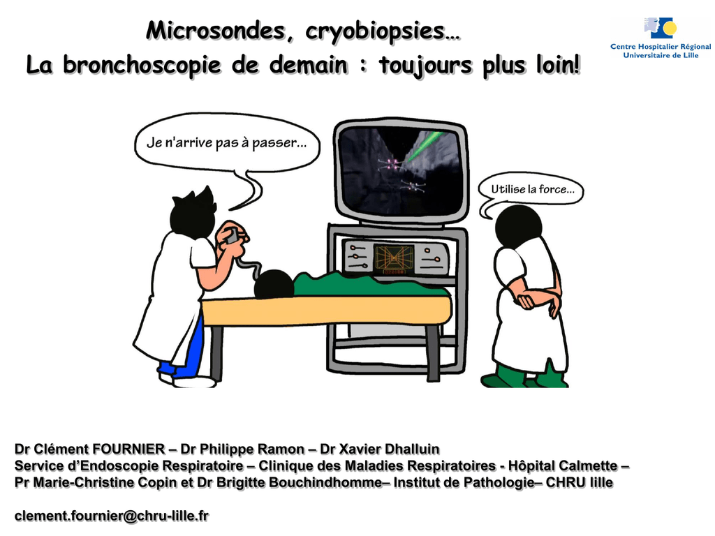Microsondes, cryobiopsies… La bronchoscopie de demain : toujours plus loin! Dr Clément FOURNIER – Dr Philippe Ramon – Dr Xavier Dhalluin Service d’Endoscopie Respiratoire – Clinique des Maladies Respiratoires - Hôpital Calmette – Pr Marie-Christine Copin et Dr Brigitte Bouchindhomme– Institut de Pathologie– CHRU lille [email protected] Conflits d’intérêt • Clément Fournier déclare avoir perçu des honoraires ou financements pour participation à des congrès, actions de formation de la part de la société Olympus France, des Laboratoires Astrazeneca, GSK, Almirall, Boehringer-Ingelheim, Mundipharma, MSD, ALK, Intermune, Novartis, Boston Scientific. • Clément Fournier déclare avoir participé ou participe à des essais thérapeutiques et études cliniques dont la promotion était assurée par Actelion, Boehringer-Ingelheim, Intermune, Novartis, Bayer, Gilead, Holaira, Chiesi, et a à ce titre perçu des honoraires ou financements hospitaliers pour la recherche. Plan Non exhaustif, trop de choses à dire… • Actualités en Bronchoscopie diagnostique • Généralités - Formation • Le Médiastin = Echoendoscopie and Co’ • Lésions périphériques (Nodules) • Le Futur… quelques nouveautés à venir Généralités Bronchoscopes à usage unique Enorme intérêt pour la bronchoscopie souple urgente de réanimation, de chirurgie, d’anesthésie… Bronchoscopes Jetables 200-250 euros / pièce (HT) Comparaison des coûts (CHU Lille – 3 bronchoscopes souples Pentax 15BS) 100 actes par an : 489 euros / acte 150 actes par an : 340 euros / acte 200 actes par an : 265 euros / acte 250 actes par an : 220 euros / acte Pas très écolo…? Actualités en bronchoscopie Formation = la Simulation Bronchoscopie souple de base Internes de pneumologie Anesthésistes Réanimateurs Echoendoscopie Internes de pneumologie Pneumologues Simulation en Pneumologie Simulateur Simulateur CRYOBIOPSIES Hetzel J and Col. ERJ 2012;39:685-690 Etude prospective, Multicentrique, randomisée, simple aveugle - Dg de cancers 563 patients avec cancers randomisés dans 8 centres : 281 biopsies standards – 282 cryobiopsies Rendement Dg = 85.1% versus 95% (p< 0.001) Même incidence de saignement Cryobiopsies transbronchiques Intérêts dans les PID? Remplacer les Biopsies transbronchiques standards? Remplacer les biopsies pulmonaires chirurgicales? Cryobiopsies transbronchiques Intérêts dans les PID? Remplacer les biopsies pulmonaires chirurgicales? CRYOBIOPSIES Pajares and col. Diagnostic yield of transbronchial cryobiopsy in Interstitial Lung Disease : A randomized Trial. Respirology 2014 CRYOBIOPSIES Pajares and col. Diagnostic yield of transbronchial cryobiopsy in Interstitial Lung Disease : A randomized Trial. Respirology 2014 CRYOBIOPSIES Kropski J and col. Bronchoscopic Cryobiopsy for the Diagnosis of Diffuse Parenchymal Lung Disease. Plos One 2013 Etude rétrospective 25 patients, sous AG Taille moyenne biopsies 64 mm2 (BTB 5-15 mm2) Dg chez 19 patients, un patient avec parenchyme normal qui exclu une pathologie; Donc rentabilité Dg 80% - Pas de PNO et d’hémoptysie CRYOBIOPSIES Kropski J and col. Bronchoscopic Cryobiopsy for the Diagnosis of Diffuse Parenchymal Lung Disease. Plos One 2013 CRYOBIOPSIES Casoni G L and col. Transbronchial Lung Cryobiopsy in the Diagnosis of Fibrotic Interstitial Lung Diseases. Plos One 2014 Etude Prospective 69 patients – Sous AG avec Broncho Rigide Taille moyenne biopsies 43.11 mm2 (BTB 5-15 mm2) 68 patients avec biopsies « adéquates » (= parenchyme pulmonaire) 52 patients = anapath Ok pour définir un « pattern » spécifique : 36 UIP, 9 PINS, 2 DIP, 1 POC, 1 PCE, 1 DAD, 1 PHS, 1 bronchiolite folliculaire 19 PNO (28%) dont 14 nécessitant un drain - 1 décès 7 jours après la biopsie pour EA FIP CRYOBIOPSIES Fruchter and col. Histological diagnosis of interstitial lung diseases by cryo-transbronchial biopsy. Respirology 2014 Etude Prospective 75 patients sous sédation 70% patients avec biopsies « adéquates » (= parenchyme pulmonaire) 2 PNO sans drainage 3 Hémoptysies modérées (sérum glacé) CRYOBIOPSIES Pubmed CRYOBIOPSIES Ravaglia and col. Safety and Diagnostic Yield of Transbronchial Lung Cryobiopsy in Diffuse Parenchymal Lung Diseases: A Comparative Study versus Video-Assisted Thoracoscopic Lung Biopsy and a Systematic Review of the Litterature. Respiration 2016 Etude Rétrospective 447 cas 297 patients CryoBTB (CBTB) - 150 patients Biopsie Chirurgicale (BC) Durée Hospitalisation : 2,6 jours (CBTB) versus 6,1 jours (BC) p< 0,0001 Mortalité : 0,3% (CBTB) versus 2,7 % (BC) CBTB : 20,2% Pneumothorax / pas d’hémoptysie sévère « Diagnostic » : 82,8% (CBTB) versus 98,7 % (BC) p< 0,05 CRYOBIOPSIES Expérience Lilloise : 8 patients et un cochon… 1er patient raté (pas de biopsie…) 3 Pneumothorax 2 drainés (48h et 8 jours) 1 hémoptysie (fogarty 5 min = OK) Dg de certitude = pas évident (habitudes des anapath, apprentissage…) Nécessité de continuer pour rejoindre les résultats de la littérature Pour le plus grand bonheur de l’endoscopiste……. Actualités en bronchoscopie Le médiastin = Echoendoscopie bronchique avec ponction à l’aiguille (EBUSPTBA) Polémiques anciennes sur l’EBUS-PTBA Sous anesthésie générale ou sous sédation vigile et anesthésie locale? Etude randomisée EBUS-PTBA sous AG et Masque laryngé (75 patients) versus Sédation modérée (74 patients) (Sédation niveau 2 et utilisation midazolam et fentanyl) Anatomopathologistes en « aveugle » Pas de différence de rentabilité diagnostique Pas de différence de complications graves Dans les 2 groupes, la majorité des patients seraient prêts à refaire la procédure selon les mêmes modalités Randomized trial of Endobronchial Ultrasound-guided tranbronchial Needle Aspiration under general anesthesia versus moderate sedation . Casal R and col. AJRCCM 2015 Polémiques anciennes sur l’EBUS-PTBA 93 patients randomisés 49 sous s