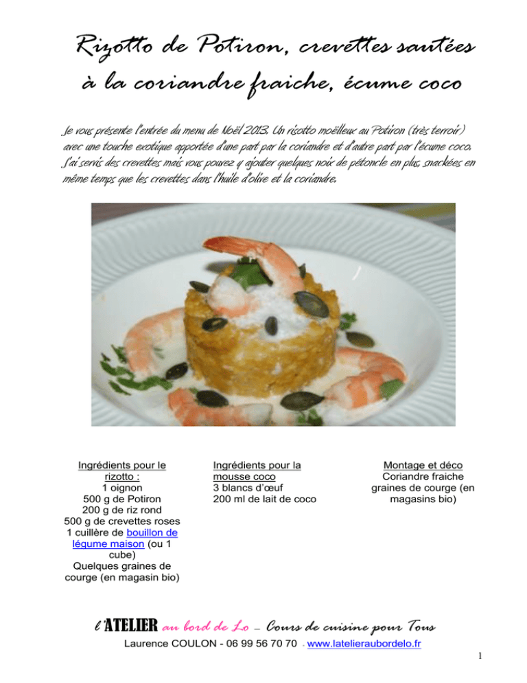 Rizotto de Potiron, crevettes sautées à la coriandre fraiche, écume coco Je vous présente l'entrée du menu de Noël 2013. Un risotto moëlleux au Potiron (très terroir) avec une touche exotique apportée d'une part par la coriandre et d'autre part par l'écume coco. J'ai servis des crevettes mais vous pouvez y ajouter quelques noix de pétoncle en plus, snackées en même temps que les crevettes dans l'huile d'olive et la coriandre. Ingrédients pour le rizotto : 1 oignon 500 g de Potiron 200 g de riz rond 500 g de crevettes roses 1 cuillère de bouillon de légume maison (ou 1 cube) Quelques graines de courge (en magasin bio) Ingrédients pour la mousse coco 3 blancs d’œuf 200 ml de lait de coco Montage et déco Coriandre fraiche graines de courge (en magasins bio) l’ATELIER au bord de Lo – Cours de cuisine pour Tous Laurence COULON - 06 99 56 70 70 - www.latelieraubordelo.fr 1 Bouillon de crevette Commencer par étêter les crevettes. Mettre les têtes dans le bol de Mister T, ajouter de l’eau jusqu’à ¾ de litre, 1/2 c à café de gros sel aux herbes et faire cuire 10 mn à 100° vitesse 1. A l’arrêt de la minuterie, mixer 10 sec vitesse 4 et filtrer le jus à travers le panier de cuisson, posé sur votre couvercle Mister T dans un bol et réserver. Le rizotto Pendant que le bouillon se prépare : décortiquer les crevettes en conservant quelques crevettes avec la queue pour la présentation et réserver Eplucher un oignon Préparer 500 g de potiron Quand le bouillon est terminé et filtré, rincer rapidement le bol, Mettre l’oignon et hacher 3 sec vit 5. Ajouter un filet d’huile d’olive et faire suer 5 mn à 100° en mijotage. Ajouter alors le Potiron, hacher 5 sec vitesse 5 Peser et ajouter le riz, 500 g de bouillon de crevette et une c à soupe de bouillon de légume maison (voir recettes blog, rubrique « petits plus ») Programmer 15 à 20 mn à varoma en mijotage et en sens inverse. (voir temps de cuisson sur le paquet) A la sonnerie, le rizotto semble encore très souple mais le riz continue sa cuisson et le rizotto épaissit en refroidissant. écume coco : Monter 3 blancs d’œufs en neige avec le fouet 2 mn vitesse 3.5 / 4. A l’aide d’une spatule, rabaisser les blancs et ajouter le lait de coco et mélanger vitesse 2 ou 3. Il faut "casser" les blancs pour obtenir une mousse liquide, une écume. Montage : Réchauffer le rizotto au micro-onde au dernier moment Poêler les crevettes dans un peu d'huile avec la coriandre ciselée. Au centre d’une assiette creuse, déposer une belle cuillère de rizotto ou encore mieux le dresser dans un cercle inox. Retirer le cercle. Déposer l'écume coco autour, 4 à 5 crevettes, une crevette avec sa queue en hauteur sur le risotto, quelques graines de courge tout autour et terminer avec un peu de mousse coco sur le dessus du rizotto. Terminer par un tour de moulin à poivre au dessus de chaque assiette. Encore mieux : Faites griller les graines de courges à sec dans une poêle anti-adhérente. C'est encore meilleur ! A noter : Si vous souhaitez servir ce rizotto directement en fin de cuisson, il sera plus crémeux. Dans ce cas il est préférable de le servir dans une grande verrine remplie à demi ou dans le creux d'une assiette. Le moulage en cercle sera impossible. l’ATELIER au bord de Lo – Cours de cuisine pour Tous Laurence COULON - 06 99 56 70 70 - www.latelieraubordelo.fr 2